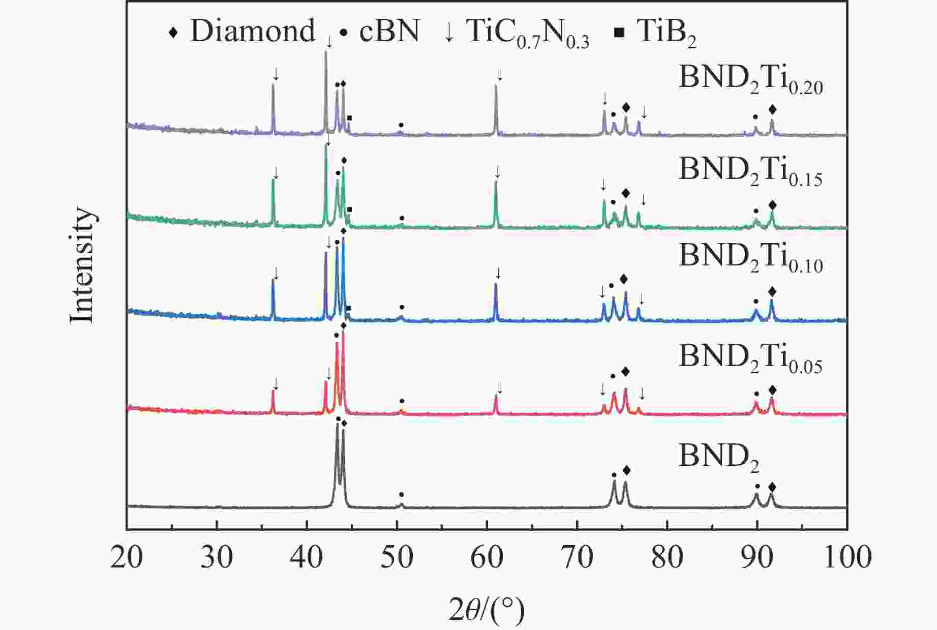 • 图  不同Ti含量下金刚石-Ti-cBN烧结样品(12 GPa、2000 ℃)的XRD谱