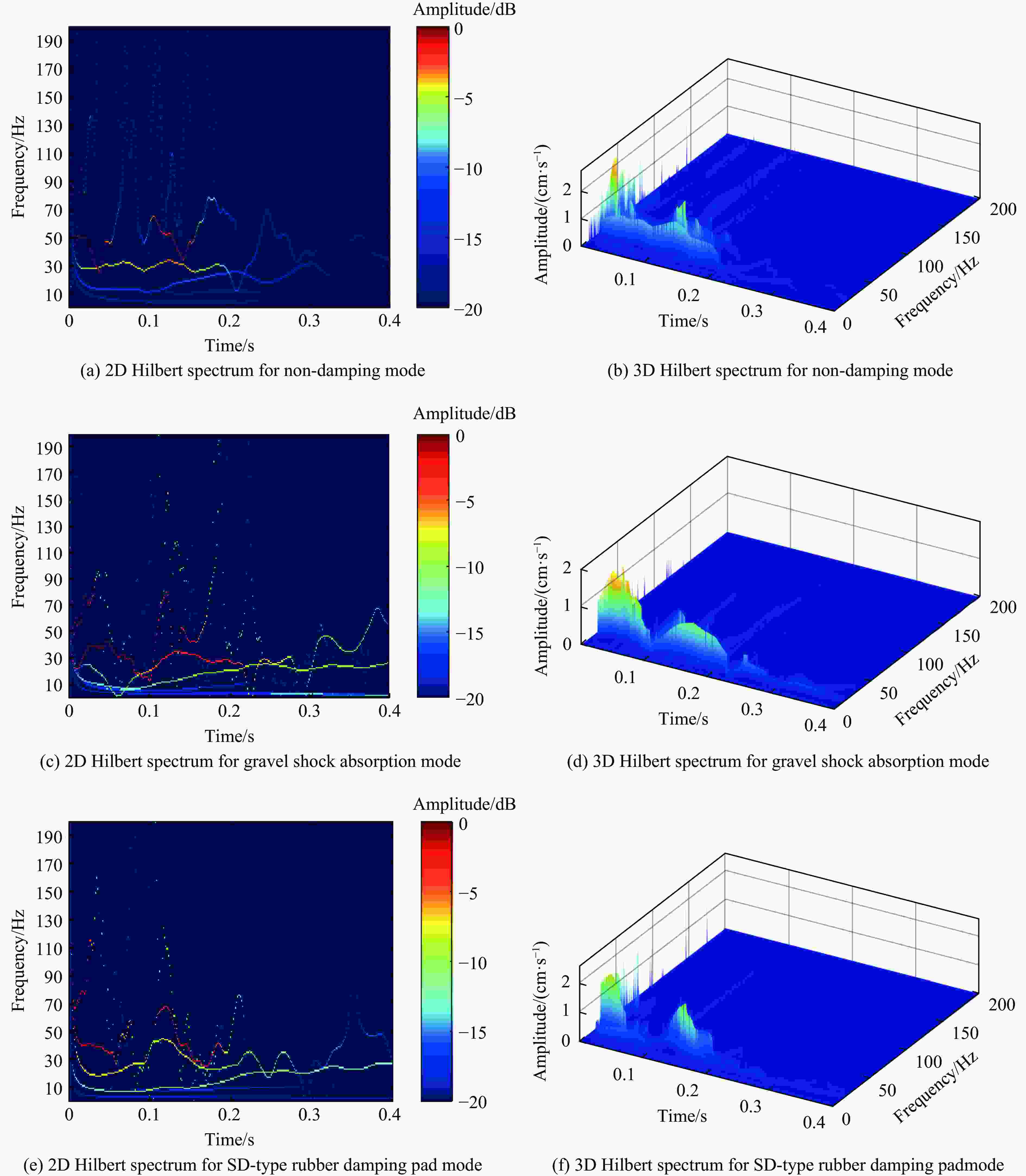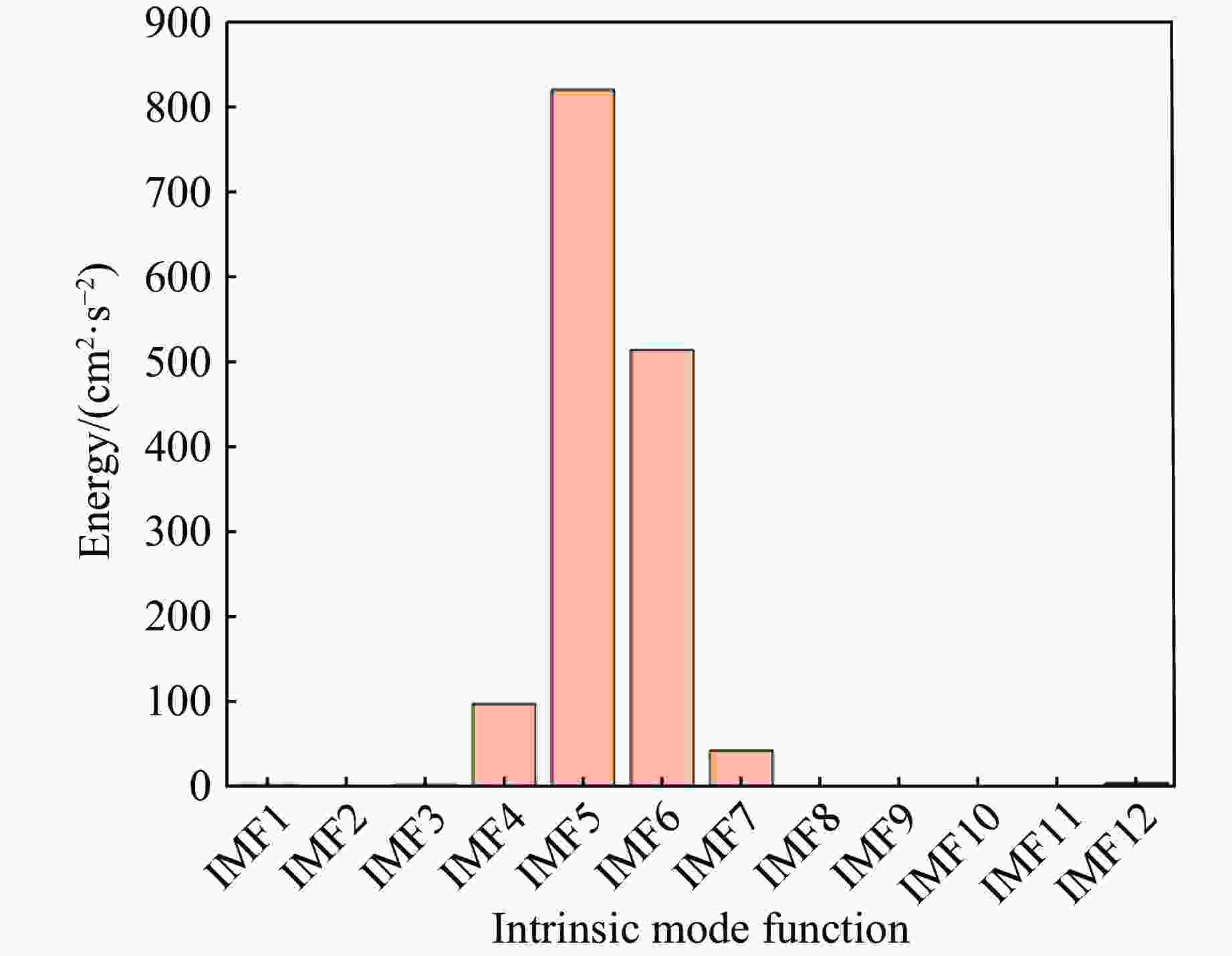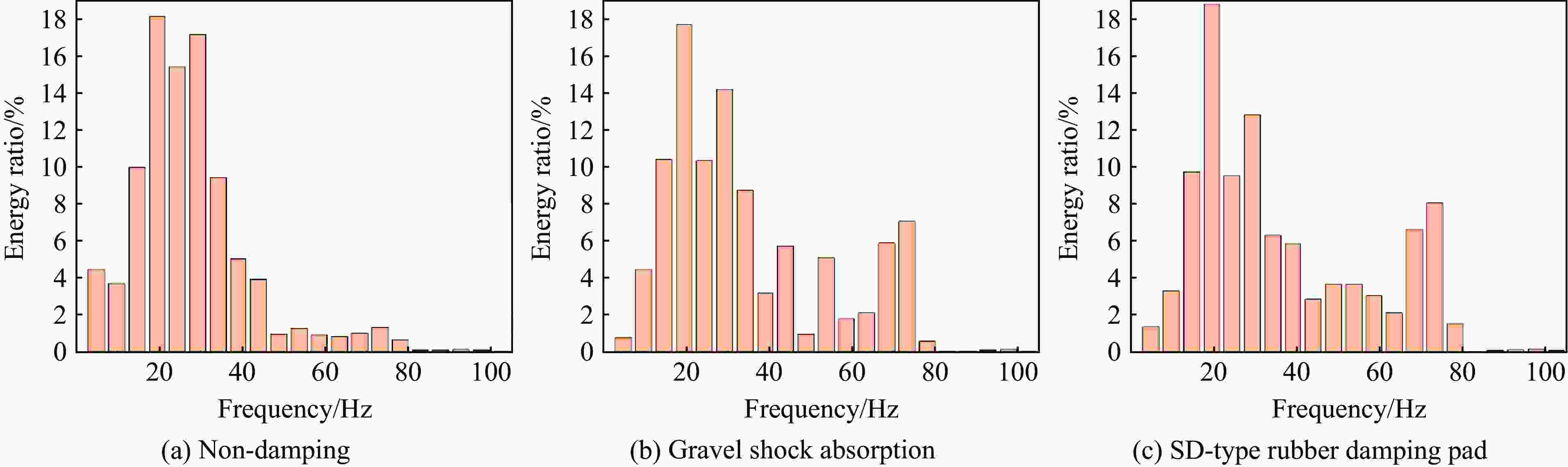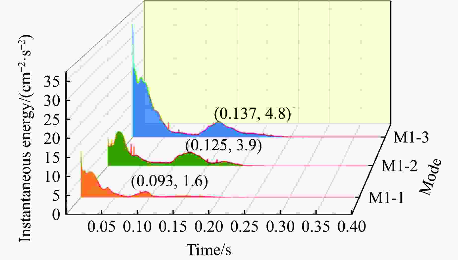 Test mode Damping material Test No. Charge weight/g PPV/(cm∙s-1) l=2 m l=3 m l=4 m l=5 m l=6 m Ⅰ Non-damping M1-1 1 1.31 2.81 1.28 1.08 0.98 M1-2 2 2.35 3.81 1.98 1.62 1.53 M1-3 3 3.00 4.59 2.38 2.08 1.87 Ⅱ Gravel M2-1 1 1.14 1.32 0.93 0.78 0.67 M2-2 2 1.94 2.35 1.72 1.46 1.15 M2-3 3 2.54 3.13 2.35 1.88 1.43 Ⅲ SD-type rubber damping pad M3-1 1 1.43 1.60 0.75 0.60 0.64 M3-2 2 2.69 2.72 1.20 1.16 1.03 M3-3 3 2.81 3.76 1.72 1.34 1.15 表 3 水池爆破振动信号的总能量