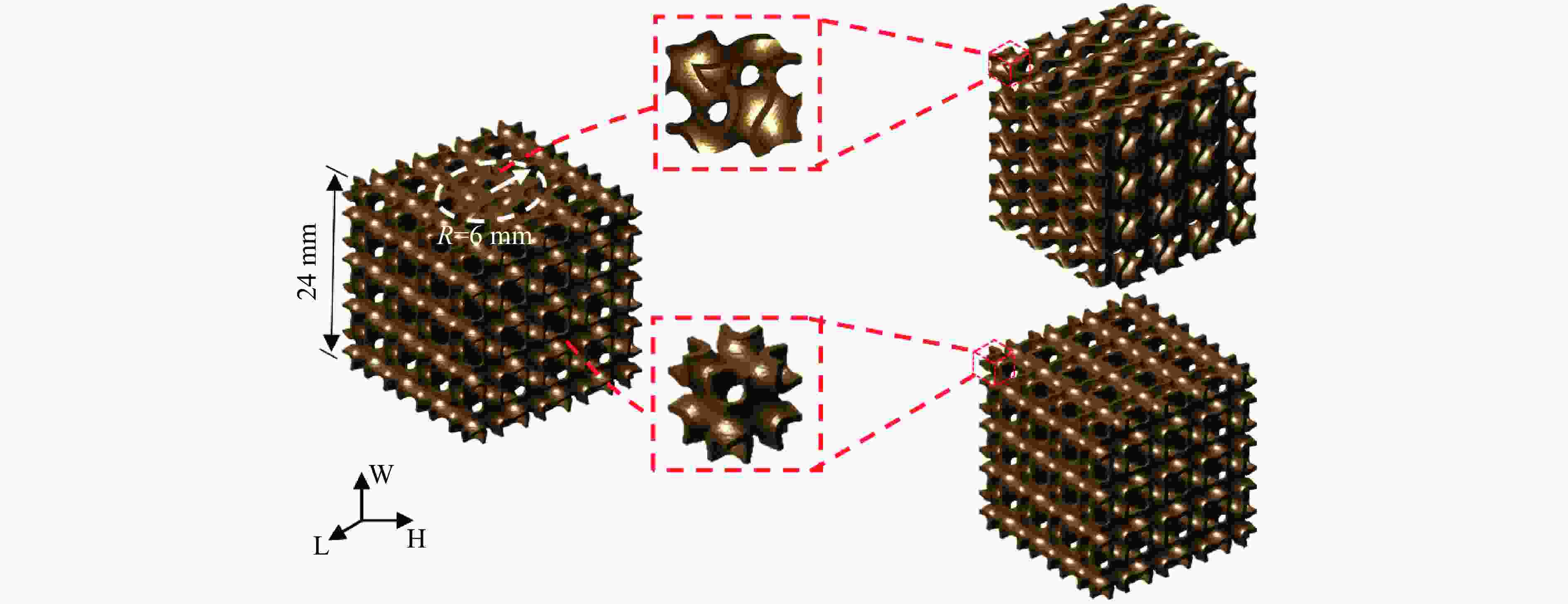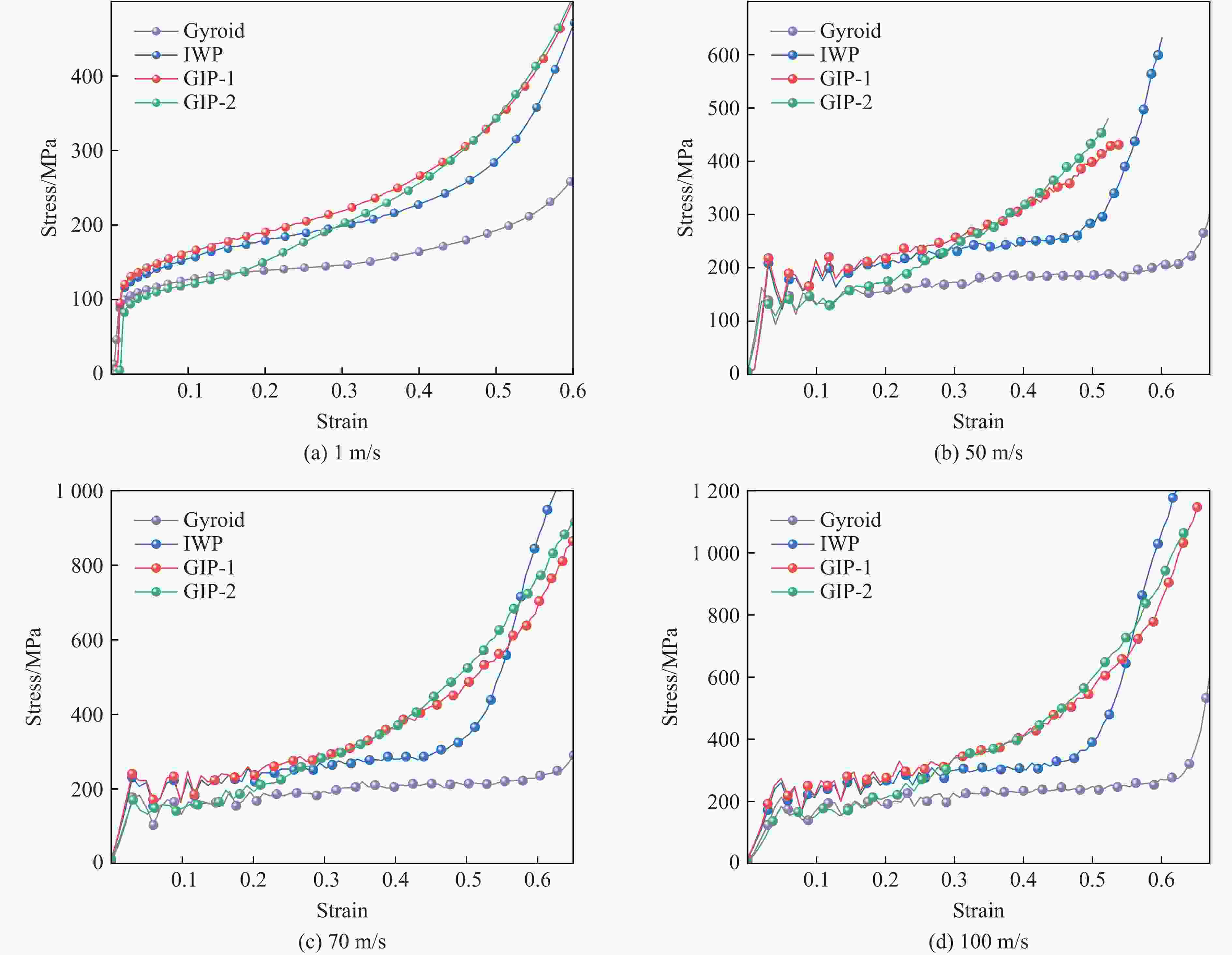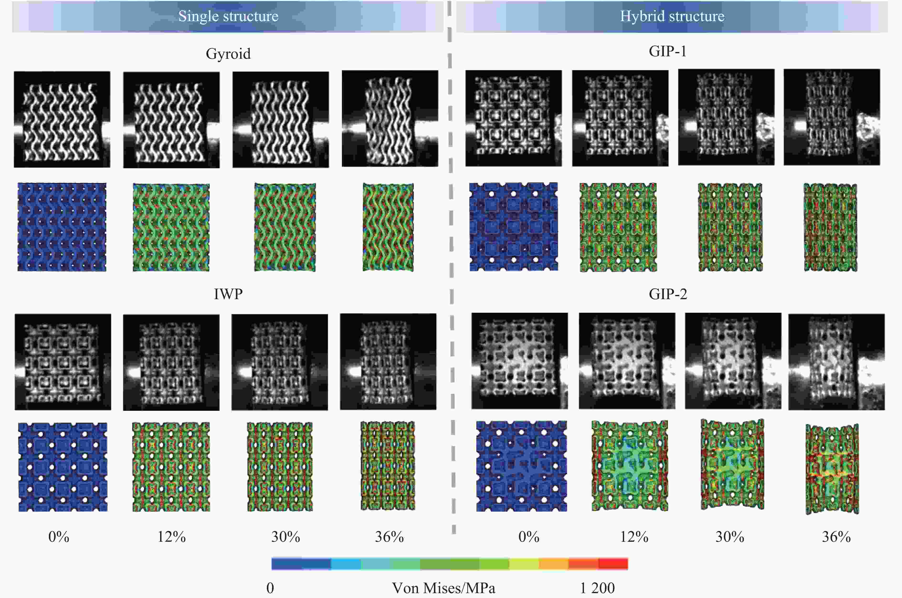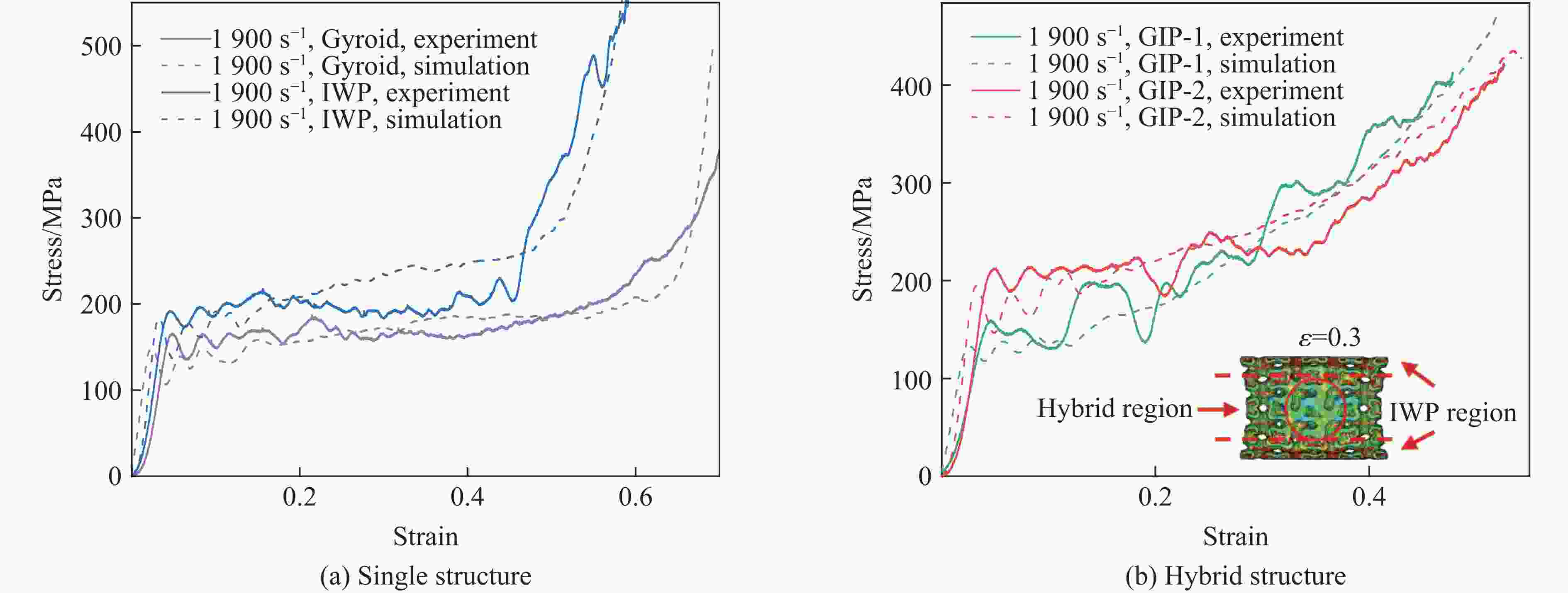 摘要: 三周期极小曲面(triply periodic minimal surface,TPMS)结构材料作为一种高孔隙率和高能量吸收效率的多孔介质,在许多领域得到广泛应用。以Gyroid和IWP结构作为设计基元,利用Sigmoid函数构建圆柱形过渡层,将外层IWP结构与内层Gyroid结构连接,设计了内外嵌套的GIP混合胞元结构。通过选择性激光熔融技术打印了Gyroid结构、IWP结构和GIP混合结构试样,并利用直撞式霍普金森杆对其进行了实验研究。结合LS-DYNA软件进行了更大冲击速度范围的数值模拟,分析了试件的变形演化过程和动态应力-应变关系。结果表明:结构的初始峰值应力和比吸能表现出不同程度的应变率敏感性。与Gyroid和IWP结构相比,GIP混合结构材料的应力-应变曲线表现出更明显的应变硬化趋势和更强的能量吸收能力。相较于GIP-1结构(冲击方向与圆柱形过渡层轴线方向相同),随着冲击速度的提高,GIP-2结构(冲击方向与圆柱形过渡层轴线方向垂直)具有更低的初始峰值应力和更大的比吸能,因而具有更优异的抗冲击性能。Abstract: Triply periodic minimal surface (TPMS) structural material is widely used in many fields as a porous medium with high porosity and high energy absorption efficiency. In this paper, the Gyroid and IWP structures were used as the design elements, and the Sigmoid function was used to construct the cylindrical transition layer. The outer IWP structure was connected with the inner Gyroid structure, hence the inner and outer nested GIP hybrid cellular structure was designed. Gyroid structure, IWP structure and GIP hybrid structure samples were printed by selective laser melting technology, and the experimental study was performed by direct impact Hopkinson bar. Combined with LS-DYNA software, the numerical simulation of larger impact velocity range was carried out, and the deformation evolution process as well as dynamic stress-strain relationship of the specimen were analyzed. The results show that the initial peak stress and specific energy absorption of the structure present different strain rate sensitivity. Compared with Gyroid and IWP structures, the stress-strain curves of GIP hybrid structural materials exhibit more obvious strain hardening trend and stronger energy absorption capacity. With the increase in impact velocity, the GIP-2 structure (the impact direction is perpendicular to the axis direction of the cylindrical transition layer) presents lower initial peak stress and larger specific energy absorption than the GIP-1 structure (the impact direction is the same as the axis direction of the cylindrical transition layer), which demonstrates its better impact resistance.