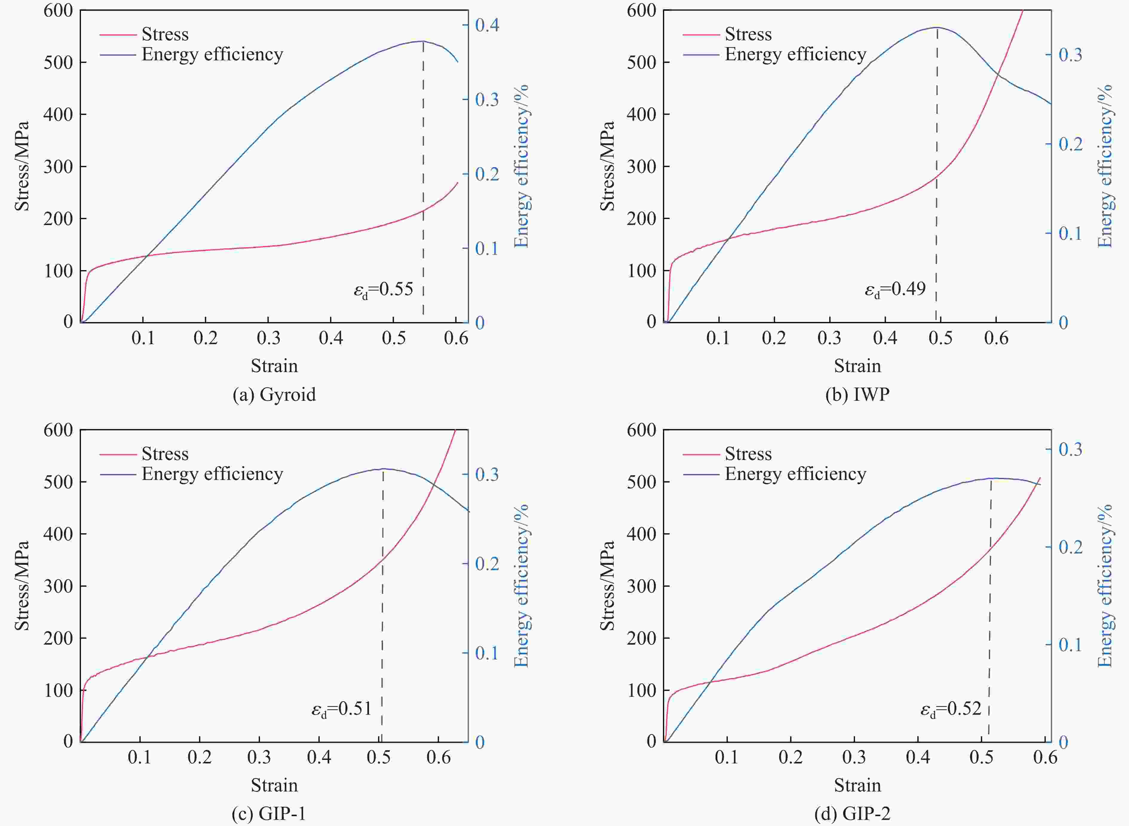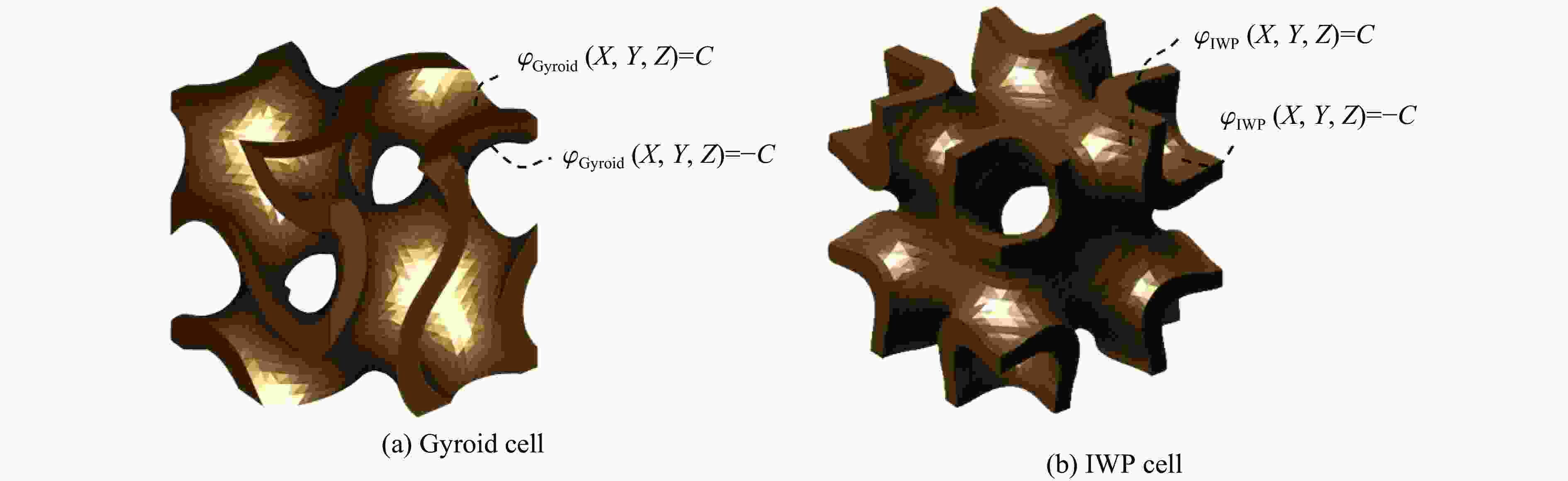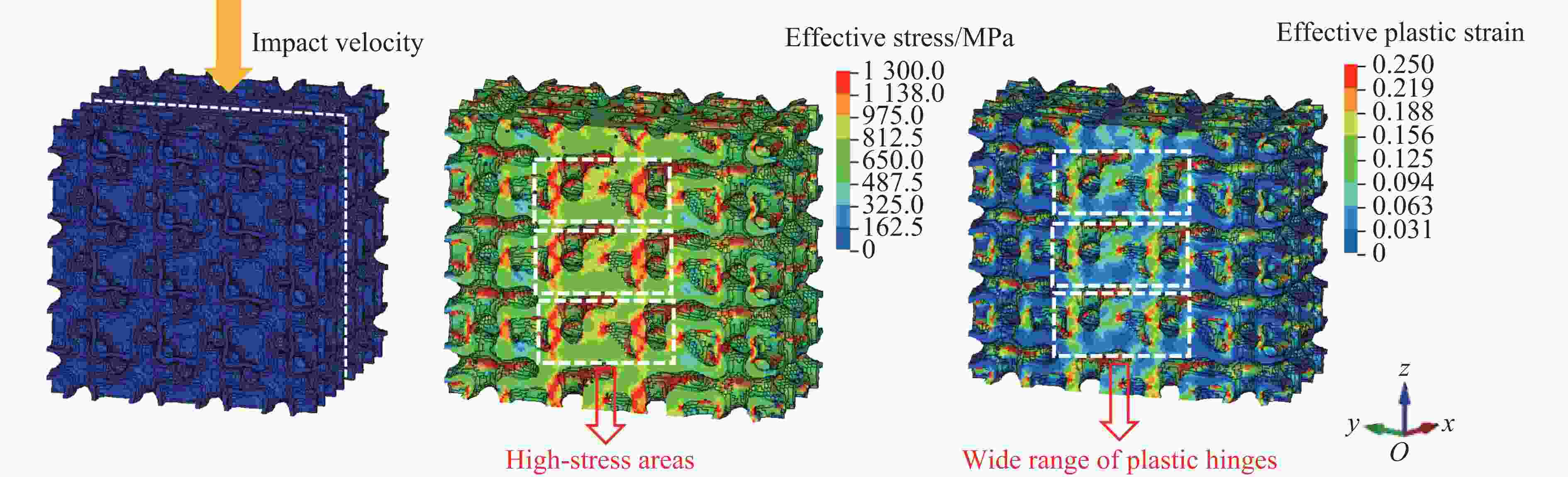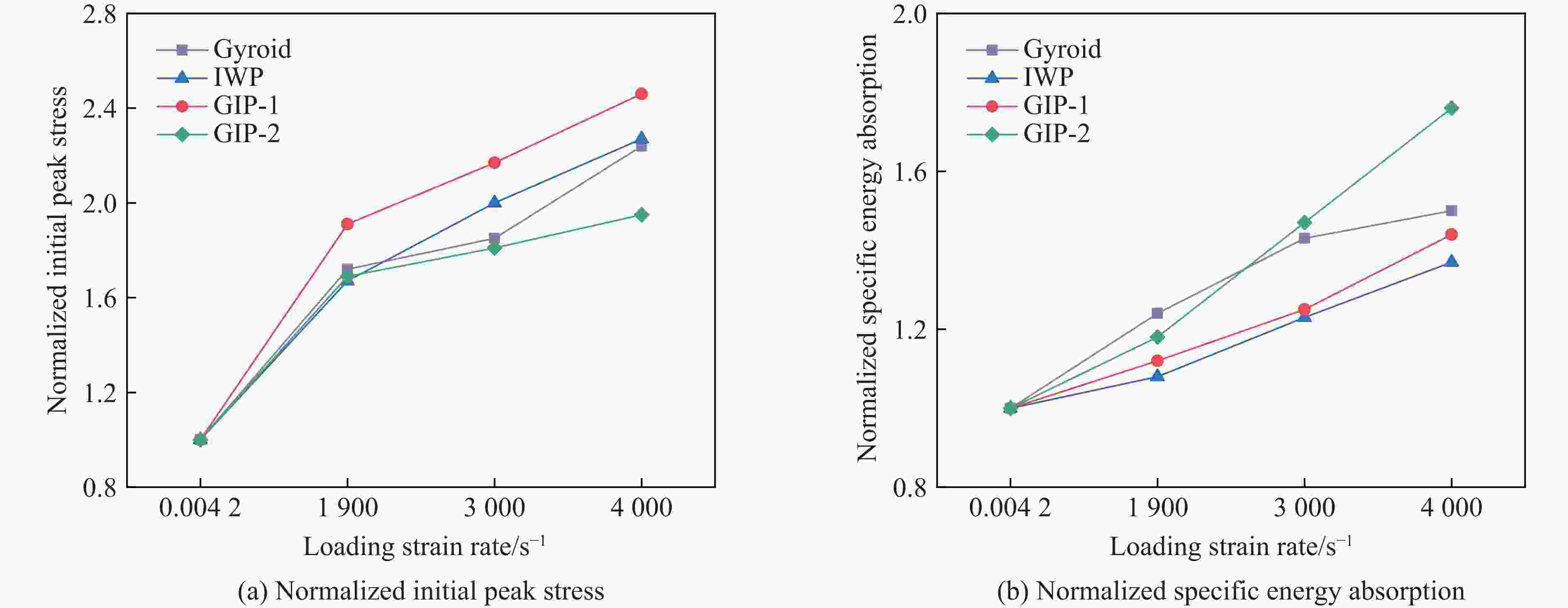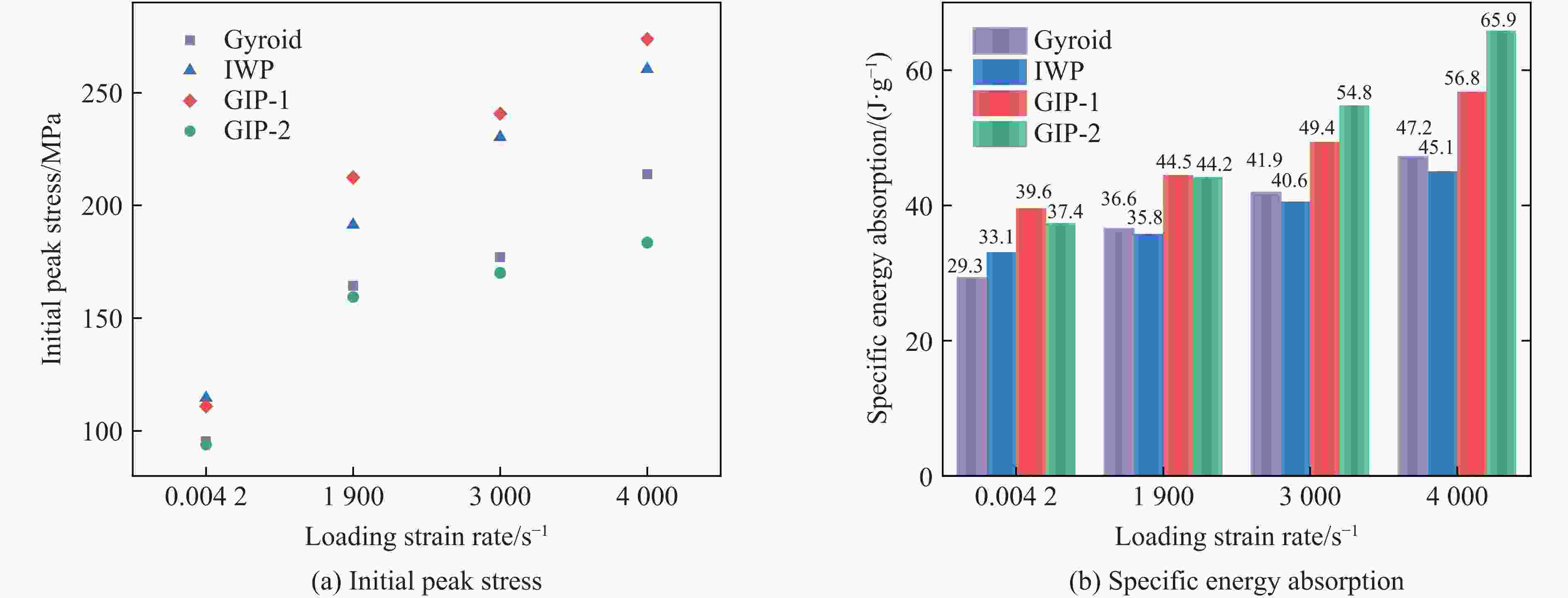 摘要: 三周期极小曲面(triply periodic minimal surface,TPMS)结构材料作为一种高孔隙率和高能量吸收效率的多孔介质,在许多领域得到广泛应用。以Gyroid和IWP结构作为设计基元,利用Sigmoid函数构建圆柱形过渡层,将外层IWP结构与内层Gyroid结构连接,设计了内外嵌套的GIP混合胞元结构。通过选择性激光熔融技术打印了Gyroid结构、IWP结构和GIP混合结构试样,并利用直撞式霍普金森杆对其进行了实验研究。结合LS-DYNA软件进行了更大冲击速度范围的数值模拟,分析了试件的变形演化过程和动态应力-应变关系。结果表明:结构的初始峰值应力和比吸能表现出不同程度的应变率敏感性。与Gyroid和IWP结构相比,GIP混合结构材料的应力-应变曲线表现出更明显的应变硬化趋势和更强的能量吸收能力。相较于GIP-1结构(冲击方向与圆柱形过渡层轴线方向相同),随着冲击速度的提高,GIP-2结构(冲击方向与圆柱形过渡层轴线方向垂直)具有更低的初始峰值应力和更大的比吸能,因而具有更优异的抗冲击性能。Abstract: Triply periodic minimal surface (TPMS) structural material is widely used in many fields as a porous medium with high porosity and high energy absorption efficiency. In this paper, the Gyroid and IWP structures were used as the design elements, and the Sigmoid function was used to construct the cylindrical transition layer. The outer IWP structure was connected with the inner Gyroid structure, hence the inner and outer nested GIP hybrid cellular structure was designed. Gyroid structure, IWP structure and GIP hybrid structure samples were printed by selective laser melting technology, and the experimental study was performed by direct impact Hopkinson bar. Combined with LS-DYNA software, the numerical simulation of larger impact velocity range was carried out, and the deformation evolution process as well as dynamic stress-strain relationship of the specimen were analyzed. The results show that the initial peak stress and specific energy absorption of the structure present different strain rate sensitivity. Compared with Gyroid and IWP structures, the stress-strain curves of GIP hybrid structural materials exhibit more obvious strain hardening trend and stronger energy absorption capacity. With the increase in impact velocity, the GIP-2 structure (the impact direction is perpendicular to the axis direction of the cylindrical transition layer) presents lower initial peak stress and larger specific energy absorption than the GIP-1 structure (the impact direction is the same as the axis direction of the cylindrical transition layer), which demonstrates its better impact resistance.