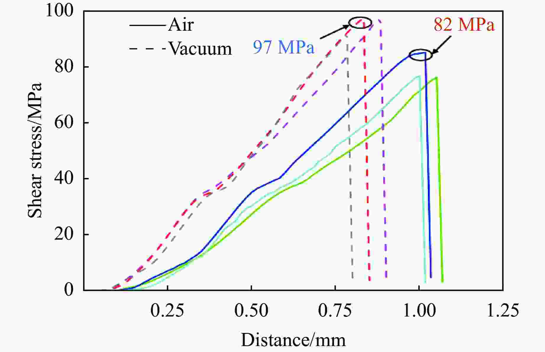 Experimental environment Shear strength/MPa 2 cm 6 cm 10 cm Air 60 82 71 Vacuum 68 96 83 -
