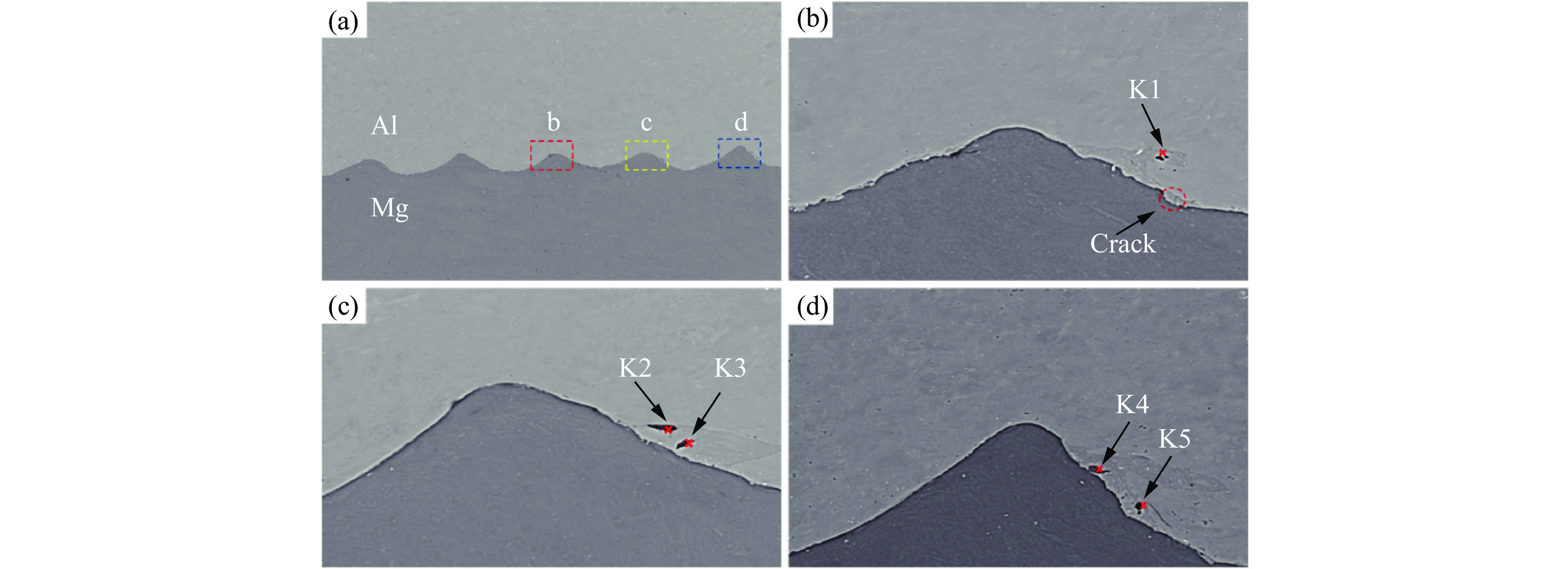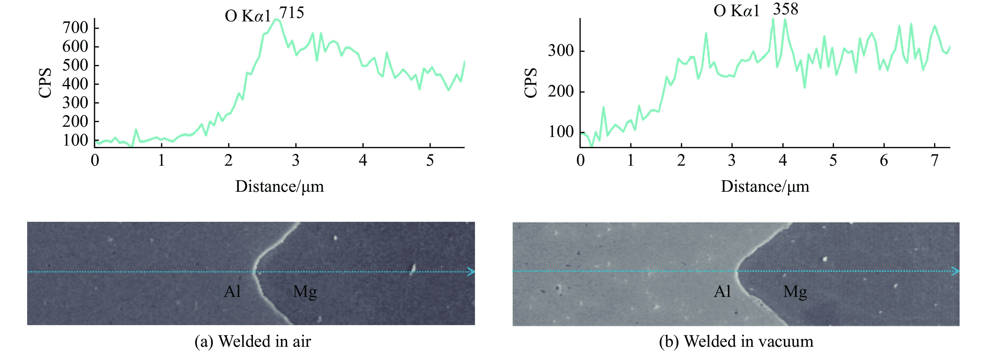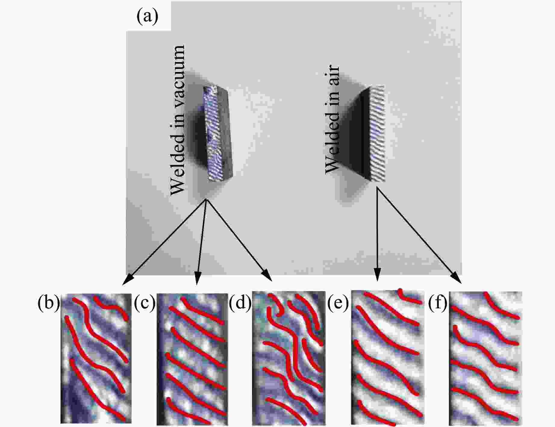 摘要: 镁合金和铝合金因具有较高的化学活性,在常规焊接方式下,其表面的氧化物会掺杂到焊接接头内,使得复合板的结合性能下降。为了提高Mg/Al复合板的结合强度,采用真空爆炸焊接法制备了Mg-AZ31B/Al-6061复合板,并与常规空气环境下制备的相同参数复合板进行了对比。通过光学显微镜、扫描电子显微镜、能谱仪以及万能试验机,对结合界面的微观形貌、元素分布和力学性能进行分析。结果表明:由于气体冲击波压力不同,真空环境下复合材料的界面形貌与空气环境下有很大区别;真空环境有效抑制了镁、铝2种金属氧化,在熔化区未检测到金属氧化物。此外,还观察到真空环境下试样的剪切强度和拉伸强度显著增大。因此,真空爆炸焊接对Mg/Al复合板性能的提升起到了重要作用,可以作为一种有效的金属焊接方法。Abstract: Oxides are prone to occur in welded joints by using of conventional welding methods due to high specific oxidation activity of magnesium and aluminum alloys, which leads to a decrease in the bonding performance of the composite plates. In order to improve the bonding strength of Mg-Al composite plates, Mg-AZ31B/Al-6061 composite plates were manufactured by vacuum explosive welding method, and compared with fabricating the same composite plates in air environment. The microstructure, elements distribution and mechanical properties of the interface were analyzed by optical microscope, scanning electron microscope, energy spectrometer and universal testing machine. The results show that the interfacial morphology of composites welded in vacuum environment is largely different from that in air environment due to the difference of gas shock pressure. The vacuum environment effectively inhibited the oxidation of magnesium and aluminum, and no metal oxides were detected in the melting zone. In addition, it was observed that the shear strength and tensile strength of the samples increased significantly under vacuum explosive welding. Therefore, vacuum explosive welding plays an important role in improving the performance of Mg/Al composite plates, and can be used as an high-performance metal welding method.