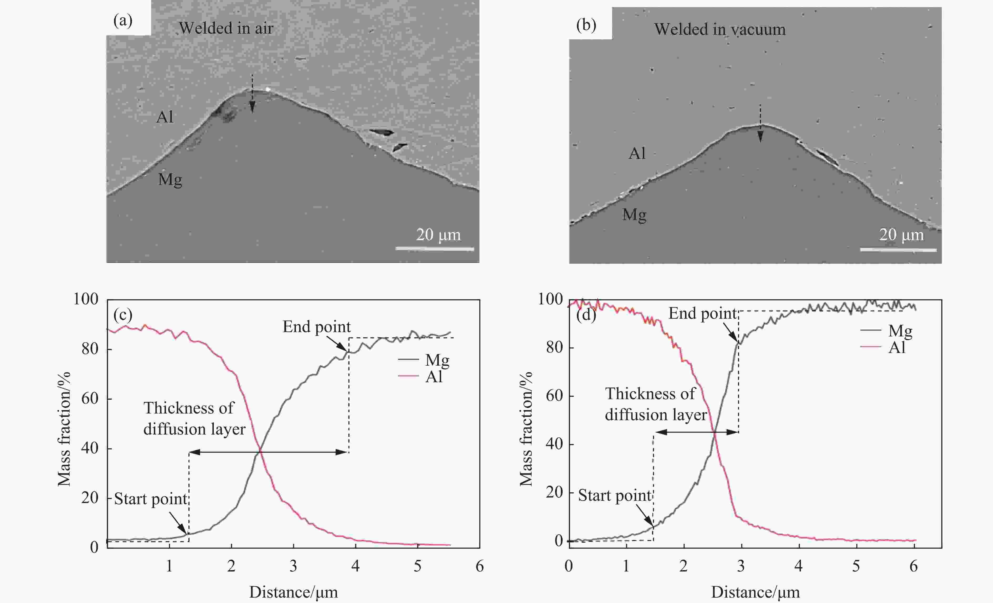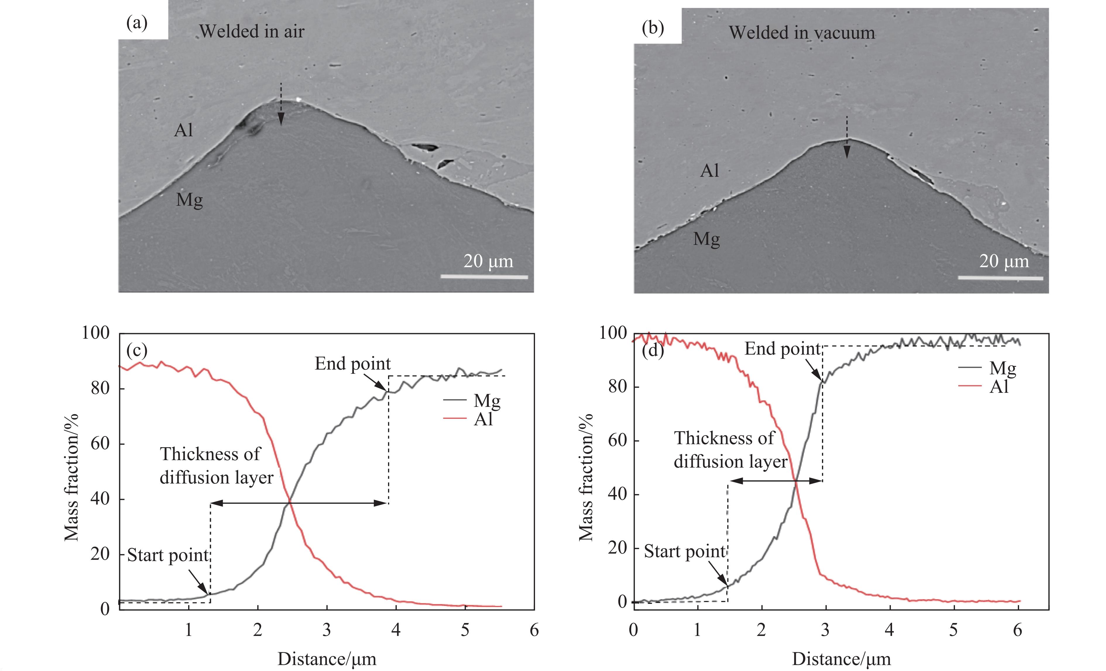 图 8 结合界面处的EDS线扫描结果:(a) 空气环境下的线扫描微观结构,(b) 真空环境下的线扫描微观结构,(c) 空气环境下的EDS线扫描界面分析,(d) 真空环境下的EDS线扫描界面分析