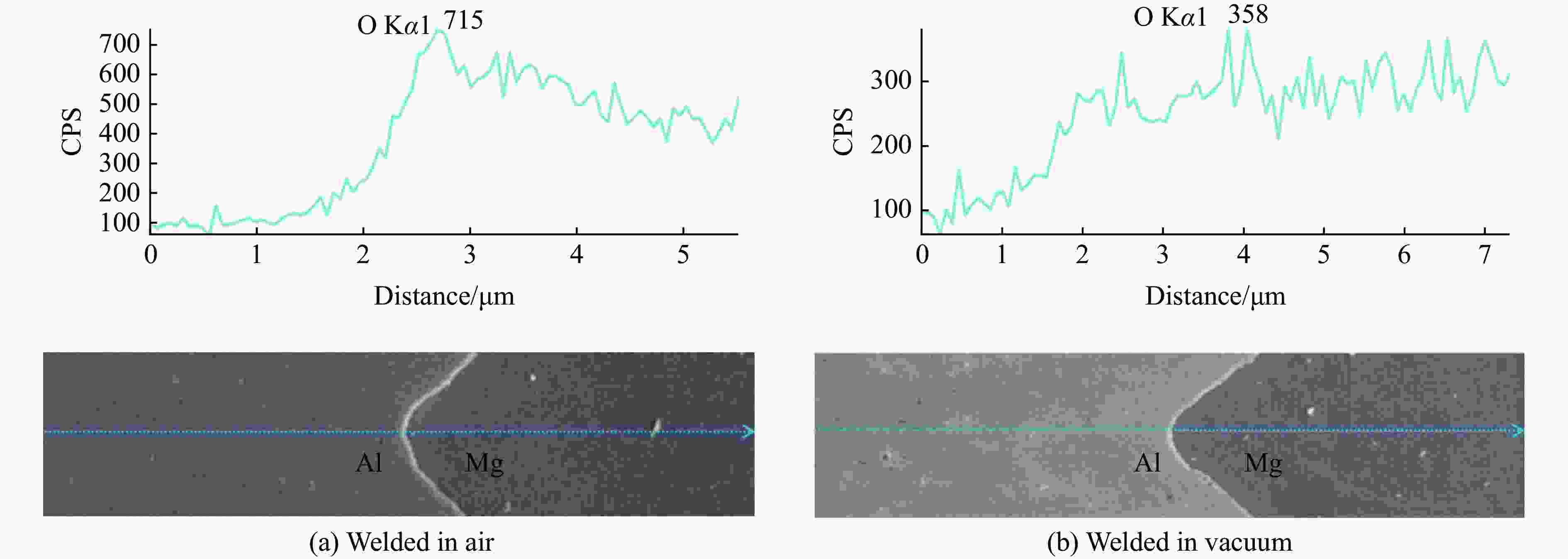 Figure 8. EDS line scanning results of interface: (a) scanning of microstructure in air environment; (b) scanning of microstructure in vacuum environment; (c) EDS line scan interface analysis in air environment; (d) EDS line scan interface analysis in vacuum environment