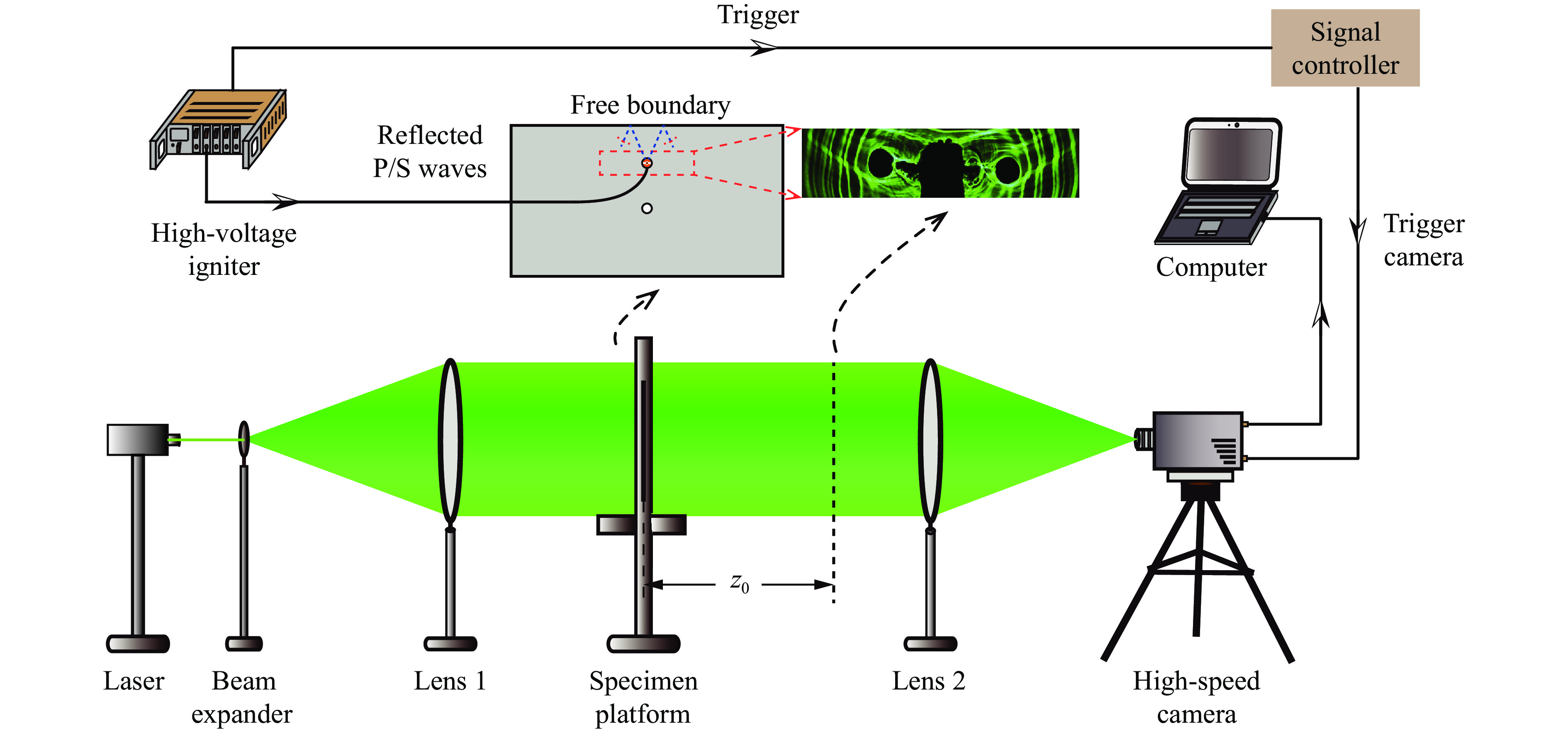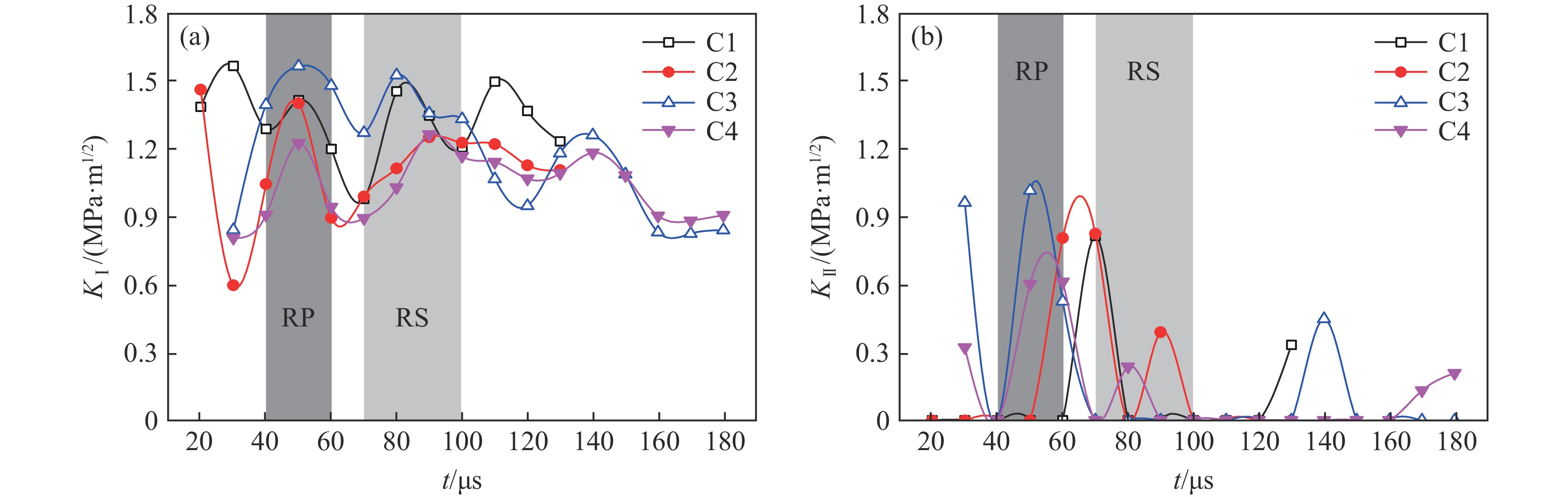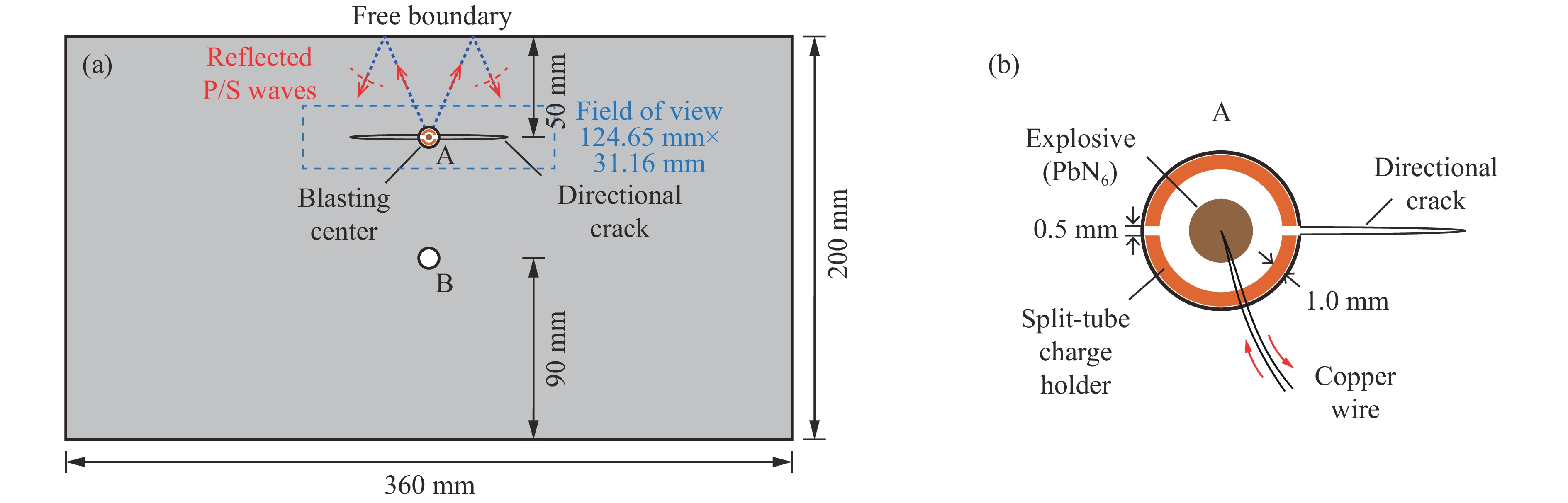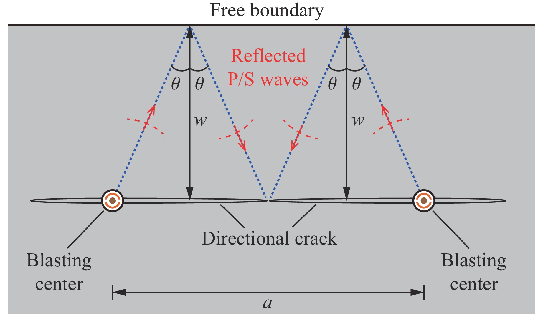 摘要: 天然岩体常含自由边界,对定向断裂爆破产生干扰。为探究自由边界对定向断裂爆破的影响,采用爆炸焦散线方法和高速摄影技术,研究了含自由边界时定向爆炸裂纹尖端的应力分布和扩展机理。自由边界的反射P/S波作用于定向爆炸裂纹,改变了裂尖应力分布,产生了“弧线形”裂纹扩展路径。定向爆炸裂纹扩展可分为3个阶段。(1) 反射波作用前:裂尖受爆生气体“气楔”作用,产生Ⅰ型断裂,并沿直线扩展。(2) 反射波作用时:反射P/S波均使裂尖受张拉-剪切作用,产生Ⅰ-Ⅱ复合型断裂,裂纹偏转趋向自由边界;在反射P波的作用下裂尖产生畸变焦散斑,裂尖应力由K场主导变为非K场主导,而在反射S波的作用下裂尖应力恢复为K场主导。(3) 反射波作用后:裂尖在惯性作用下恢复为Ⅰ型断裂,沿直线扩展。在明确反射P/S波对定向爆炸裂纹作用的基础上,推导了自由边界影响下定向断裂爆破炮孔间距的计算公式,可为精细化定向断裂爆破提供理论参考。Abstract: Natural rock masses often contain free boundaries, which can interfere with directional fracturing blasting. To investigate effects of free boundary on directional fracturing blasting, the caustics method and high-speed photography were used to study the crack-tip stress distribution and propagation of directional blast-induced cracks. The reflected P/S waves from the free boundary act on a directional blast-induced crack, and change the crack-tip stress distribution and generate an “arc shaped” crack path. Directional blast-induced crack propagation can be divided into three stages. Stage one: before the action of reflected waves, the crack tip is subjected to the action of a blast-induced gas wedge, resulting in a mode Ⅰ crack that propagates along a straight line. Stage two: under the action of reflected waves, both reflected P and S waves cause the crack tip to be subjected to tension and shear action, resulting in a mixed mode Ⅰ-Ⅱ crack which deflects towards the free boundary. Under reflected P waves, the crack tip produces distorted caustics, and crack-tip stress changes from K-dominated field to non-K-dominated field, while under reflected S waves, crack-tip stress returns to K-dominated field. Stage three: after the action of reflected waves, the crack tip is subjected to inertial action and then returns to a mode Ⅰ crack which propagates along a straight line. On the basis of clarifying effects of reflected P/S waves on the tip of directional blast-induced cracks, a calculation formula for the distance between two directional fracturing blasting holes under the influence of free boundary is derived, providing a theoretical basis for refined directional fracturing blasting.