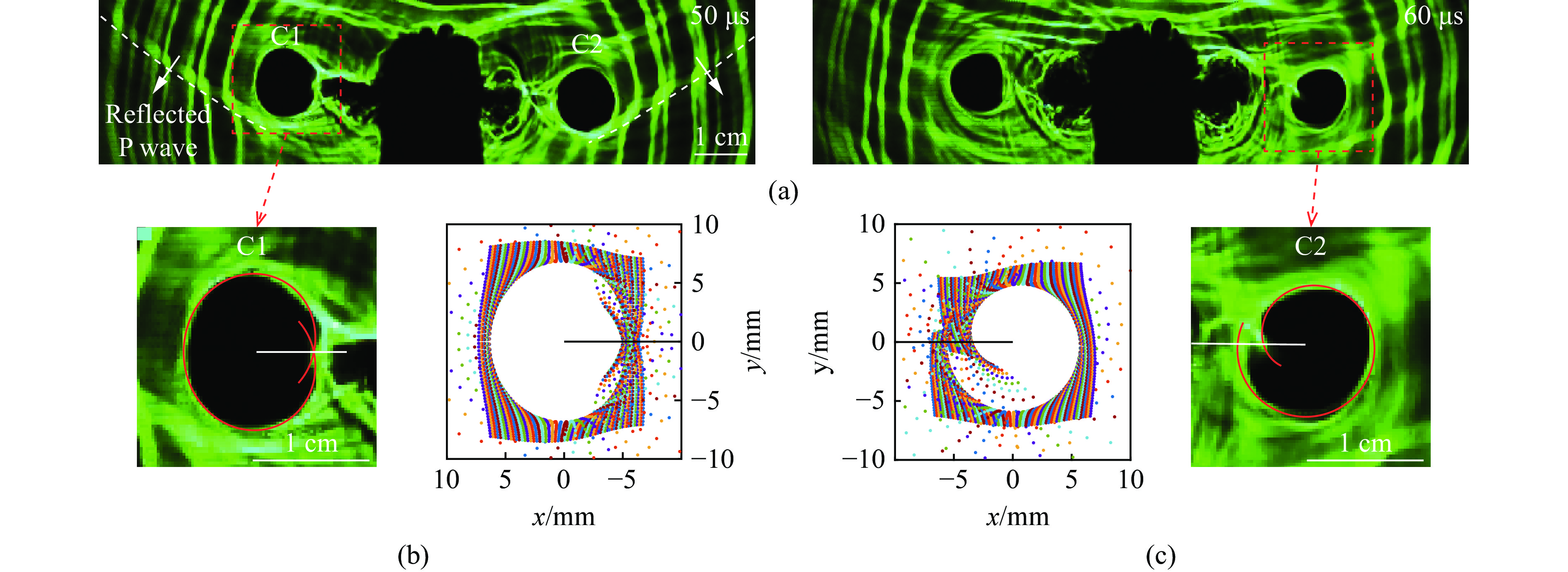Figure 7. Under action of reflected S wave: (a) blast-induced caustics patterns; (b) mixed Ⅰ-Ⅱ mode caustics pattern at the tip of crack C1 at 70 μs; (c) mixed Ⅰ-Ⅱ mode caustics pattern at the tip of crack C2 at 70 μs