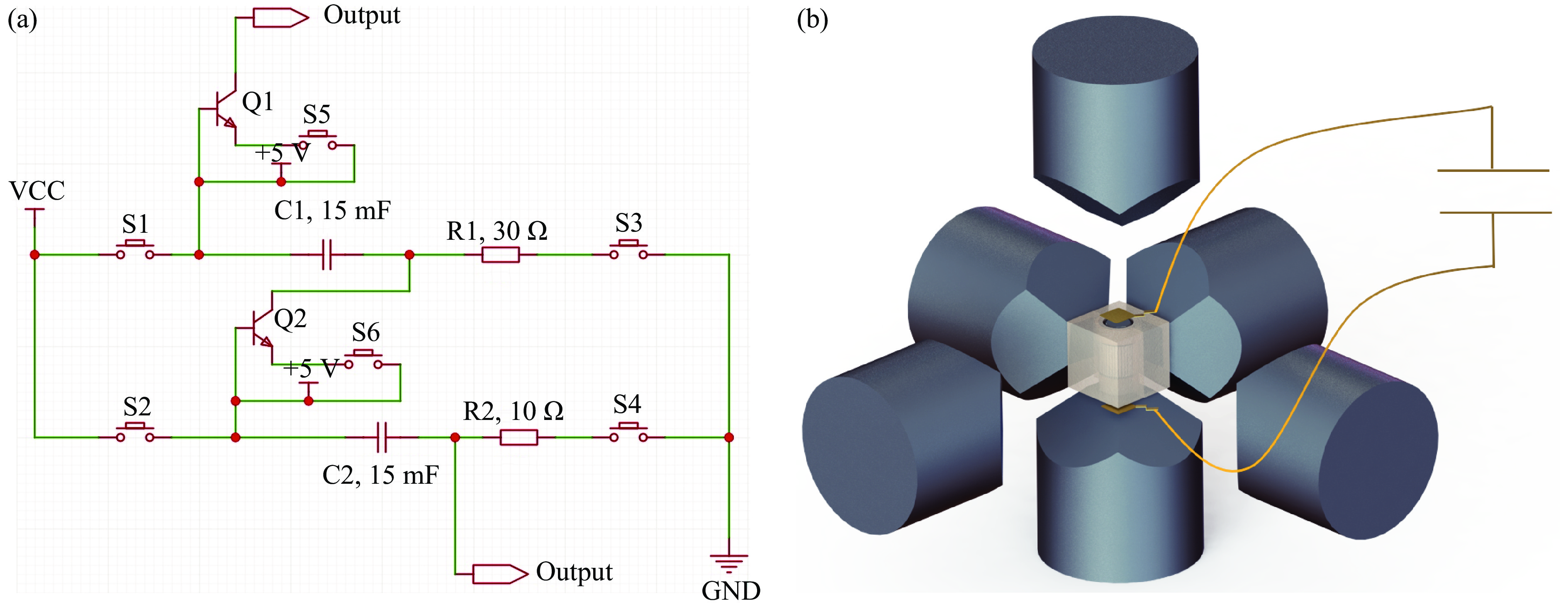图 1 瞬间放电装置内部电路 (a) 以及组装连接 (b) 示意图(使用10 AWG粗导线连接,并联的电容分为上级电容和下级电容,最大输出电压为1 kV,不能同时充放电)