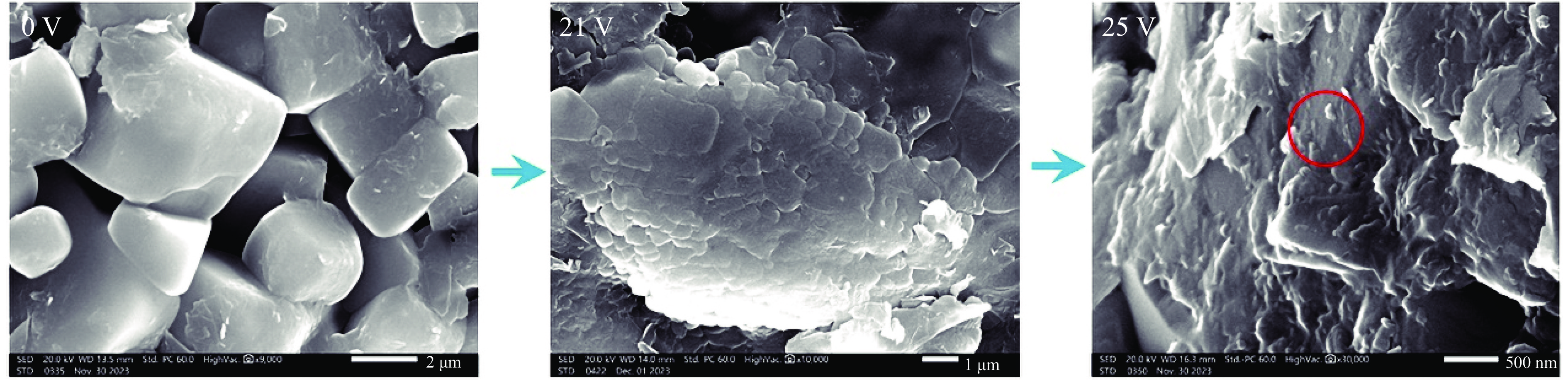 1416 K,即 23 V的电压使样品腔的瞬间温度达到约1416 K。)Figure 3. SEM images of KCl samples after flash-heating under 3.4 GPa (No grain refinement was observed at 21 V, but appeared at 25 V within the red-circled areas. It indicates that the melting voltage of KCl under 3.4 GPa is between 21 and 25 V, approximately (23±2) V. At this pressure, the melting point of KCl is
