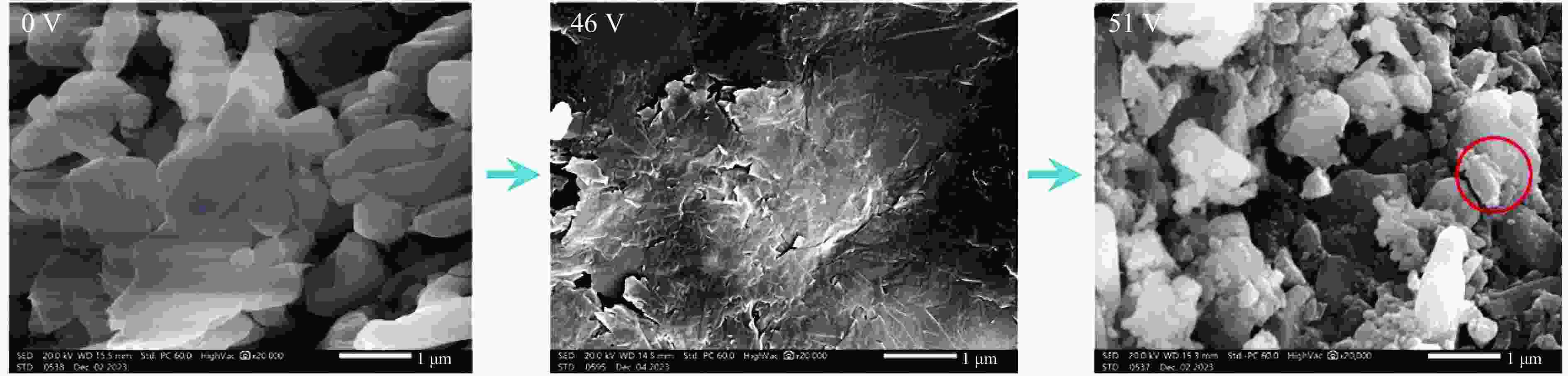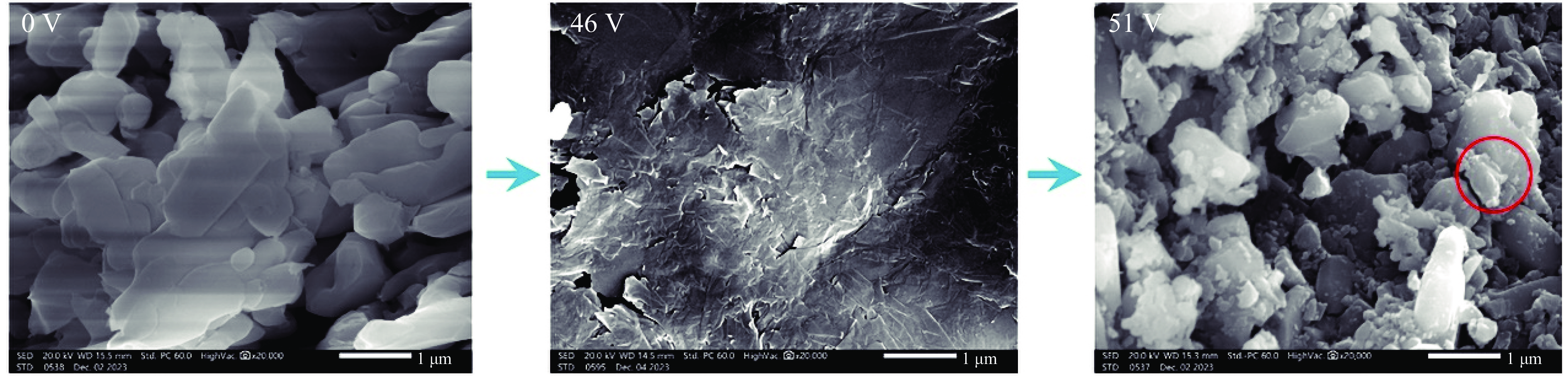 2701 K,即 48.5 V的电压使样品腔的瞬间温度达到约2701 K。)Figure 4. SEM images of Al2O3 samples after flash-heating under 3.4 GPa (No grain refinement was observed at 46 V, but appeared at 51 V within the red-circled areas. It indicates that the melting voltage of Al2O3 under 3.4 GPa is between 46 and 51 V, approximately (48.5±2.5) V. At this pressure, the melting point of Al2O3 is