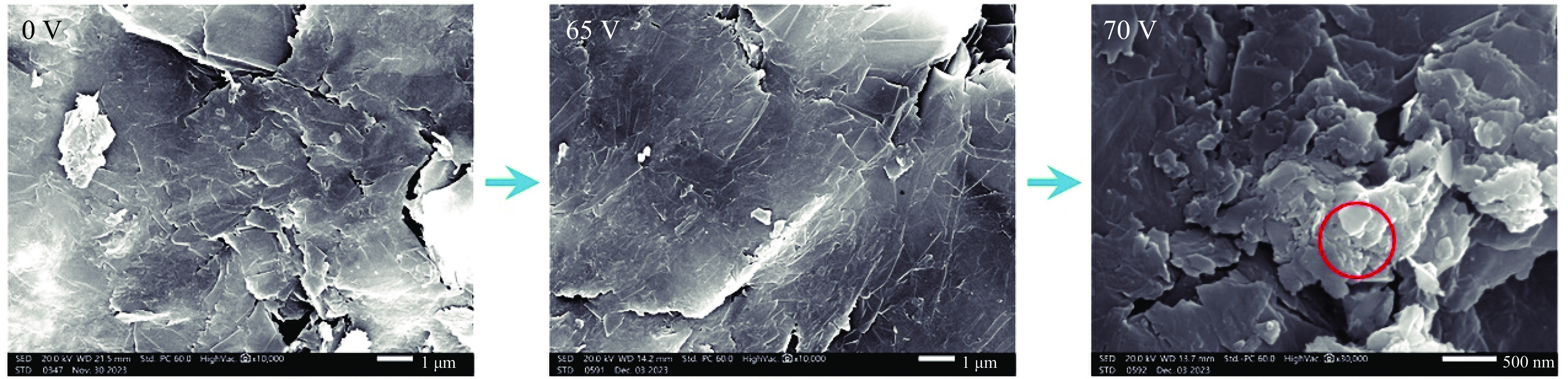 3419 K,即 67.5 V的电压使样品腔的瞬间温度达到约3419 K。)Figure 5. SEM images of MgO samples after flash-heating under 3.4 GPa (No grain refinement was observed at 65 V, but appeared at 70 V within the red-circled areas. It indicates that the melting voltage of MgO under 3.4 GPa is between 65 and 70 V, approximately (67.5±2.5) V. At this pressure, the melting point of MgO is