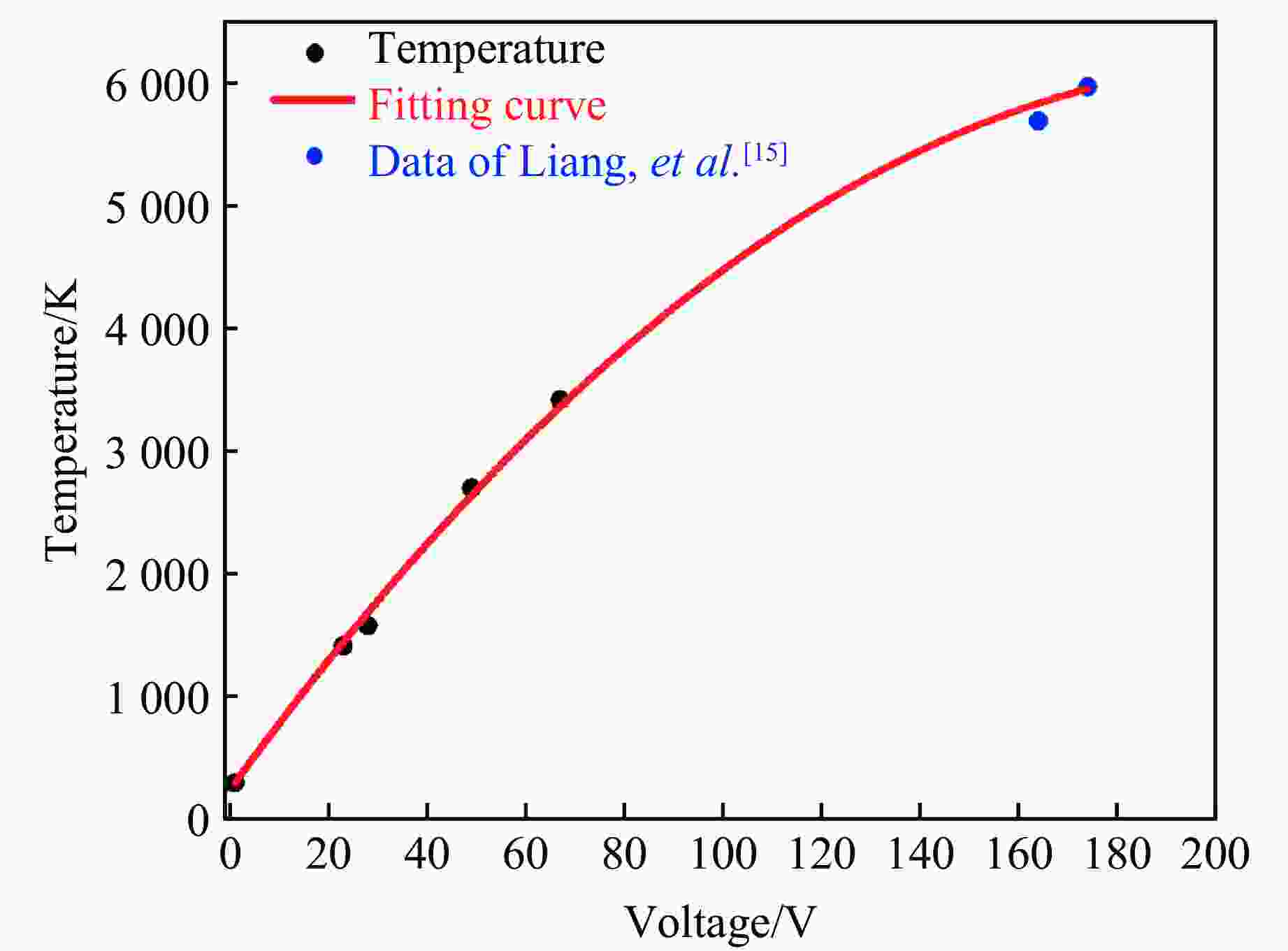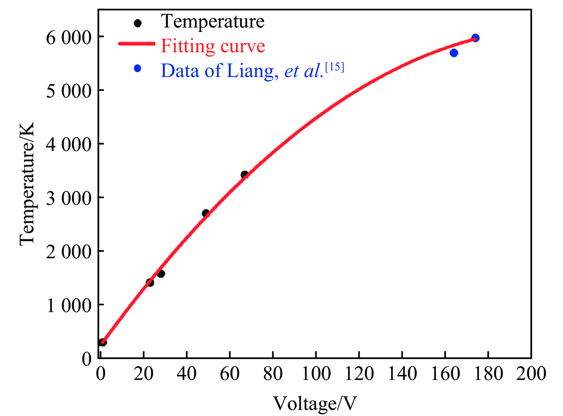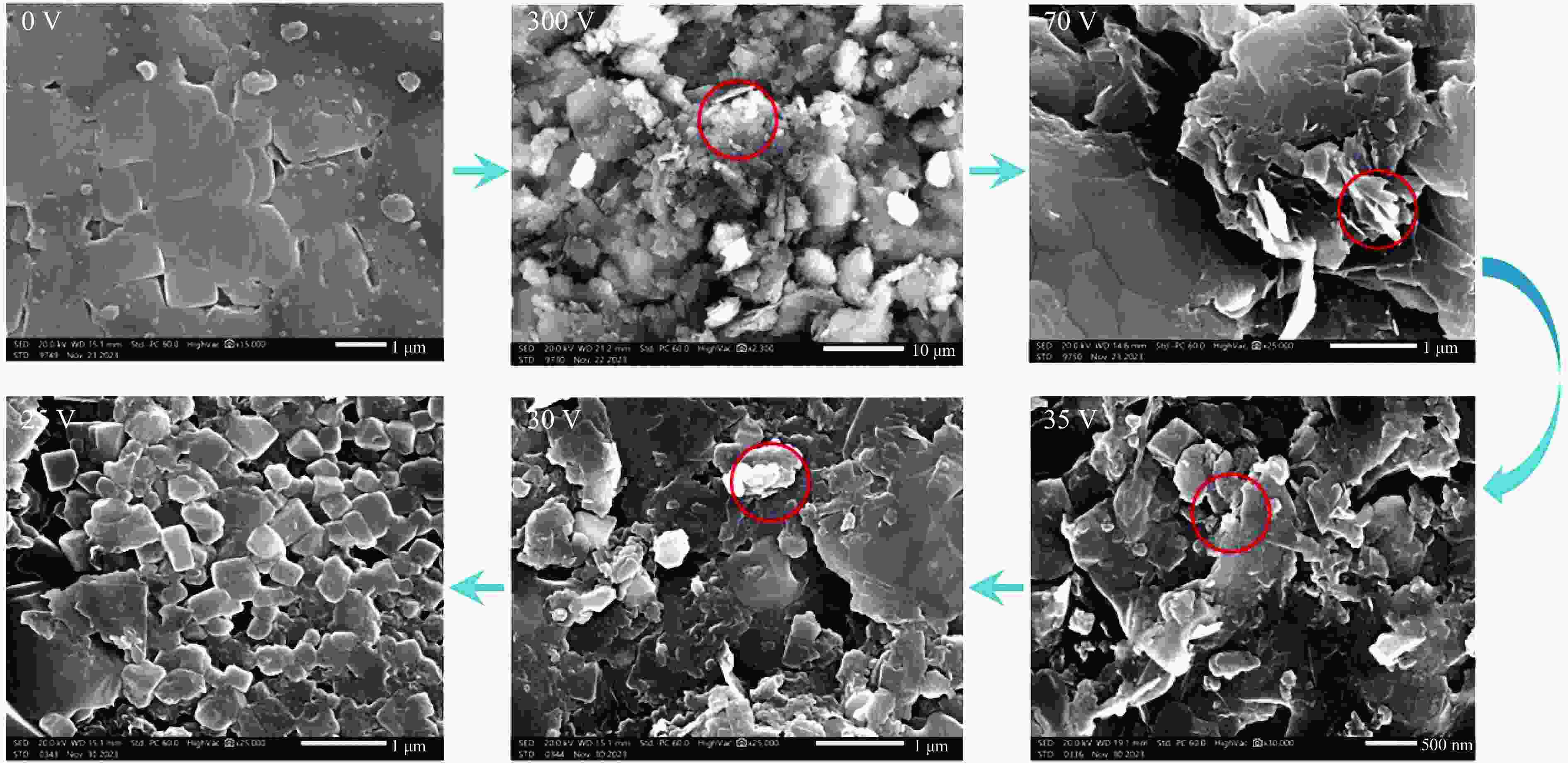 1582 K,即 27.5 V的电压使样品腔的瞬间温度达到约1582 K。)Figure 2. SEM images of NaCl samples after flash-heating with different voltages under (3.4±0.2) GPa (The red circled areas indicate the locations where fine grains are observed, with a distinct grain refining at 300 V. Multiple experiments are conducted, sequentially reducing the voltage to 70, 35, and 30 V, all of which resulted in the appearance of fine grains, demonstrating that at such voltages, the temperature is above the melting point of NaCl. When the voltage reduced to 25 V, no fine-grained areas can be identified in the SEM image; instead, only fragmented grains due to pressure are observed. This suggests that the melting voltage of NaCl under 3.4 GPa is between 25 and 30 V, approximately (27.5±2.5) V. At this pressure, the melting point of NaCl is