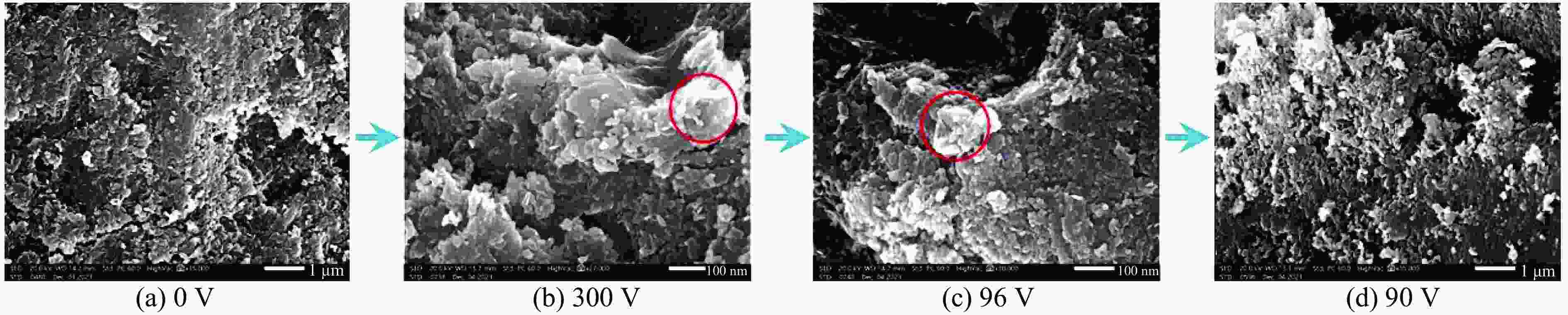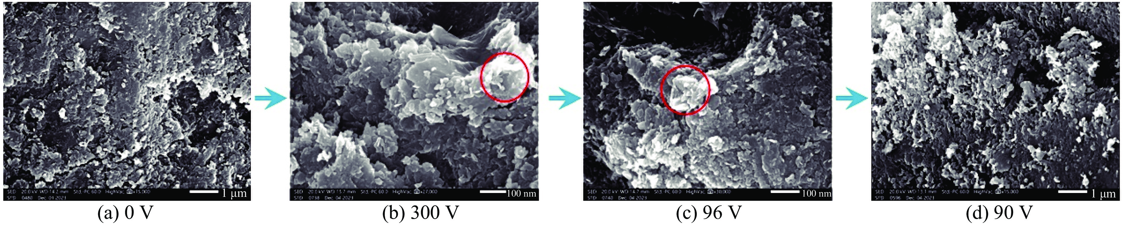 3419 K, suggesting that a voltage of 67.5 V induces an instantaneous temperature of approximately3419 K in the sample chamber.)图 7 3.4 GPa下h-BN经过不同电压瞬间放电后样品的SEM图像(红圈部分为细晶出现的位置。300 V时,有非常明显的晶粒细化现象;96 V时,仍能观察到晶粒细化现象;而90 V时,未见晶粒细化区域,说明在该压力下h-BN熔化,对应的电压约为(93±3) V,对应的熔化温度为(