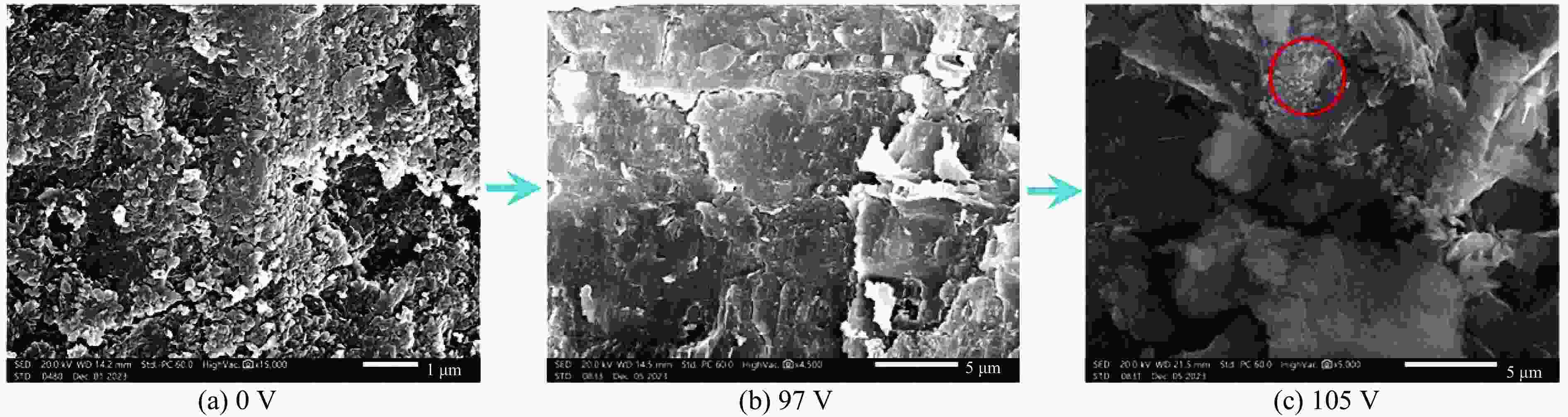 4531 ±200) K。)Figure 8. SEM images of h-BN samples after flash-heating at 4.3 GPa (No grain refinement is observed at 97 V, but appeared at 105 V within the red-circled areas. It suggests that the melting voltage of h-BN under this pressure is approximately (101±4) V. The corresponding melting temperature is approximately (