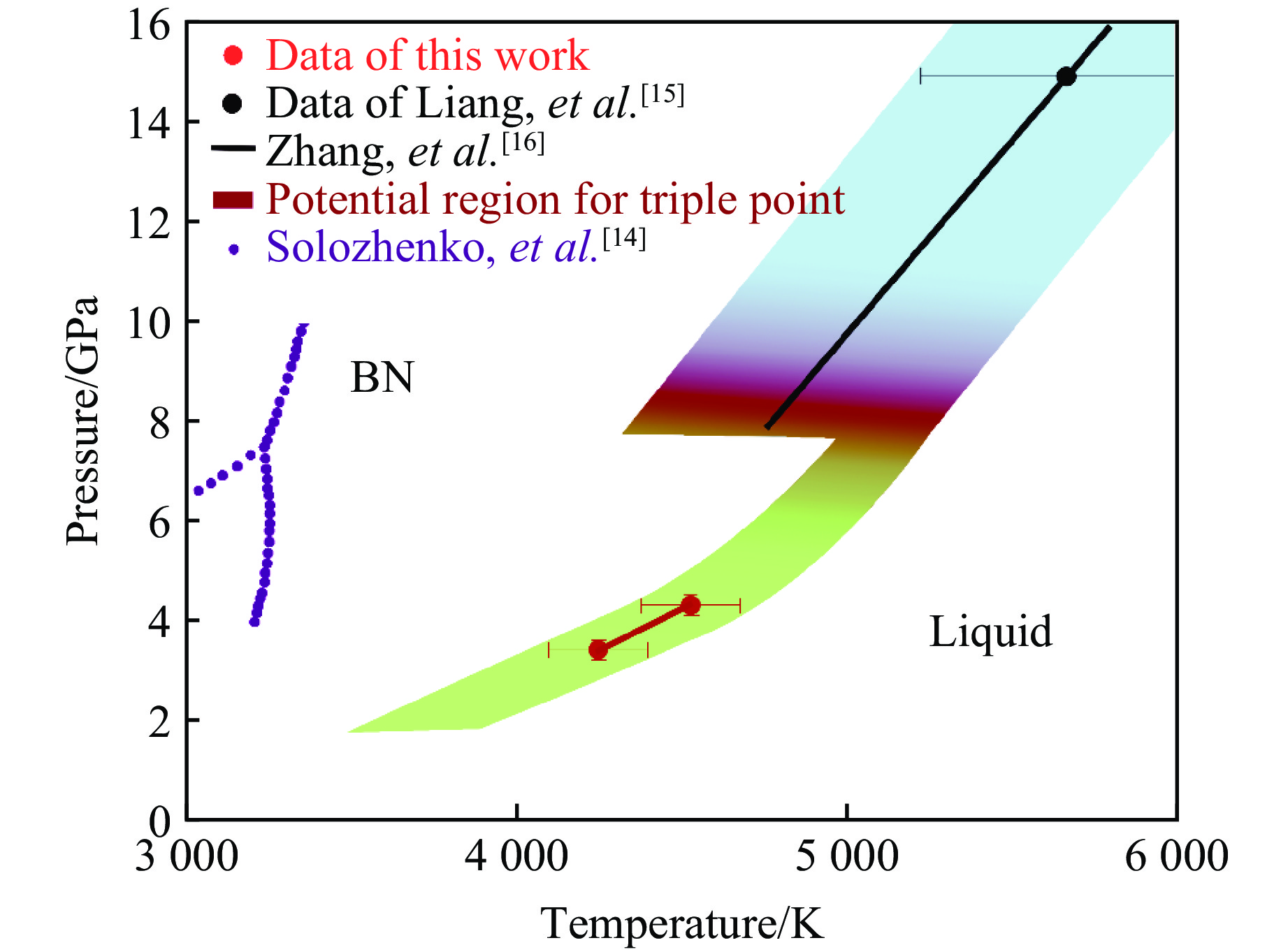 Figure 9. Extension and comparison of the results obtained in this study with data of Zhang et al.[16] on the melting curve of c-BN (The blue region indicates the possible range of the c-BN melting curve, the green region represents the possible range of the h-BN melting curve obtained from this study, and the middle red region indicates the possible range of the triple point. The melting point of h-BN is expected to increase with pressure, with the slope gradually steeper but not negative. This differs from the predictions made by Solozhenko et al.[14].)