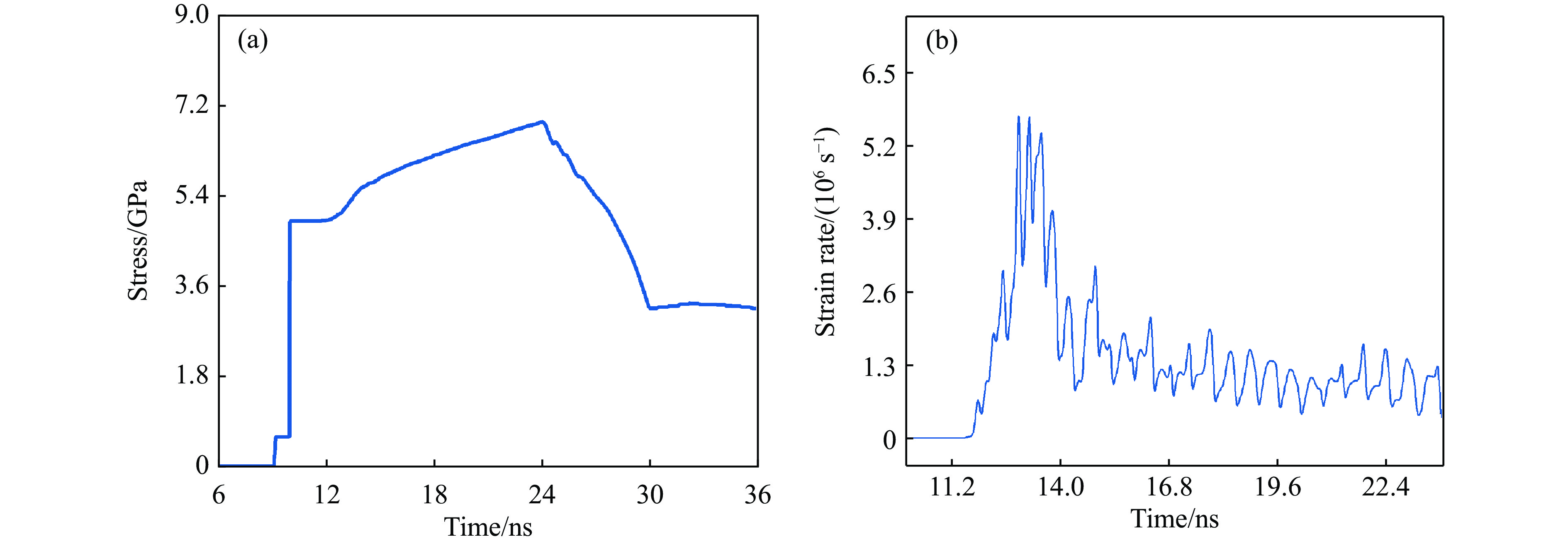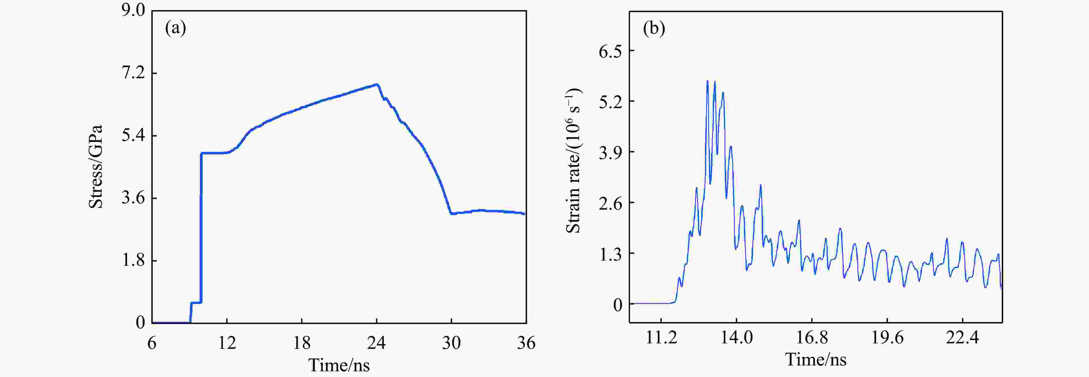 Abstract: The quasi-isentropic loading technique based on wave impedance gradient materials is a crucial method for understanding the dynamic response characteristics of materials, which is essential for enhancing material service performance. In this study, Ti-Pt periodically modulated gradient materials were successfully prepared using electron beam evaporation deposition technology. By adjusting the thickness of the two components (Ti and Pt single layers) within the periodic layers, a macroscopic gradient in wave impedance was achieved. The total thickness error between the measured gradient material and the theoretical design was only 1.67%, with an average hardness and elastic modulus of 2.8 and 99.8 GPa, respectively. The interfaces between the internal layers of the material were clear, and no metal alloy phases were detected in the phase analysis. The Ti-Pt periodically modulated gradient material was loaded onto a 5 μm-thickness Al target by a one-stage light gas gun, generating a shock-quasi-isentropic loading waveform within the Al target. Numerical simulation results showed good agreement in the rising trend with the experimental curve. For the 5 μm-thickness Al target, the particle velocity, stress, and strain rate curves exhibit significant fluctuations in the quasi-isentropic stage, with the strain rate curve oscillating continuously between positive and negative values with large amplitudes. Stress contour maps indicate that the loading process of the periodically modulated gradient material involved the chasing, superposition, and integration of multiple wave systems. Simulation shows that when the target thickness is 60 μm, the wave systems complete integration and change into continuous compression wave loading. Based on the simulation result, light gas gun loading experiment for the Al target with a thickness of 60 μm were conducted. The particle velocity and stress curves in the quasi-isentropic stage change into smooth loading waveforms, and the strain rate curve remains overall positive, achieving a good quasi-isentropic loading. This indicates that the periodically modulated gradient material and target thickness need to be designed to match each other. The results of this study provide a guidance for the application of novel periodically modulated gradient structures. -