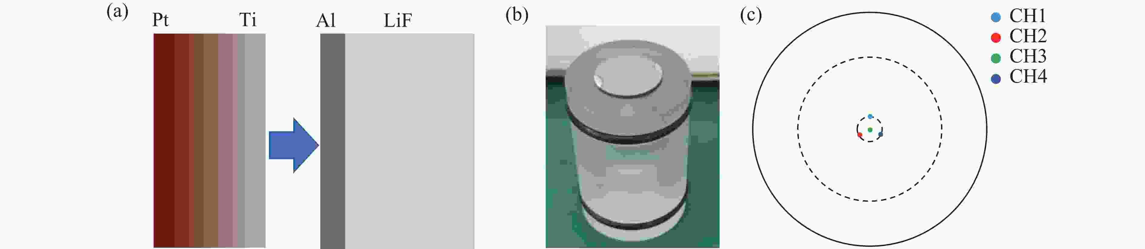 图 4 Ti-Pt周期调制梯度材料的准等熵加载实验设计:(a) Ti-Pt周期调制梯度材料撞击Al靶示意图,(b) 粘结Ti-Pt周期调制梯度材料的弹托,(c) LiF窗口背面分布的光纤测速点