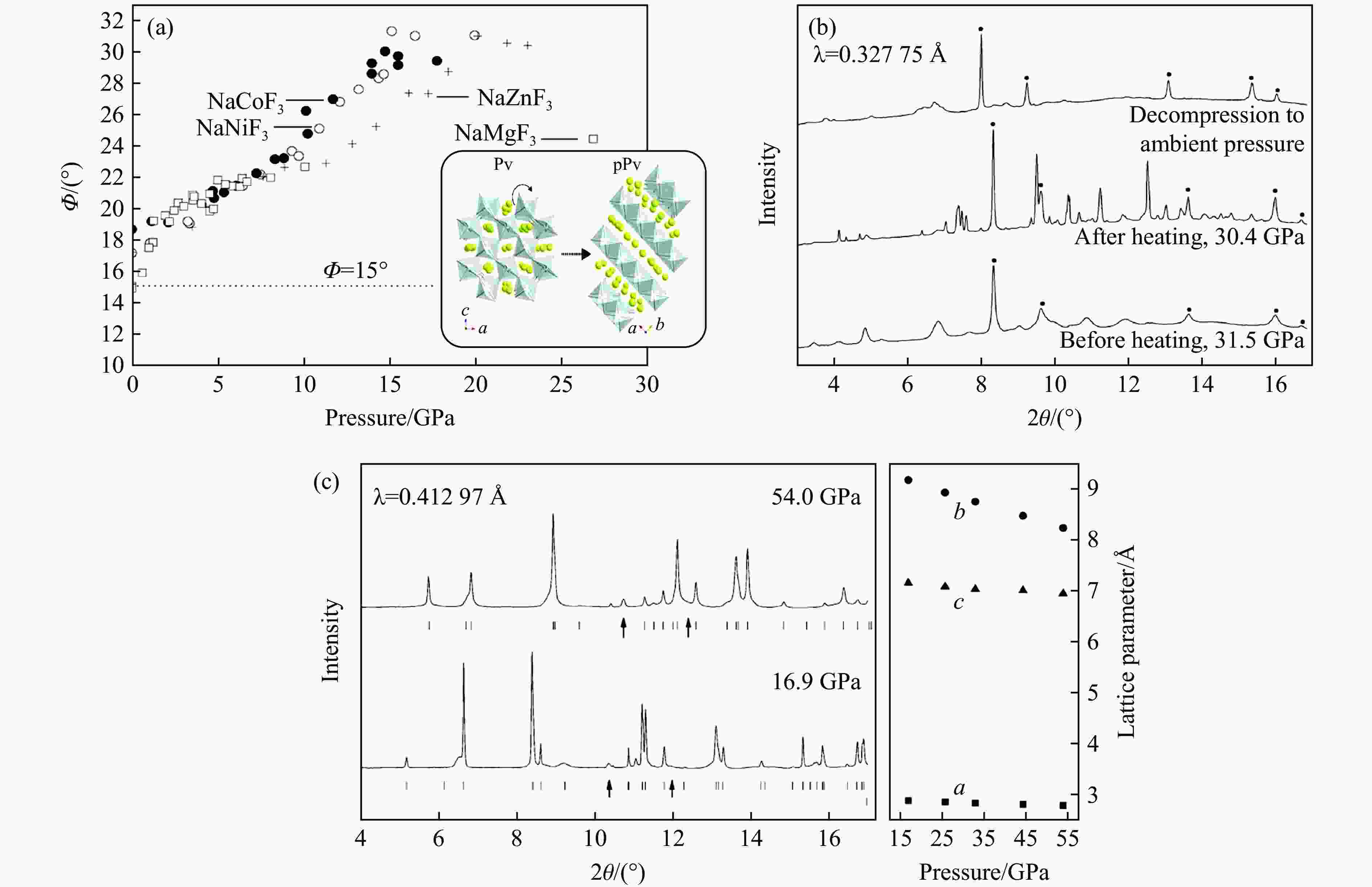 Figure 10. (a) Pressure dependent of octahedral tilt angle Φ of NaBF3 (B = Mg, Co, Ni, Zn) system[97]; (b) in-situ high pressure XRD patterns of NaCoF3; (c) in-situ high pressure XRD results of NaNiF3[97] (a, b, and c are lattice constants.)