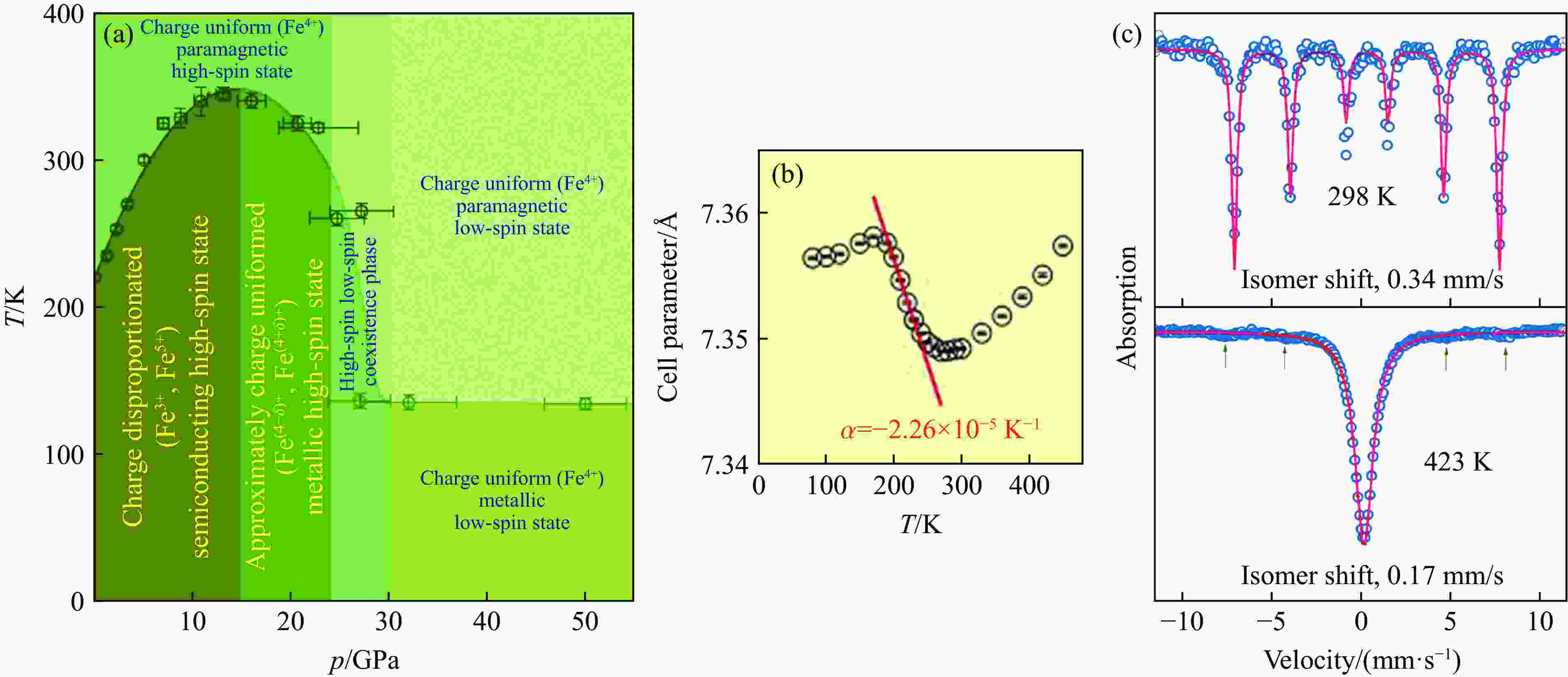 图 12 ACu3Fe4O12体系的新奇物性:(a) CaCu3Fe4O12在高压下的复杂价态和物性转变[111],(b) SrCu3Fe4O12的新奇离子价态[115],(c) LaCu3Fe4O12的巨大负热膨胀系数[116]
