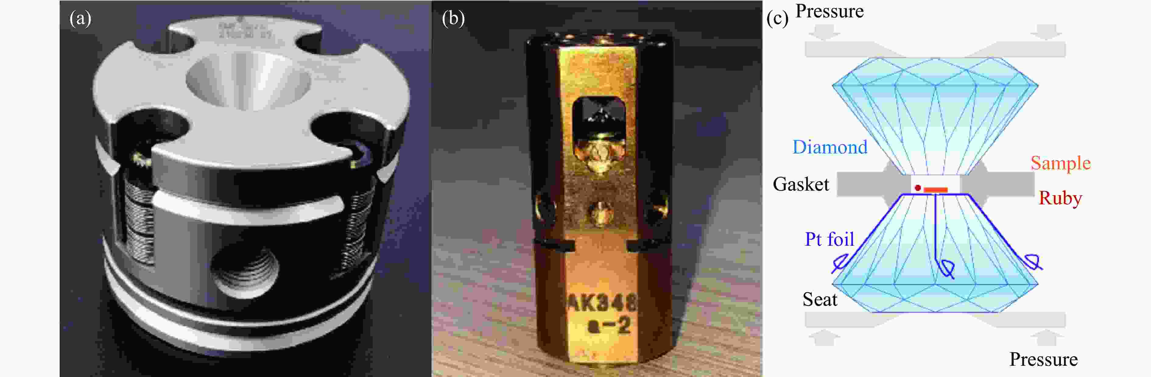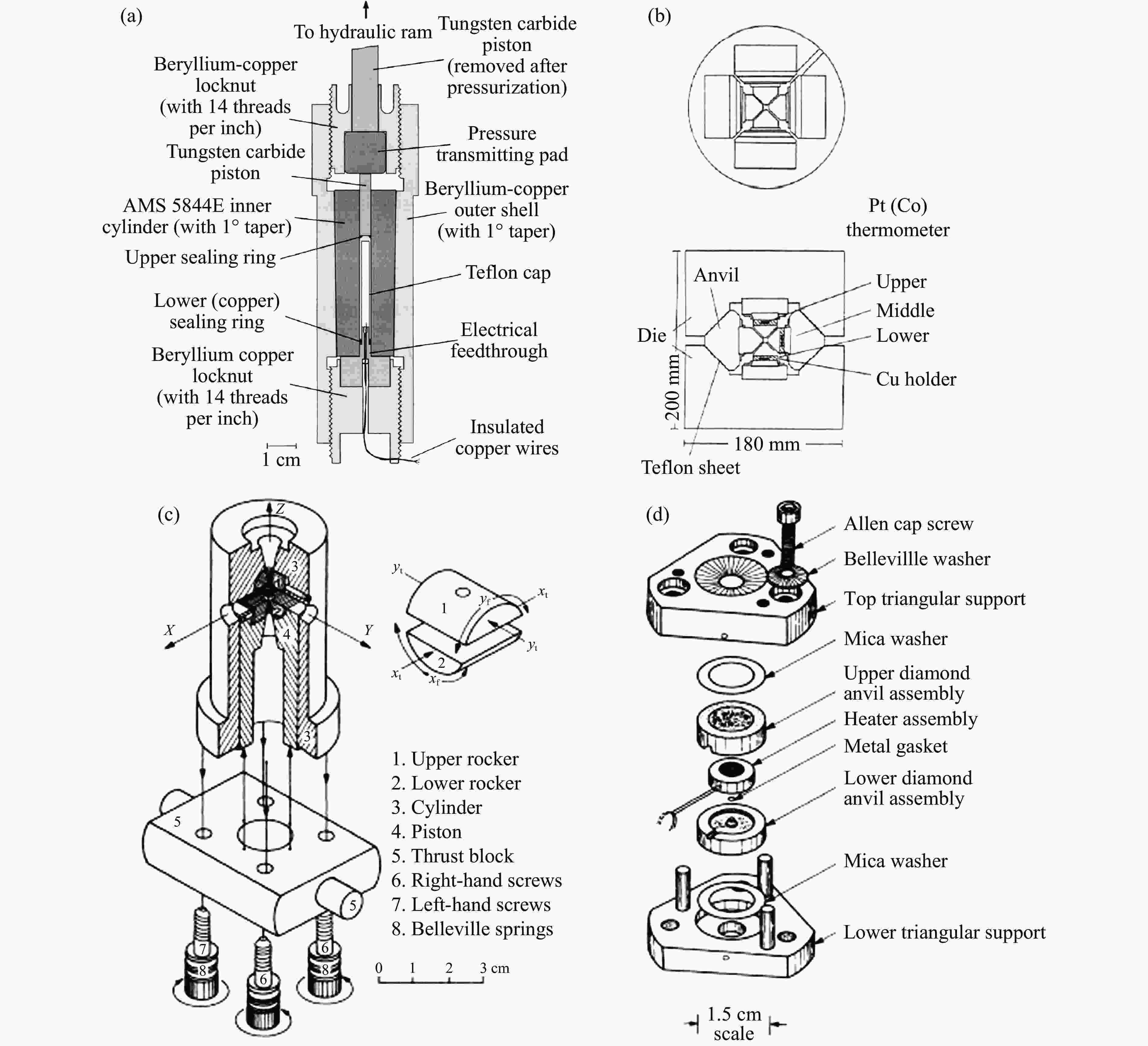 图 2 高压原位测量装置:(a) 活塞圆筒压腔[42] ,(b) 立方体压腔[45],(c) 用于电学测量的金刚石对顶砧[47],(d) 用于单晶X射线衍射测量的金刚石对顶砧[47]