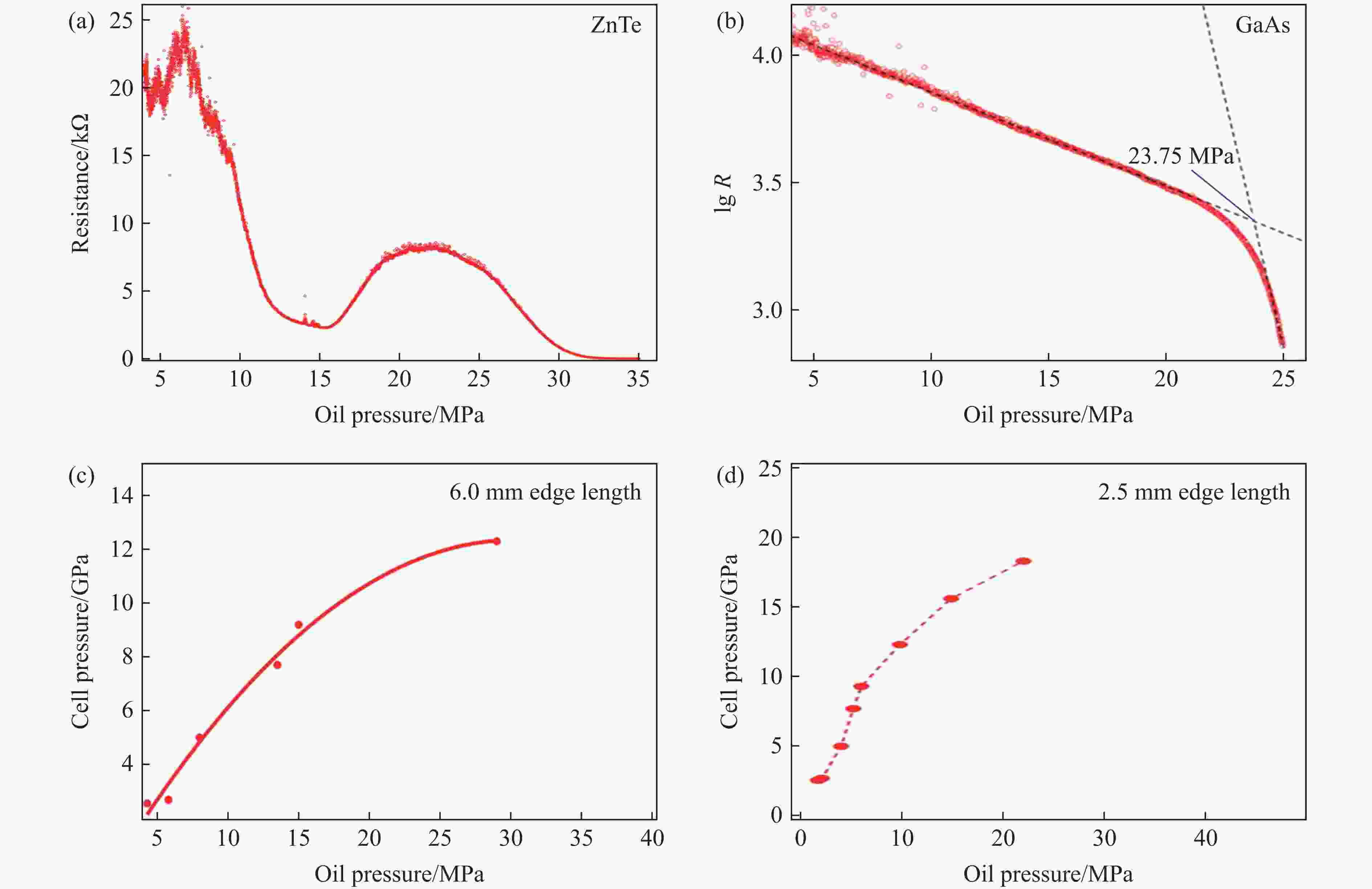 1000 t Walker型二级增压装置及校压结果:(a) 6.0 mm切角二级压砧ZnTe的压力-电阻曲线, (b) 2.5 mm切角二级压砧GaAs的压力-电阻曲线,(c) 6.0 mm切角二级压砧校压结果,(d) 2.5 mm切角二级压砧校压结果Figure 3. Pressure calibration of