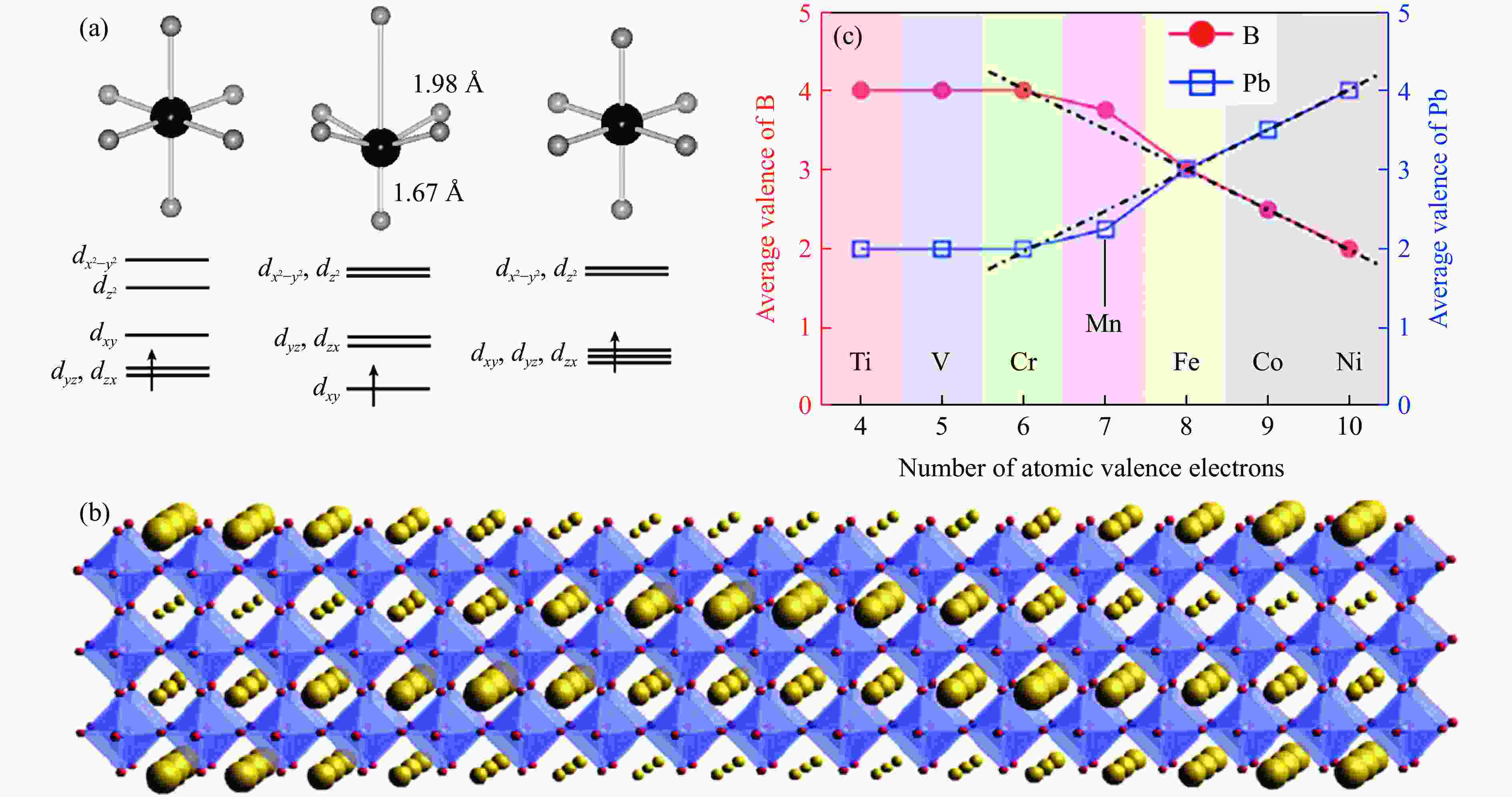 Figure 6. (a) Structural distortion and orbital hybridization of PbVO3[70]; (b) complex crystal structure of PbCrO3[71] (Yellow ball is Pb ions, the size of which indicates the filling ratio; purple ball is Cr ions and red ball is O ions.); (c) charge disproportionation of PbMnO3[75]