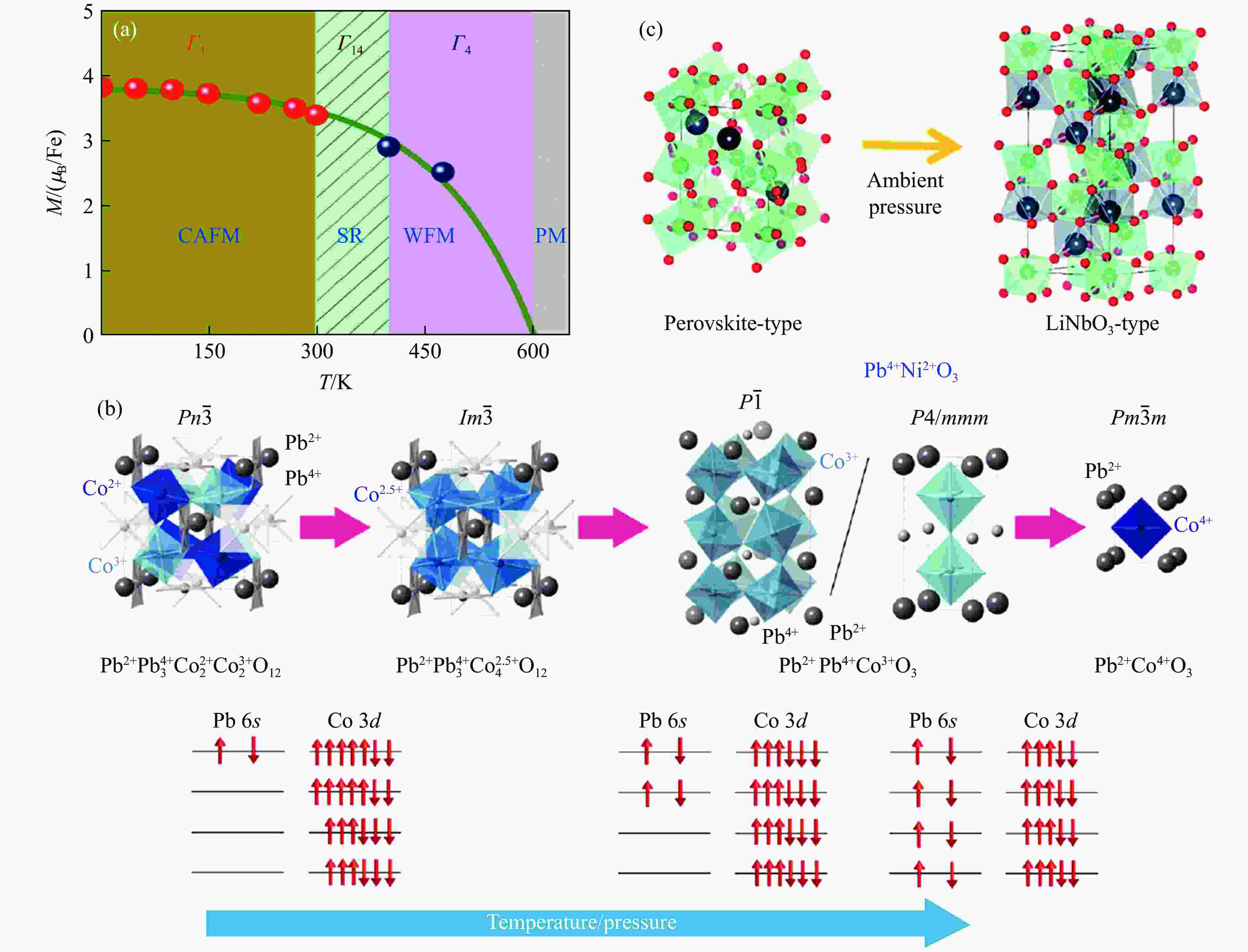 1000 t Walker-type apparatus: (a) ZnTe resistivity-pressure curve using 6.0 mm edge lengthsecond stage anvil; (b) GaAs resistivity-pressure curve using 2.5 mm edge length second stage anvil; (c) pressure calibration result using 6.0 mm edge length second stage anvil; (d) pressure calibration result using 2.5 mm edge length second stage anvil图 6 (a) PbVO3的结构畸变和轨道杂化[70],(b) PbCrO3的复杂晶体结构[71] (其中,黄球为Pb离子,其大小表示填充率高低;紫球为Cr离子;红球为O离子 ),(c) PbMnO3的电荷歧化[75]