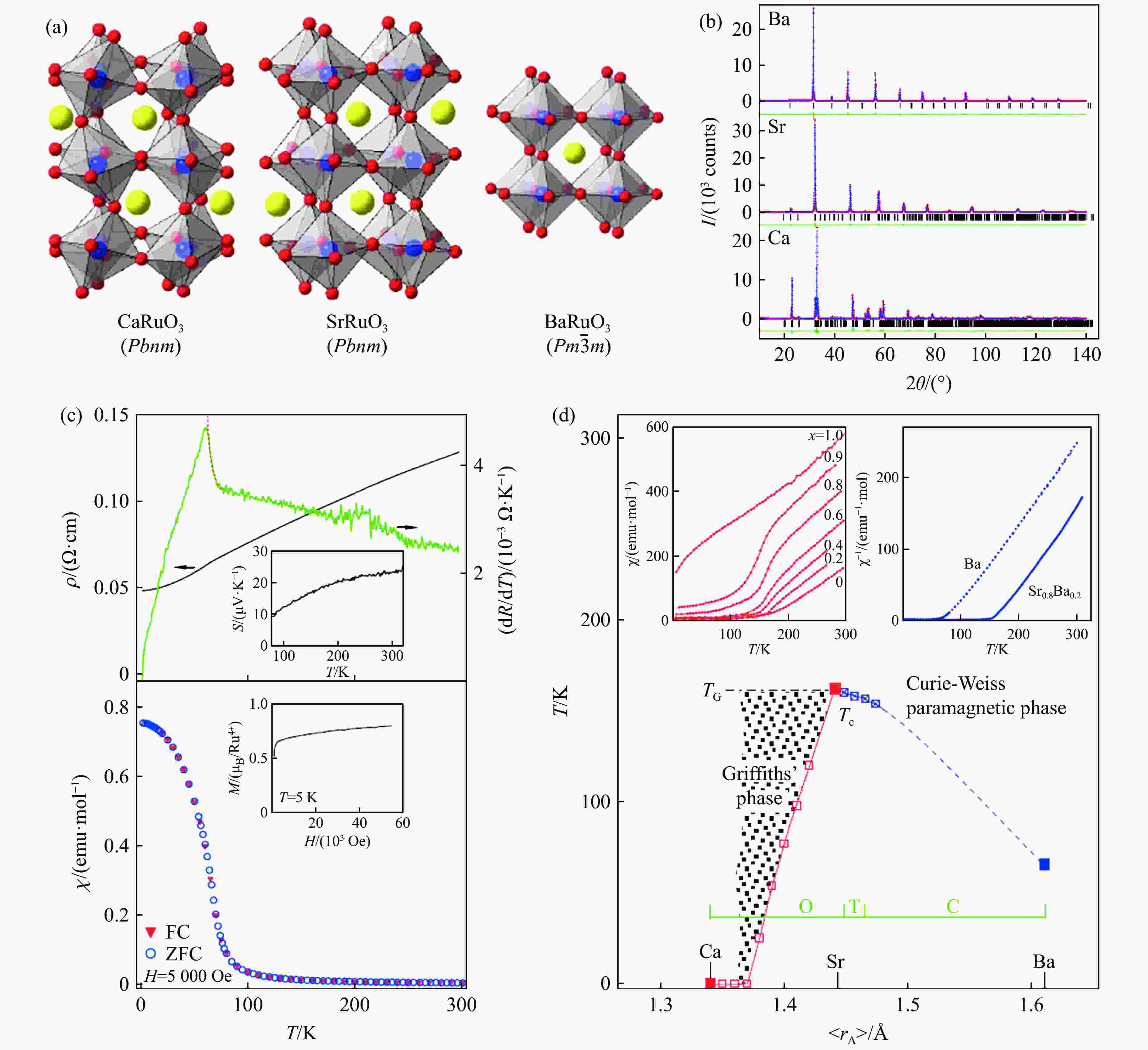 Figure 8. (a) Crystal structure of ARuO3 system[85] ; (b) powder XRD refinement result of ARuO3 system[85]; (c) physical properties of BaRuO3[85]; (d) summary of crystal structure and physical properties of Ca/Ba doped SrRuO3 system[85] (TG is Griffiths phase temperature, O stands for orthorhombic structure, T stands for tetragonal structure and C stands for cubic structure.)