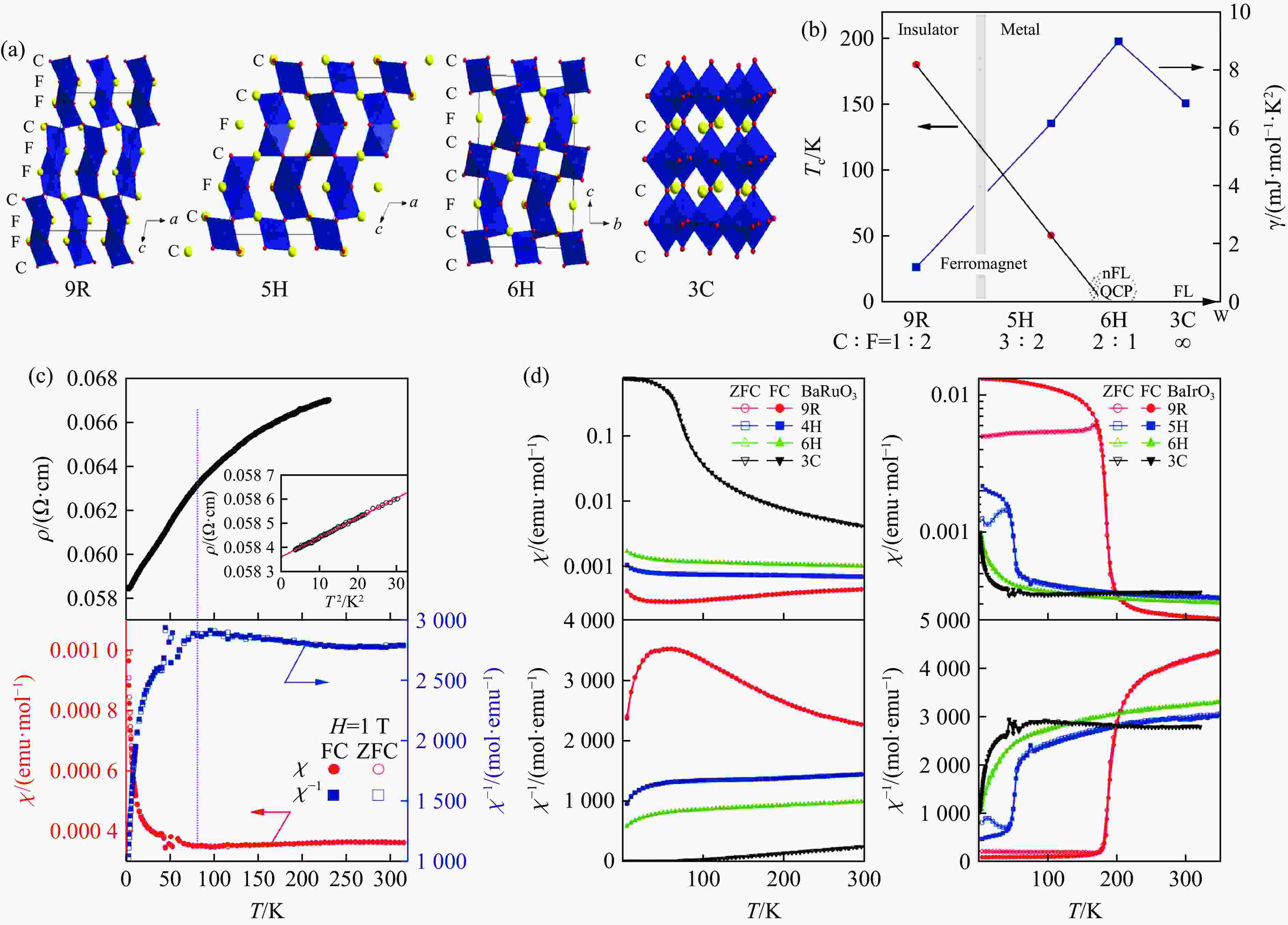 Figure 9. (a) Structural transition of BaIrO3 with increasing pressure[91]; (b) evolution of physical properties of BaIrO3 with various structures[91]; (c) temperature dependent resistivity and magnetic susceptibility of BaIrO3[91]; (d) magnetic susceptibility of BaIrO3 and BaRuO3 polytypes[91]