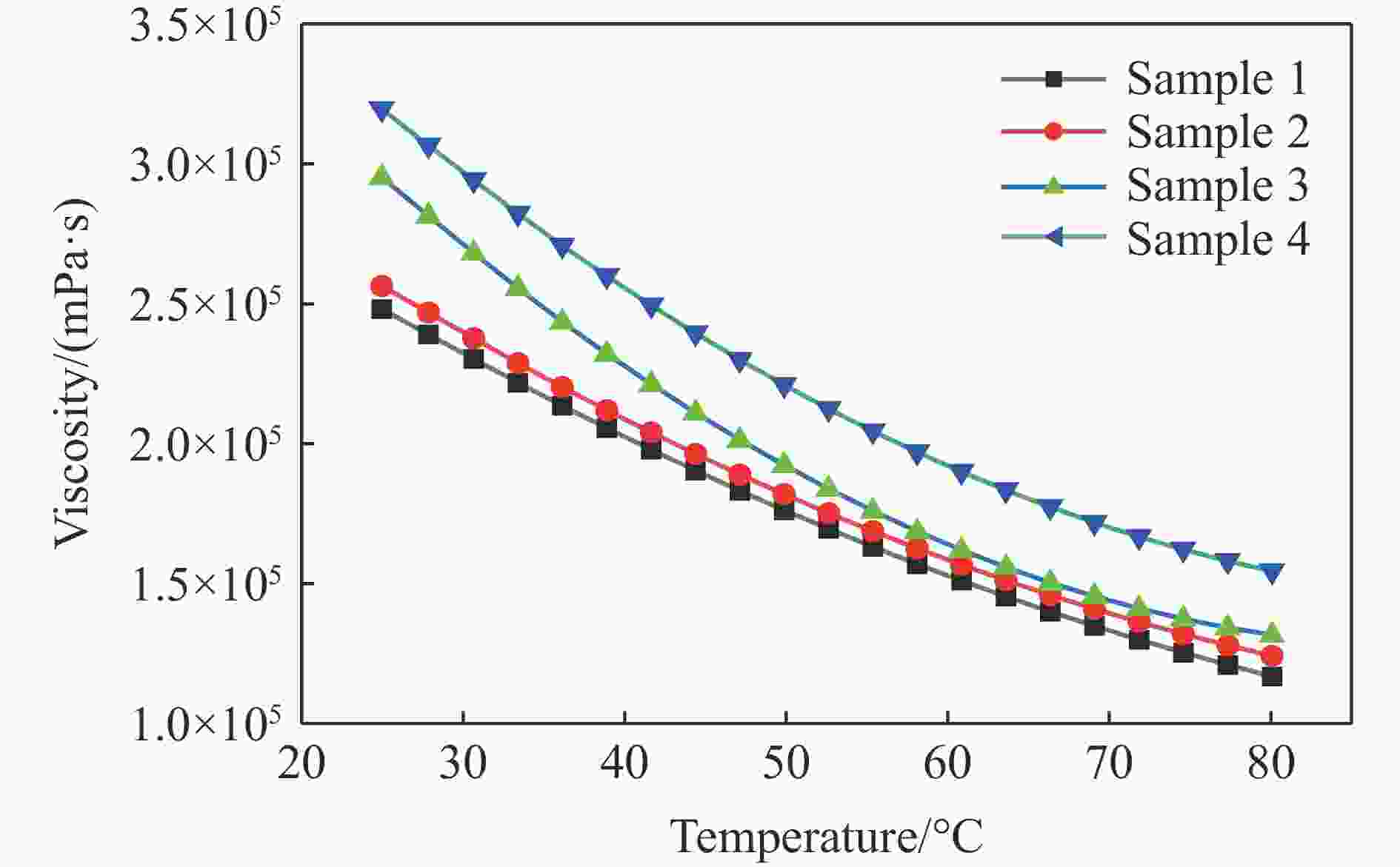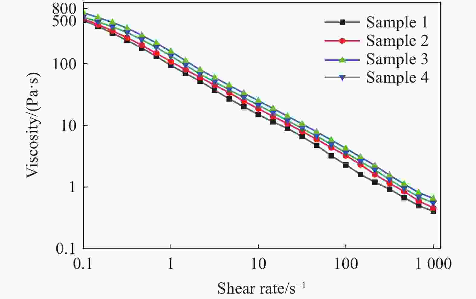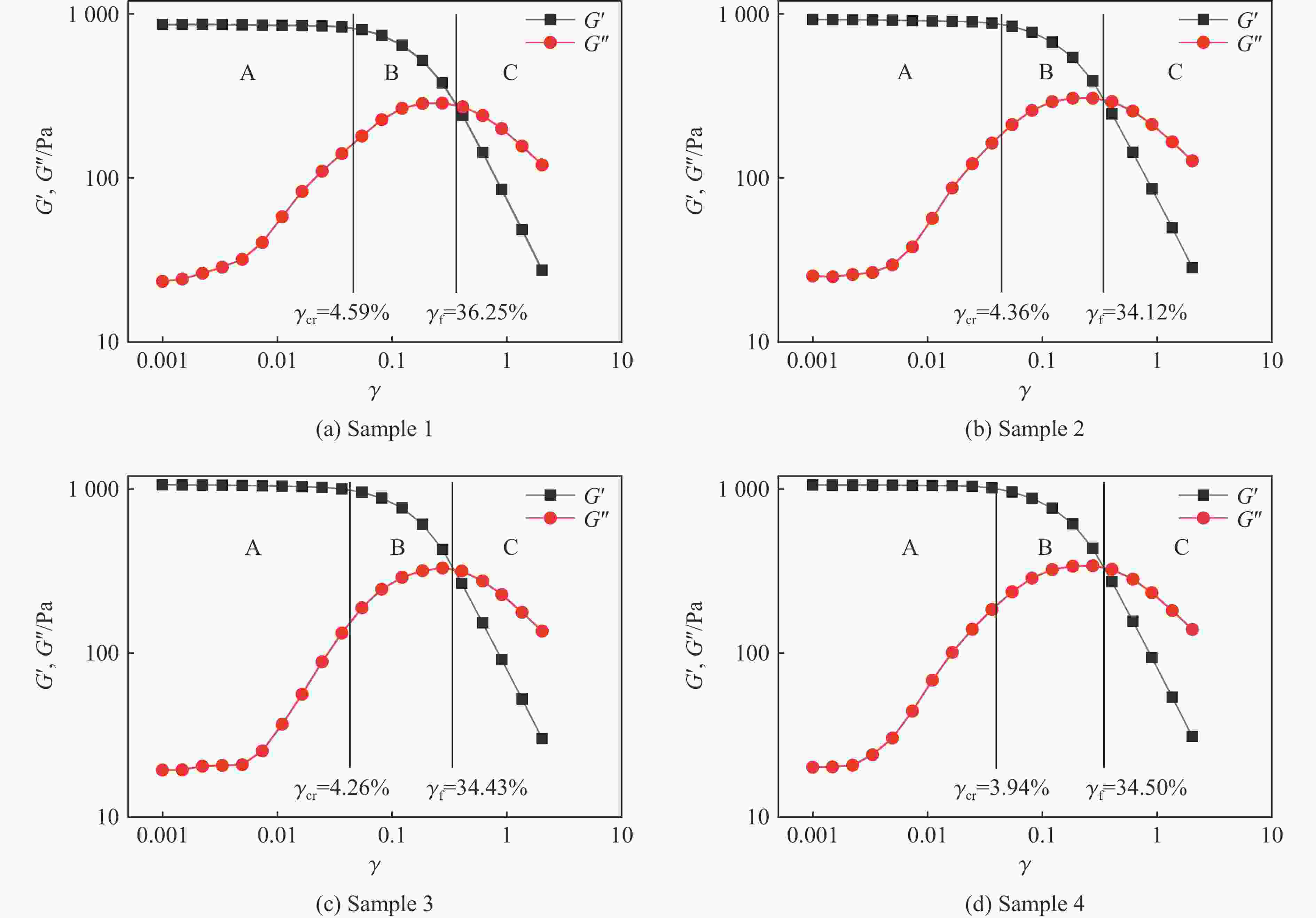 Samples $G'_{\mathrm{m}} $/Pa $\gamma_{\mathrm{cr}} $/% Cohesion/Pa 1 815 4.59 37.41 2 861 4.36 37.53 3 984 4.26 41.92 4 1 010 3.94 39.79 表 3 4种样品的热分解特征温度