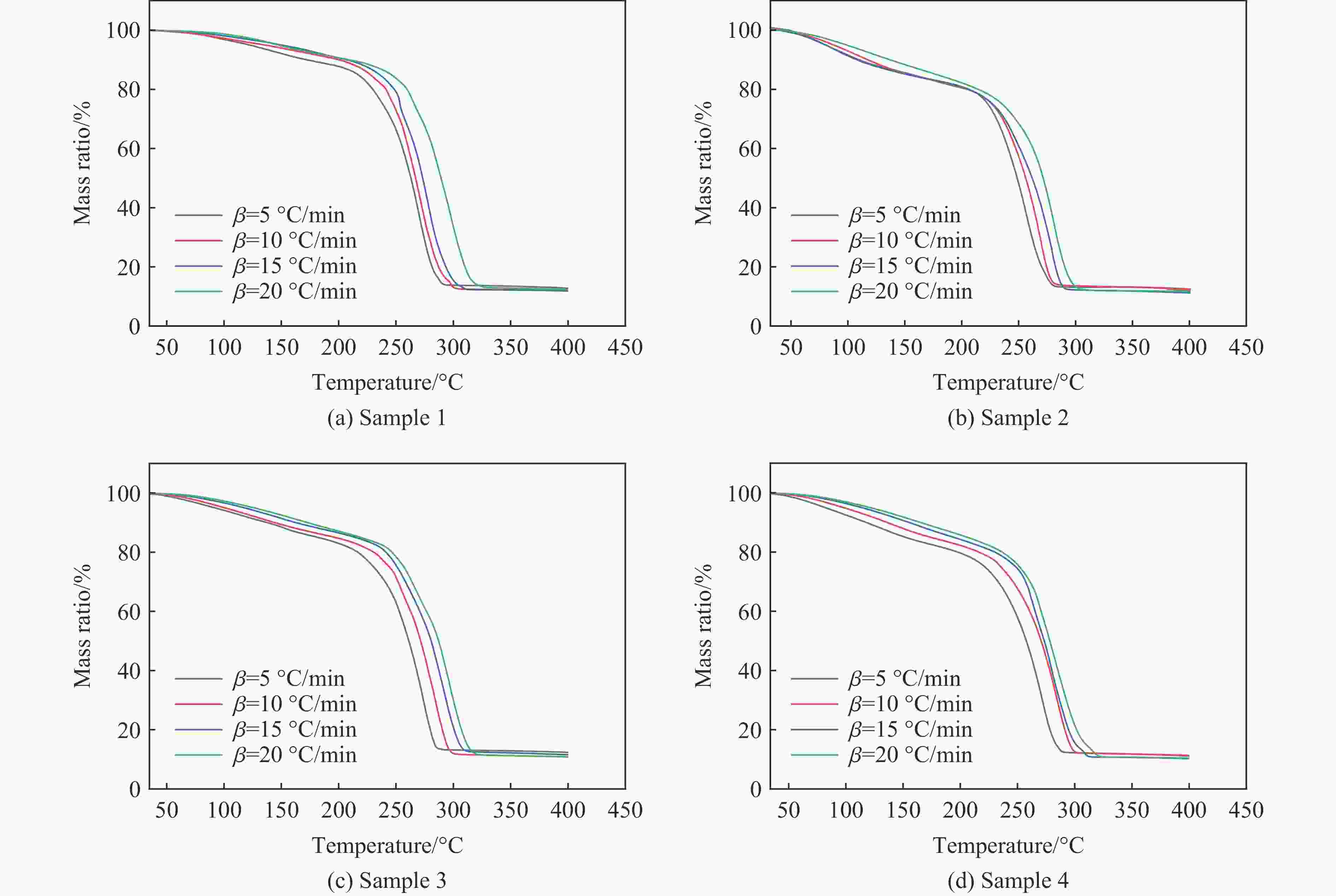Samples Tonset/℃ Tp/℃ Te/℃ 1 238.36 264.83 278.35 2 245.41 266.24 285.73 3 251.76 282.42 295.08 4 256.65 282.71 296.10 表 4 Kissger法计算得到的$E_\text{a}$和${\mathrm{lg}}\;A_{\mathrm{k}} $
