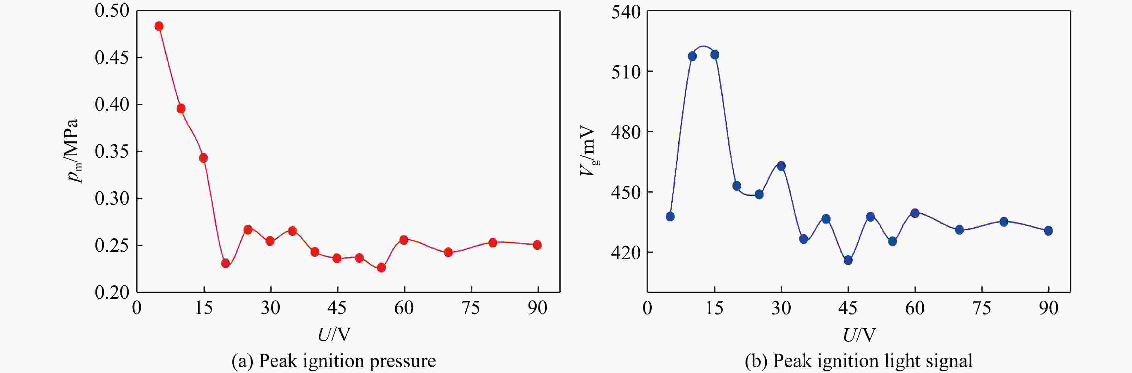 图  电点火头的发火压力峰值和发火光强峰值随点火电压的变化