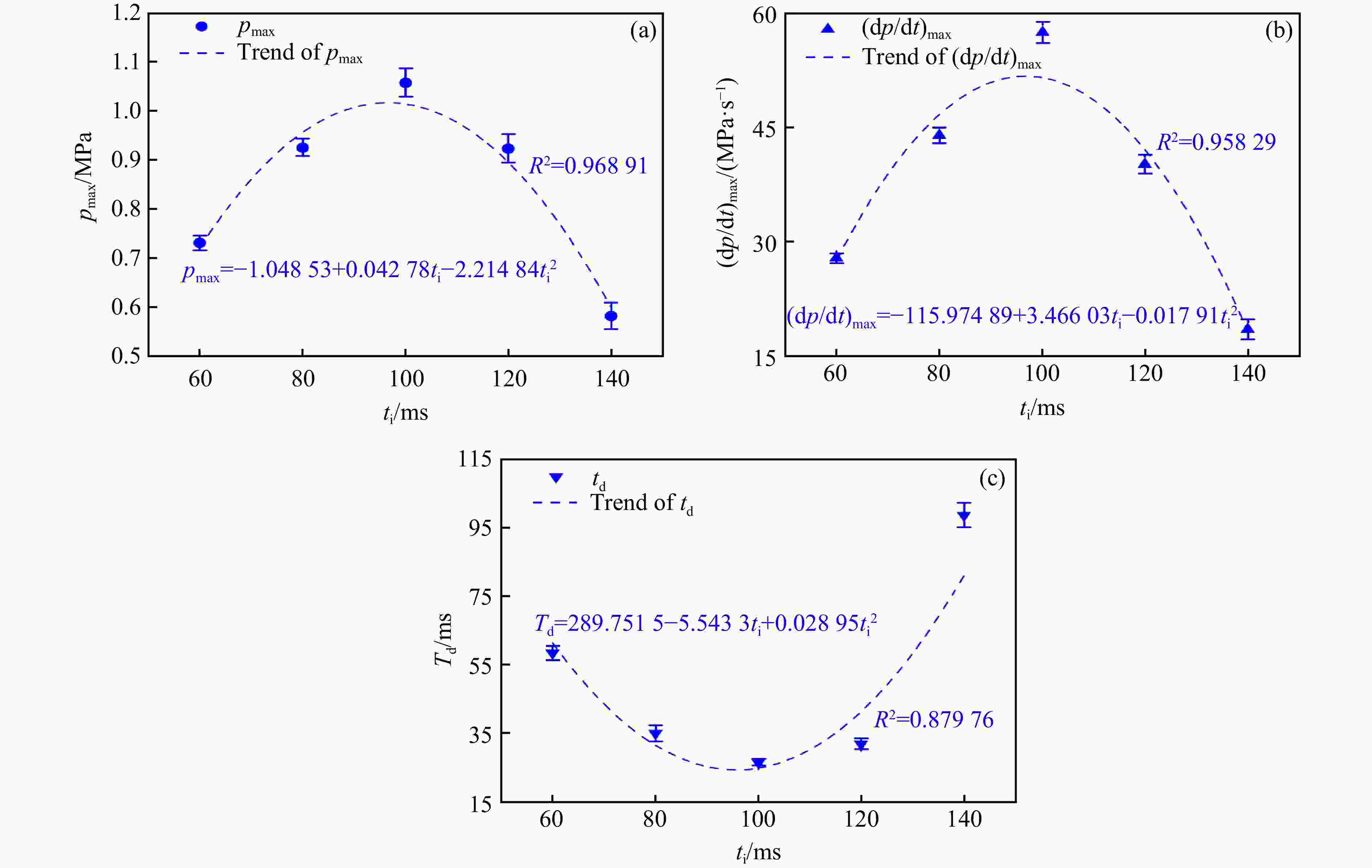 图  喷料时间对pmax、(dp/dt)maxtd的影响