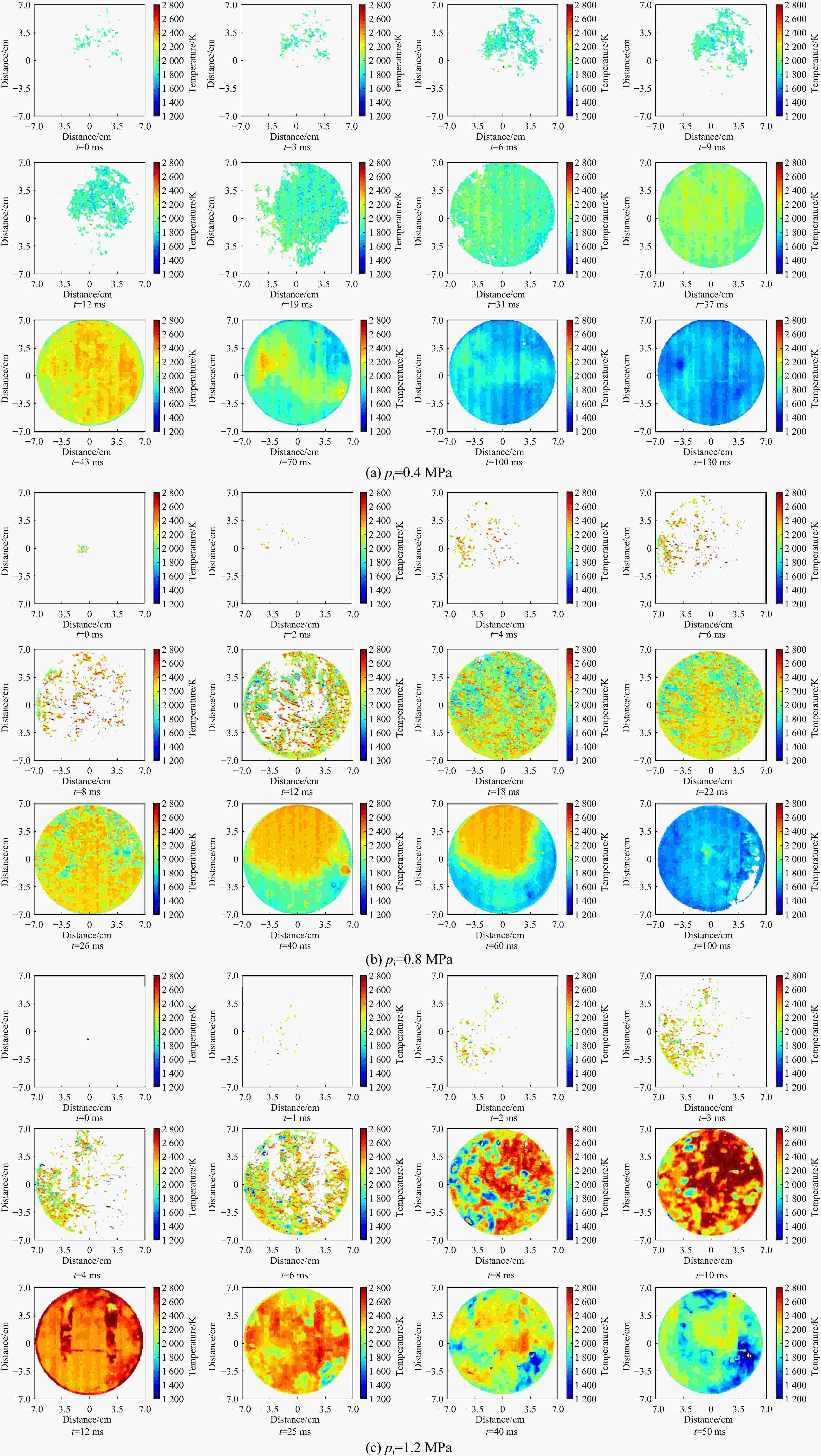 图  不同喷射压力下火焰传播过程中温度的演化曲线