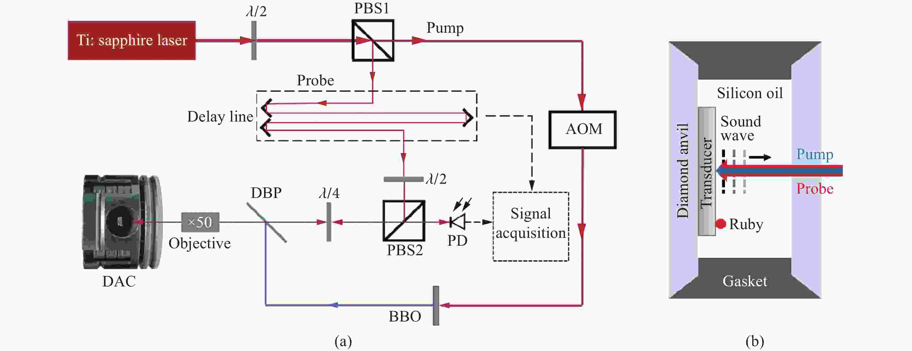 图 1 (a) 皮秒超声实验装置(PBS为偏振分束器,λ/4为1/4波片,λ/2为1/2波片,AOM为声光调制器,DBP为二向色分束器,PD为光电探测器);(b) 放大的金刚石压腔(Transducer为光声换能介质(钨箔),样品腔的剩余空间由硅油填充,图中还注明了泵浦光和探测光的光路及声波的传播路径)