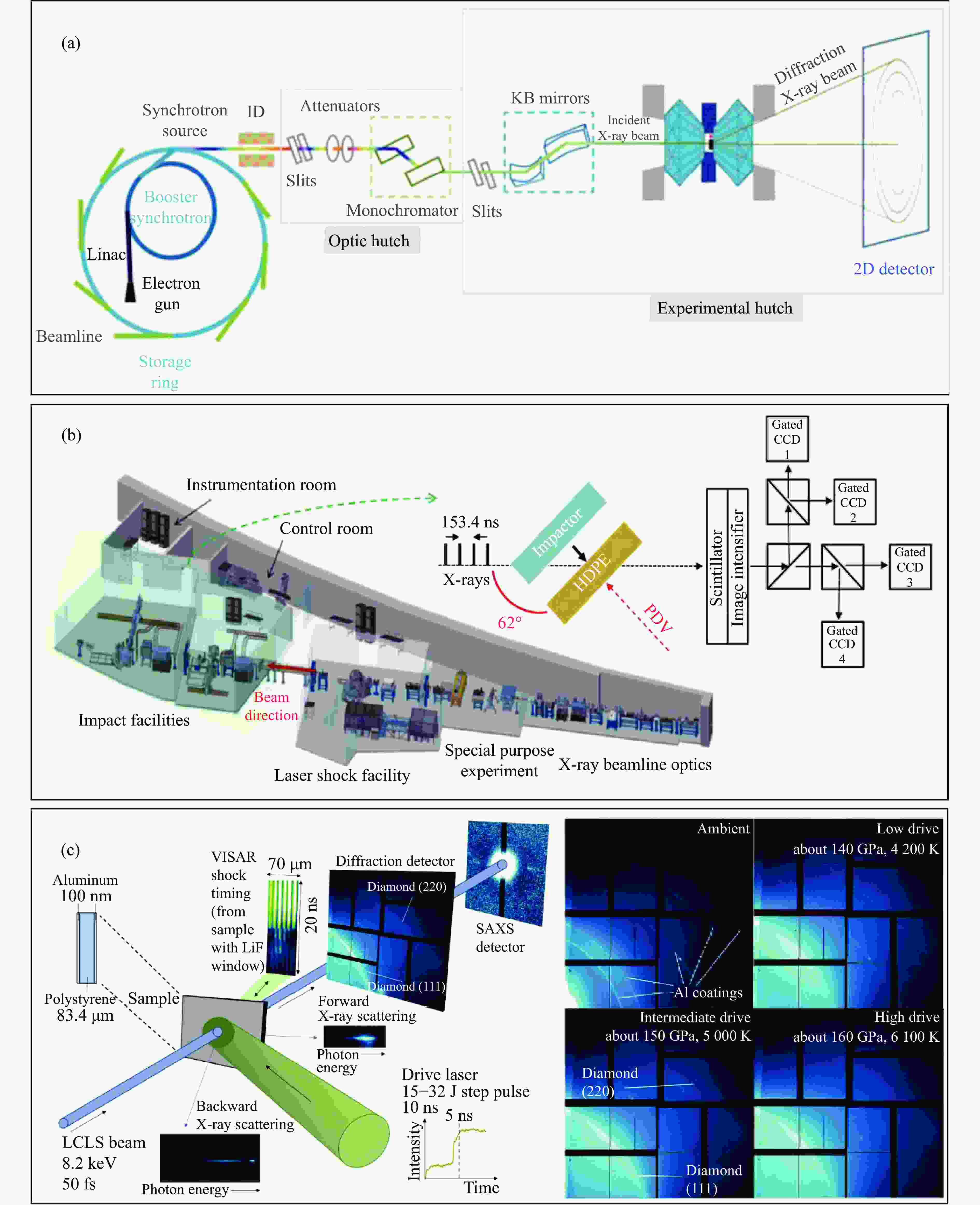 图 2 高温高压条件下聚合物的状态方程和结构研究采用的实验技术:(a) DAC加载的基于同步辐射光源的X射线衍射实验的实验系统[22],其中,ID为插入件(insertion device),包括扭摆器(wiggler)和波荡器(undulator),(b) 美国阿贡国家实验室APS光源的DCS实验站(该实验站建有基于轻气炮加载的同步辐射X射线衍射实验系统[29],其中,HDPE为高密度聚乙烯(high-density polyethylene),PDV(photon Doppler velocimetry)为光子多普勒测速),(c) 基于激光冲击加载和XFEL的聚合物结构测量实验光路(包括X射线广角衍射和小角散射等[16],其中,LCLS(Linac Coherent Light Source)是位于斯坦福的XFEL装置,VISAR为任意面反射激光干涉测速系统(velocity interferometer system for any reflector))