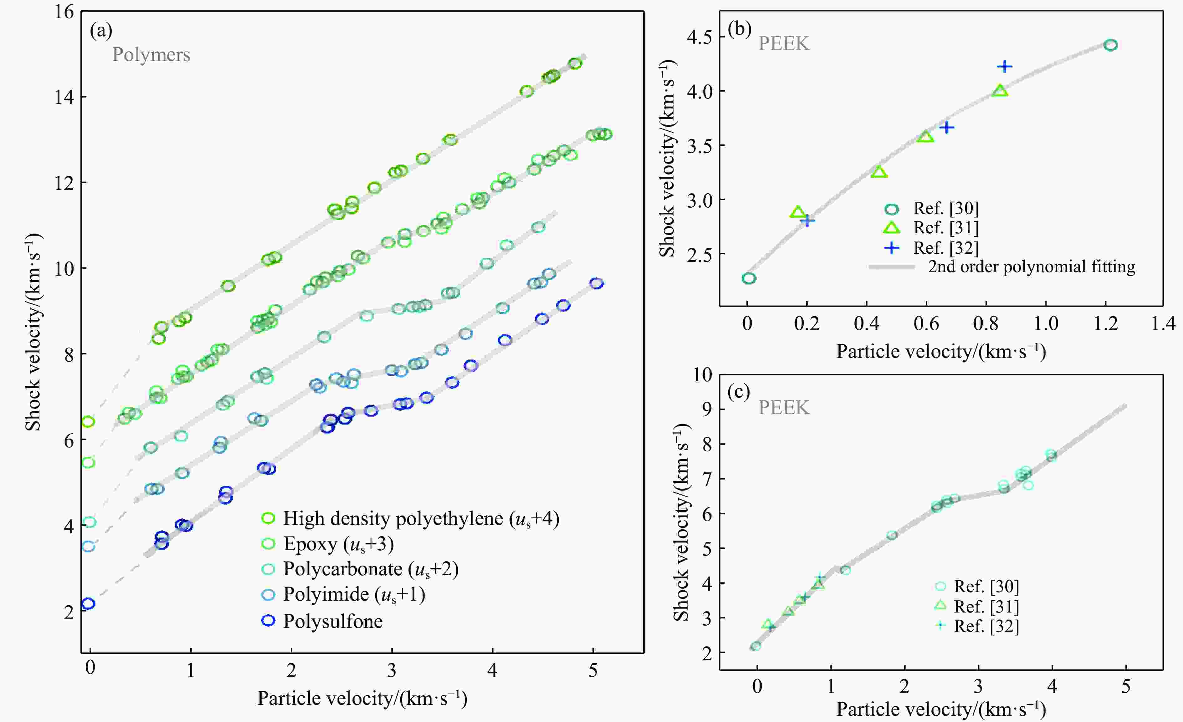 图 3 (a) 聚合物的Hugoniot状态方程[8],(b) PEEK的Hugoniot状态方程在低压段的数据,图中的实线是采用二次函数的拟合结果:us = c0+s1up+$s_2 u_{\mathrm{p}}^2 $,(c) PEEK的Hugoniot状态方程[30–32](图中的实线是一次函数拟合结果,us-up关系需分4段进行拟合)