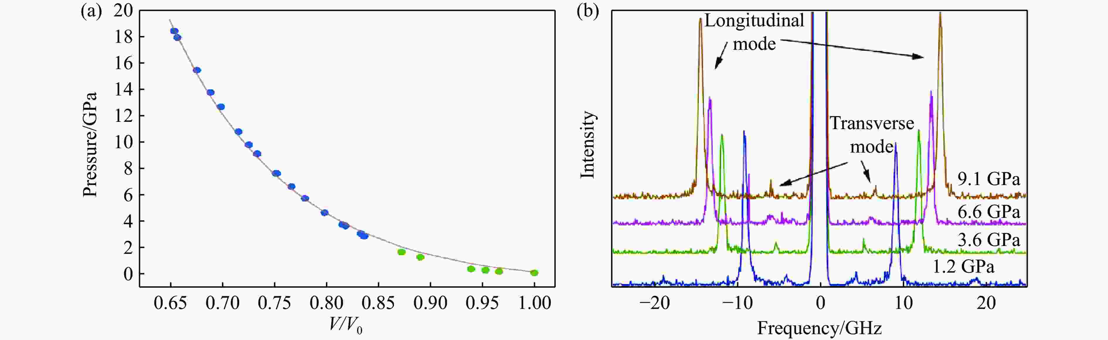 图 4 (a) Kel-F800(chlorotrifluoroethylene-co-vinylidene fluoride)在0~18.5 GPa压力范围内的状态方程[39](Kel-F800在低压段的压缩趋势(绿色数据点)与高压段(蓝色数据点)明显不同,实线为采用三阶Birch-Murnaghan状态方程拟合整个压力范围内的数据的结果),(b) Kel-F800在高压下的典型布里渊散射谱