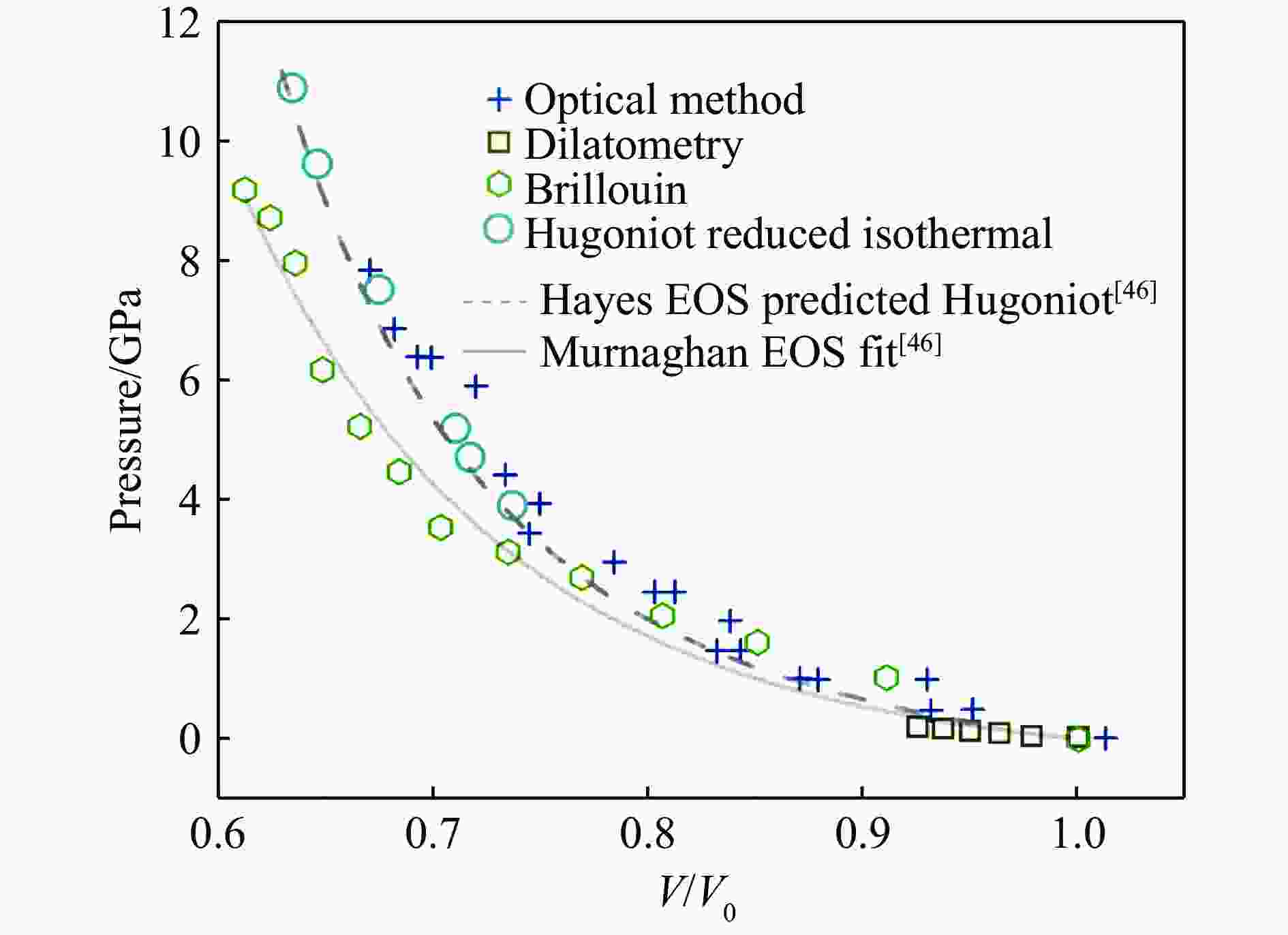 图 6 不同方法测量的VCE的状态方程[46](即使在12 GPa较低的压力范围内,不同方法测量的VCE的状态方程表现出很大的差异,实验数据的分散性很大)
