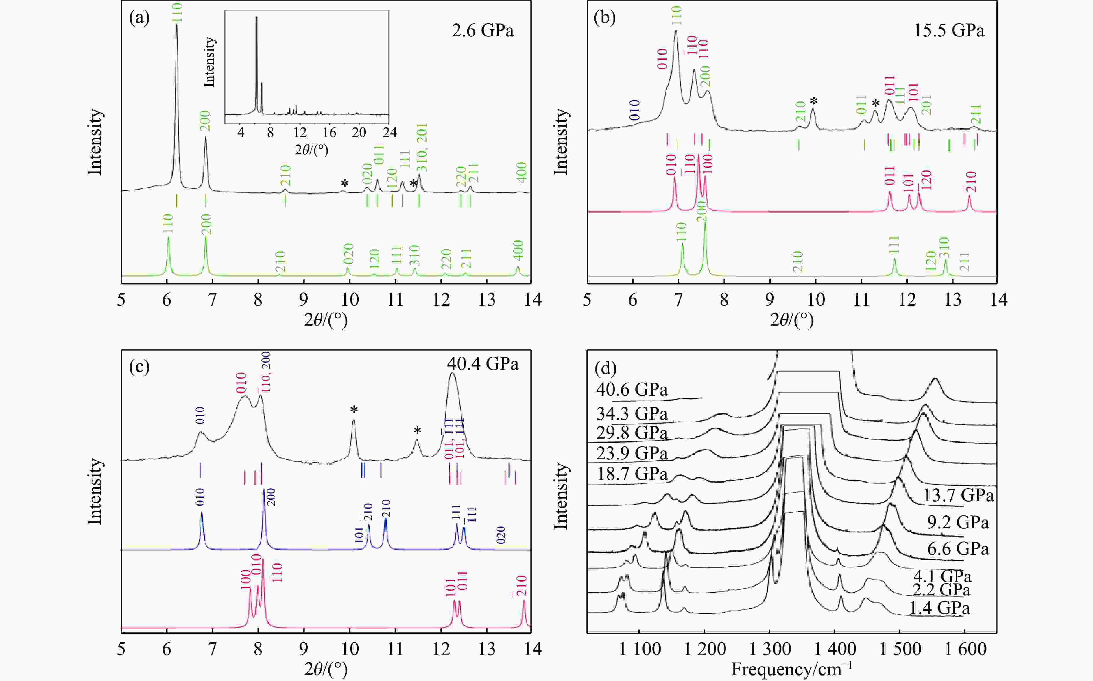 1340 cm−1附近的强峰是金刚石的拉曼峰)Figure 7. (a)–(c) Typical X-ray diffraction spectra of PE at high pressures[47] (The green, red and blue spectra are the ab initio simulated patterns of the orthorhombic Pnma, monoclinic P21/m, and the monoclinic A2/m structures, respectively.); (d) Raman spectra of PE at selected pressures[48] (The broad and strong peak at about