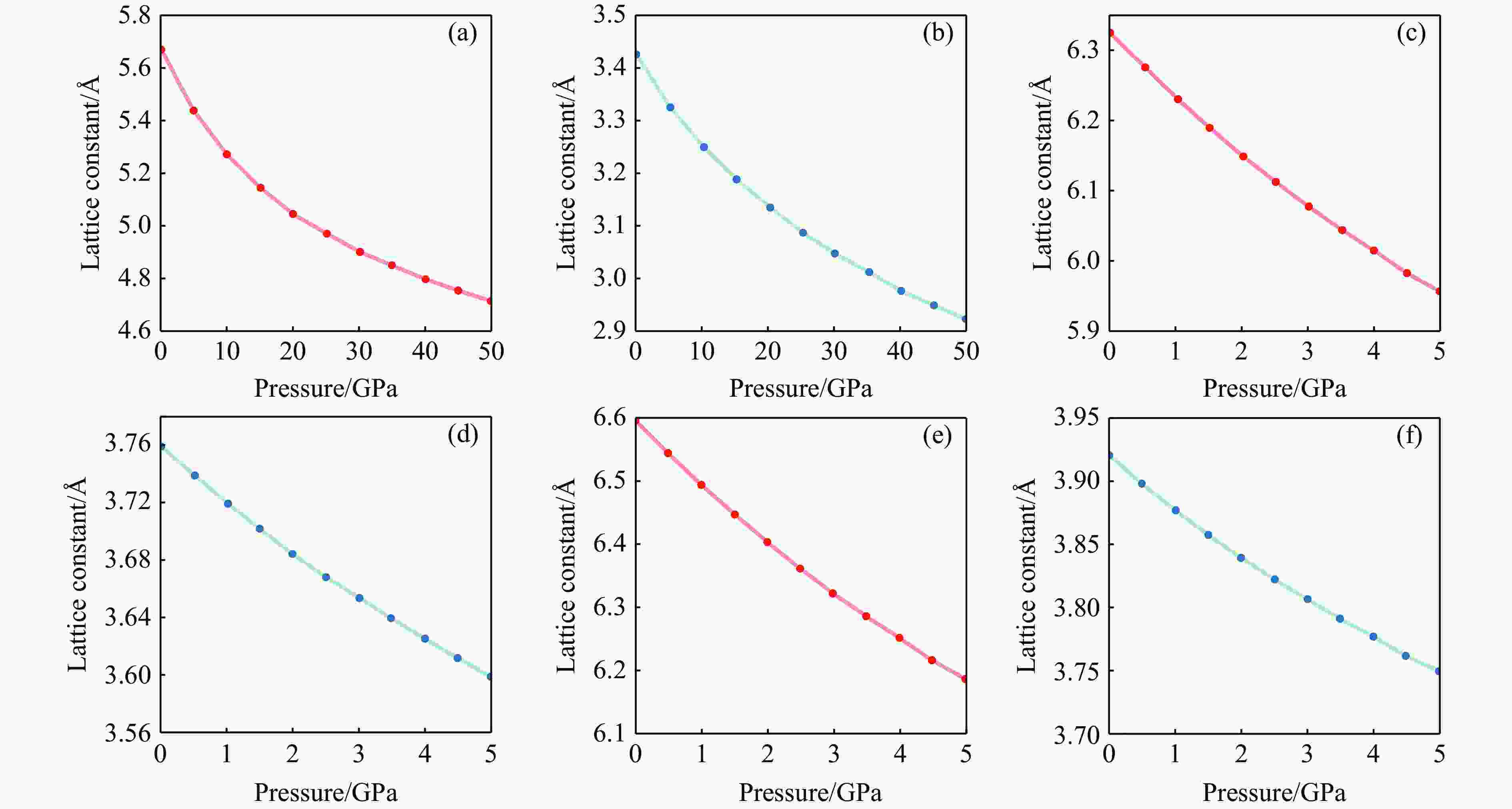Figure 3. Lattice parameter a changes for six structures under pressure: (a) NaCl phase Ⅰ at 0−50 GPa; (b) NaCl phase Ⅱ at 0−50 GPa; (c) KCl phase Ⅰ at 0−5 GPa; (d) KCl phase Ⅱ at 0−5 GPa; (e) KBr phase Ⅰ at 0−5 GPa; (f) KBr phase Ⅱ at 0−5 GPa