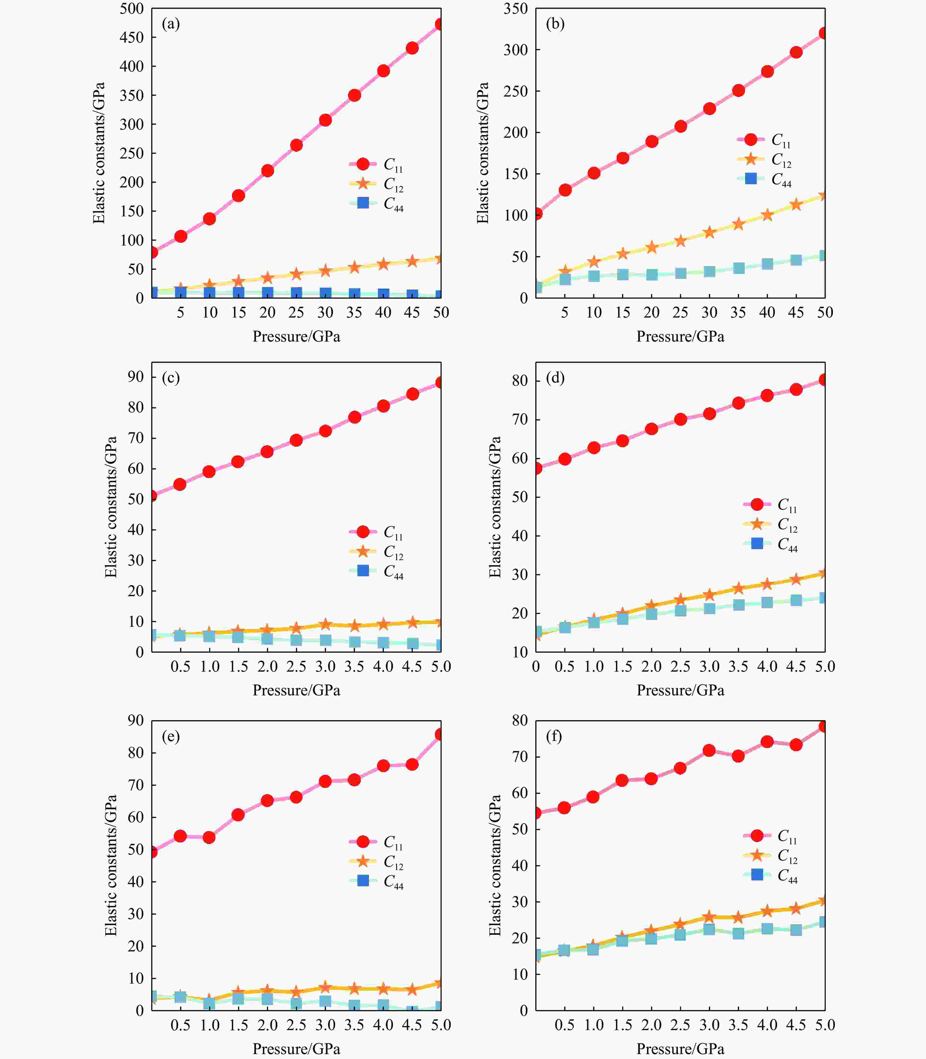 Figure 4. Independent elastic constants for six structures under pressure: (a) NaCl phase Ⅰ at 0−50 GPa; (b) NaCl phase Ⅱ at 0−50 GPa; (c) KCl phase Ⅰ at 0−5 GPa; (d) KCl phase Ⅱ at 0−5 GPa; (e) KBr phase Ⅰ at 0−5 GPa; (f) KBr phase Ⅱ at 0−5 GPa