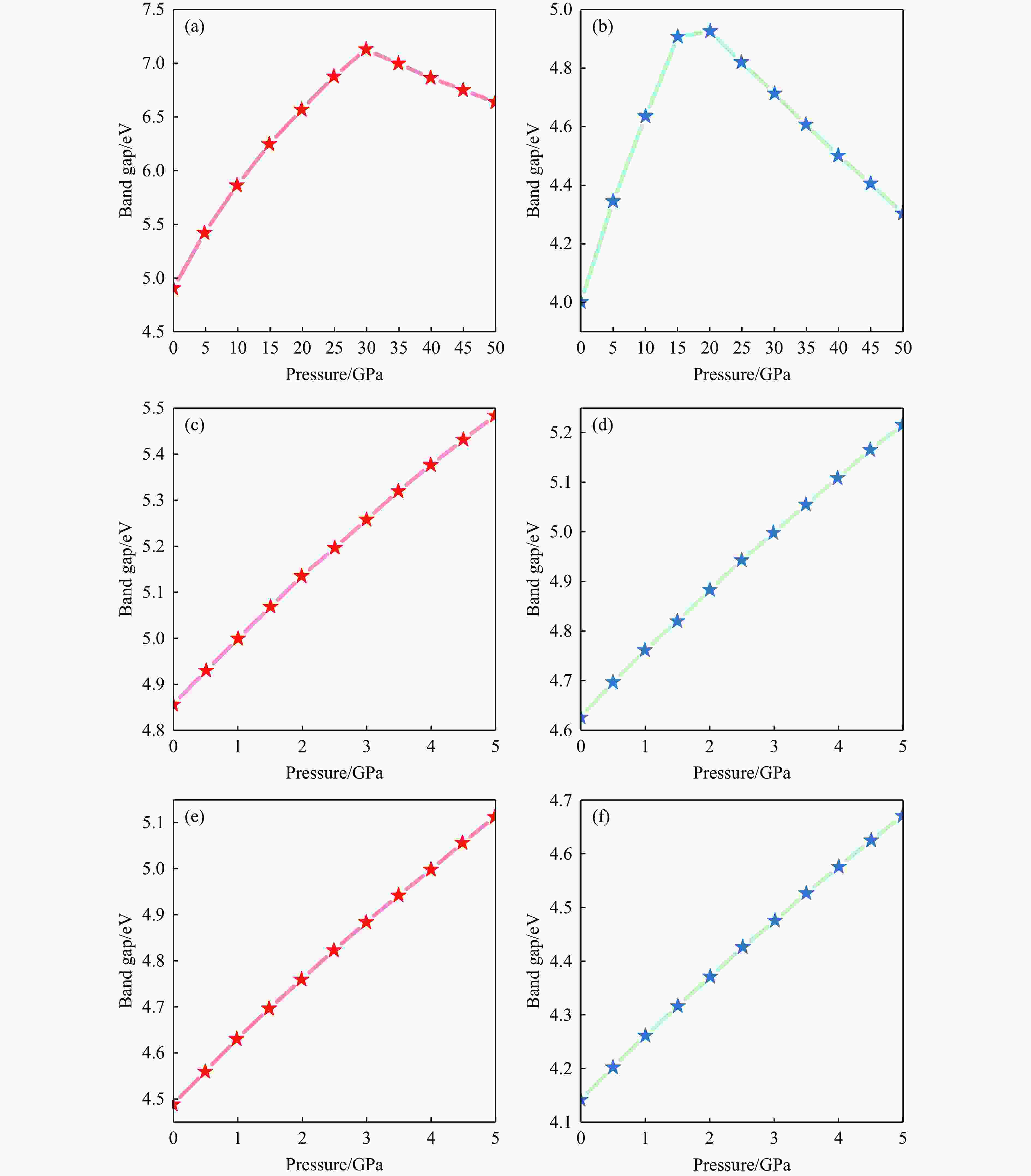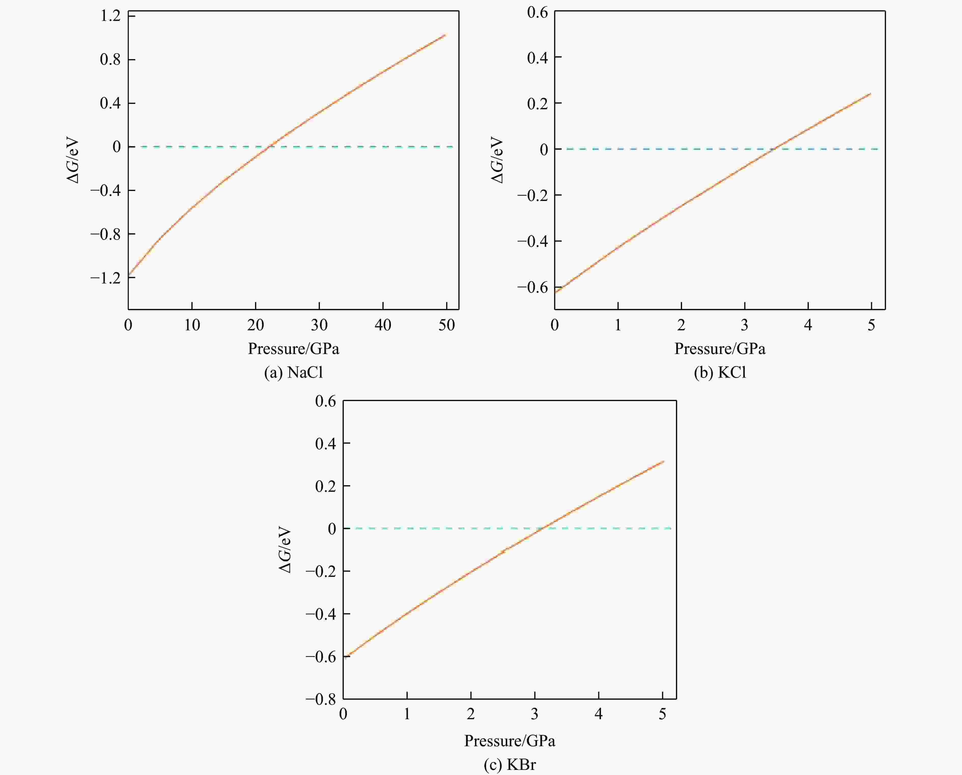 摘要: 基于密度泛函理论的第一性原理计算方法,研究了NaCl、KCl和KBr晶体在不同压力下相Ⅰ和相Ⅱ构型的几何、电子和力学性质,探讨了这些性质与相变点之间的关系,利用吉布斯自由能法对NaCl、KCl与KBr晶体的相变点进行判断。结果显示,对于NaCl的相Ⅰ结构,在0~30 GPa压力范围内,随着压力的升高,带隙不断增大;在30~50 GPa压力范围内,带隙随着压力的升高而下降,30 GPa正位于NaCl相Ⅰ结构的相变点。这表明根据电子结构判断金属卤化物在压力作用下的相变点具有一定的可行性。由高压下的晶体结构、声子谱以及力学稳定性无法对碱金属卤化物的相变点进行判断。通过吉布斯自由能法计算出了NaCl、KCl和KBr的相变点,分别为22.26、3.47和3.11 GPa。Abstract: Utilizing first-principles calculations based on density functional theory, this study investigates the geometric, electronic, and mechanical properties of NaCl, KCl, and KBr crystals in phase Ⅰ and phase Ⅱ structures under varying pressures. The relationships between these properties and the phase transition points are explored. Additionally, the Gibbs free energy method was employed to judge the phase transition points of NaCl, KCl, and KBr crystals. The results show that in the phase Ⅰ structure of NaCl, the band gap value increases with pressure from 0 to 30 GPa. However, in the range of 30−50 GPa, the band gap value decreases, indicating that 30 GPa is the phase transition point for NaCl phase Ⅰ. This suggests that pressure-induced changes in electronic structure can be indicative of metal halide phase transition points to some extent. However, pressure-induced alterations in crystal structure, phonon spectrum, and mechanical stability cannot reliably indicate alkali metal halide phase transition points. Furthermore, the phase transition points for NaCl, KCl and KBr calculated by Gibbs free energy method are 22.26, 3.47 and 3.11 GPa, respectively.