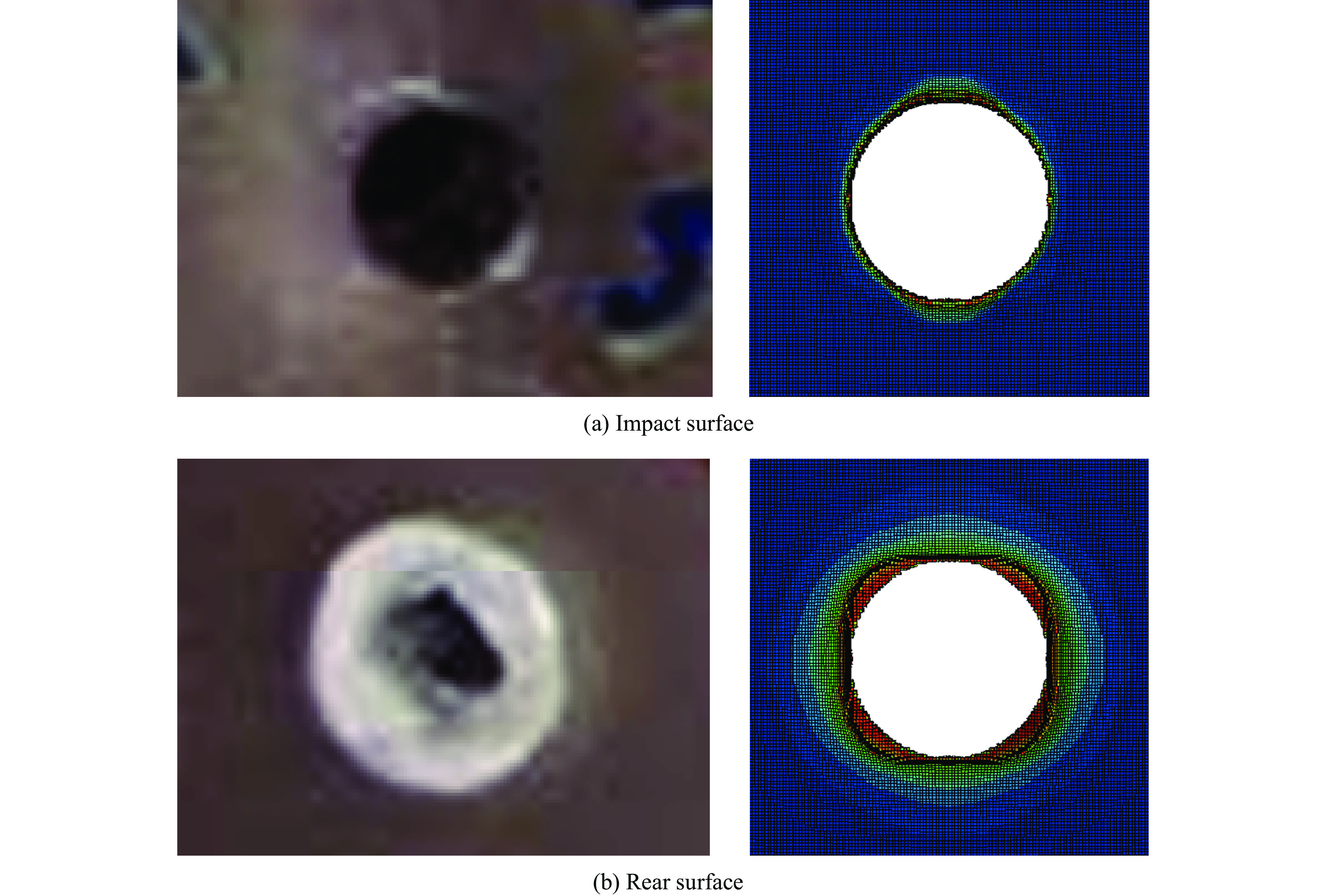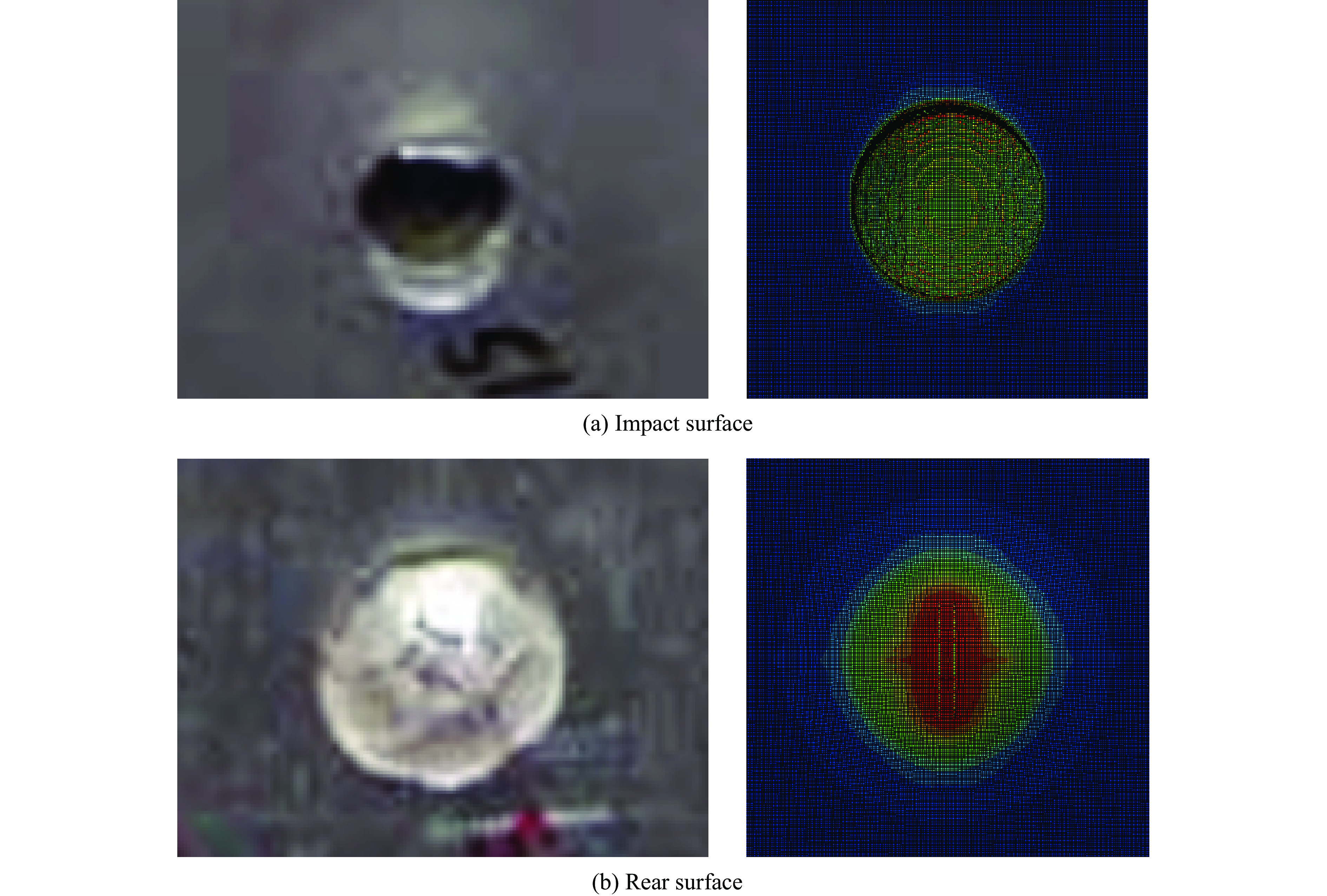 Figure  19.  Comparison of numerical predicted failure pattern with the test result[32] for 38 mm thick AZ31B magnesium alloy plate struck by 20 mm FSP bullet