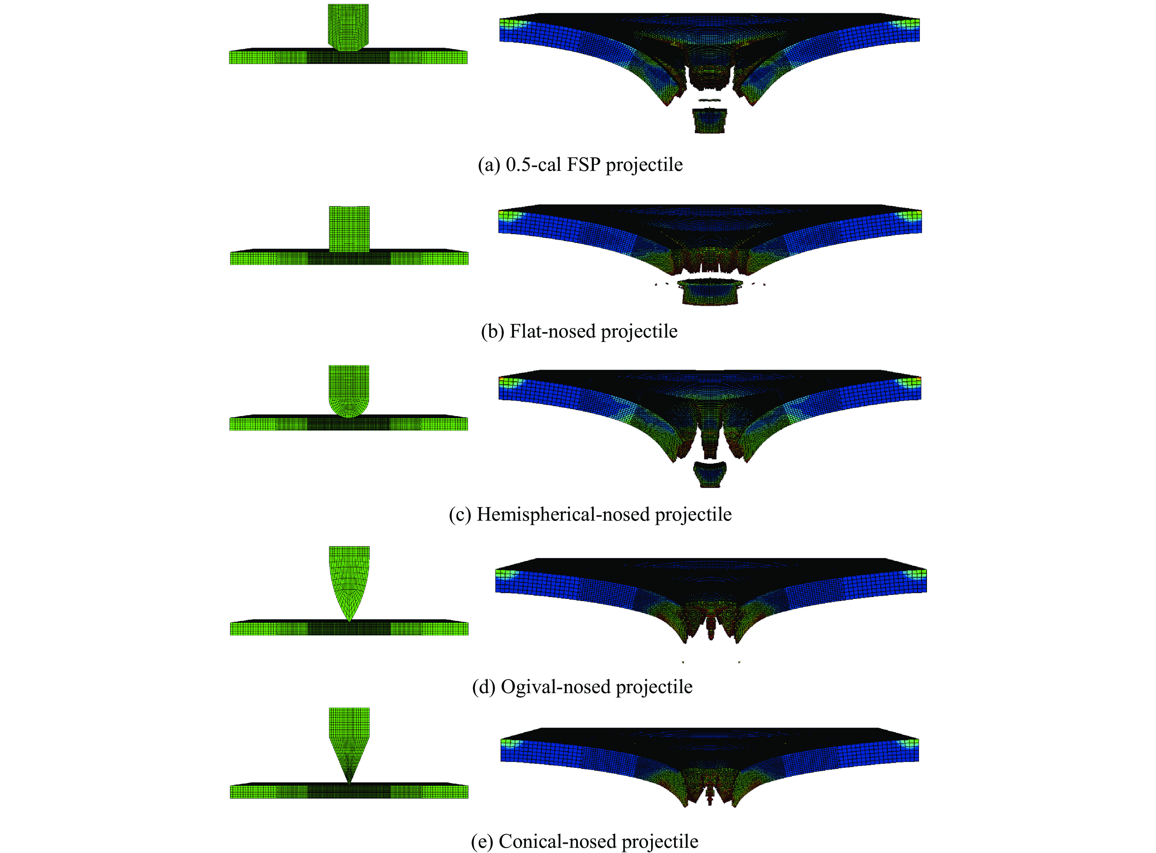 图  22  数值模拟预测的不同子弹撞击4 mm厚AZ31B镁合金靶板后靶板的破坏模式