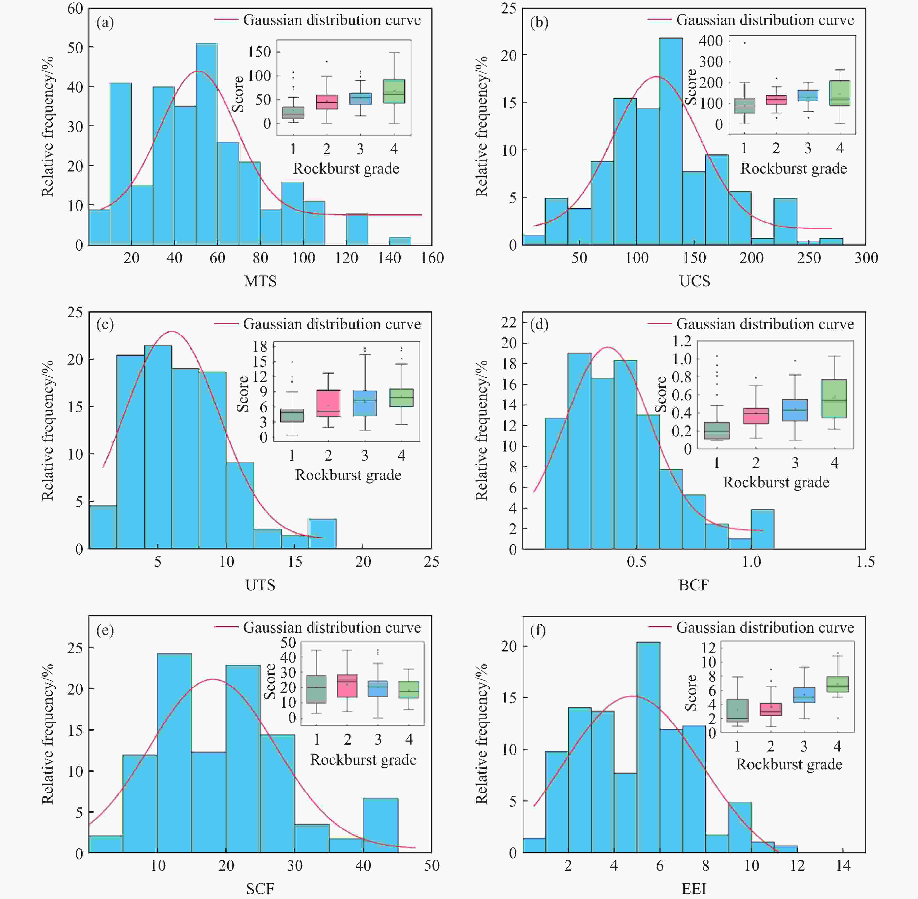 Items MTS/MPa UCS/MPa UTS/MPa BCF SCF EEI Mean value 51.93 118.52 6.56 0.42 20.18 4.67 Standard deviation 29.08 50.28 3.62 0.23 9.94 2.29 Minimum value 2.60 18.23 0.38 0.10 0.15 0.85 Lower quartile 30.79 88.65 4.05 0.27 13.11 2.98 Median 50.05 120.00 6.30 0.40 18.96 5.00 Upper quartile 66.87 150.43 8.92 0.55 25.22 6.43 Maximum value 148.81 260.64 17.68 1.03 44.70 11.28 表 3 各指标间的相关性系数