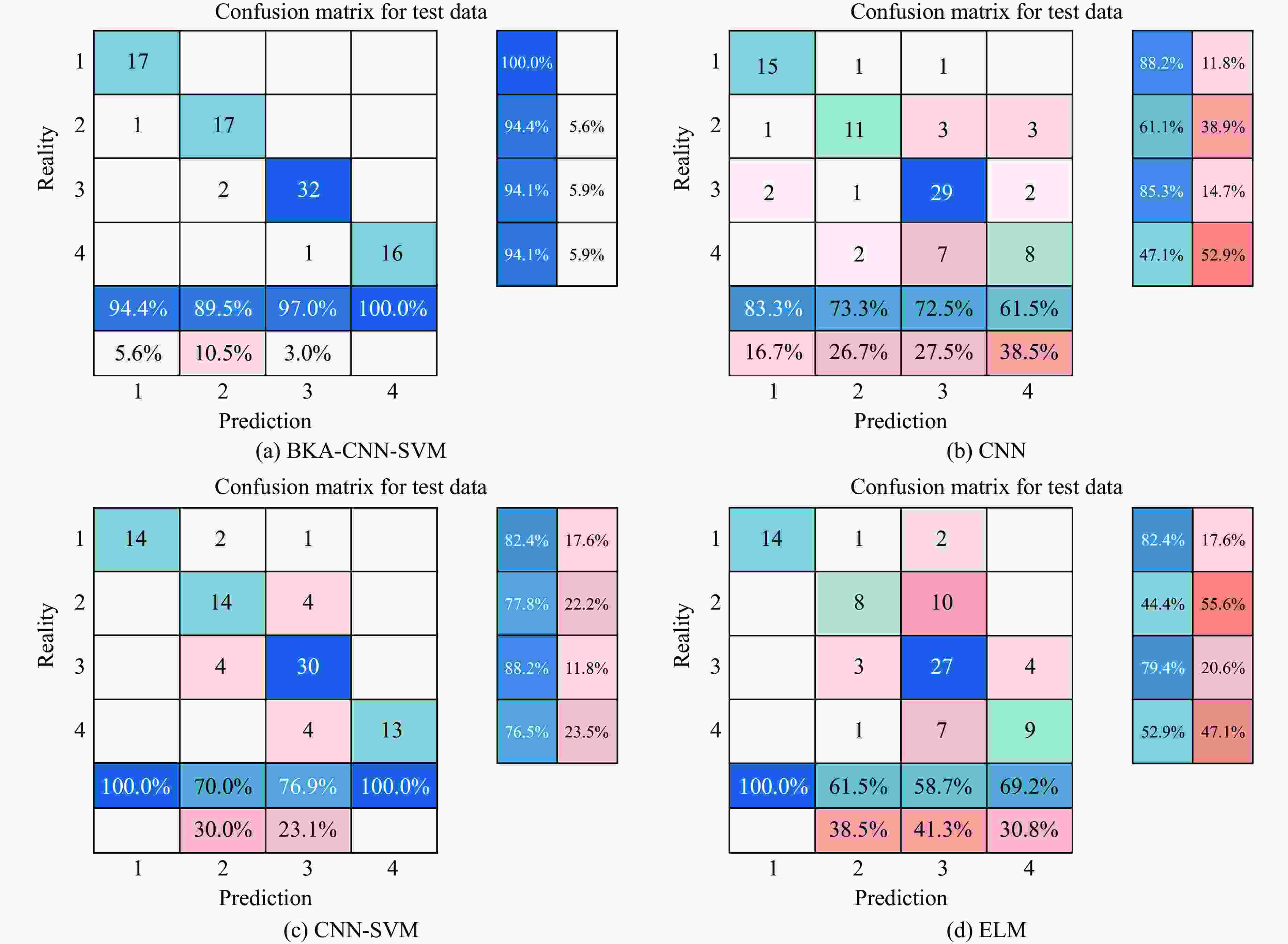 Test set classification accuracy/% Precision BKA-CNN-SVM CNN CNN-SVM ELM BKA-CNN-SVM CNN CNN-SVM ELM 95.35 73.26 82.56 67.44 0.89 0.73 0.70 0.61 F1 score Recall BKA-CNN-SVM CNN CNN-SVM ELM BKA-CNN-SVM CNN CNN-SVM ELM 0.92 0.67 0.74 0.52 0.94 0.61 0.78 0.44 表 7 不同模型得到的岩爆烈度预测结果