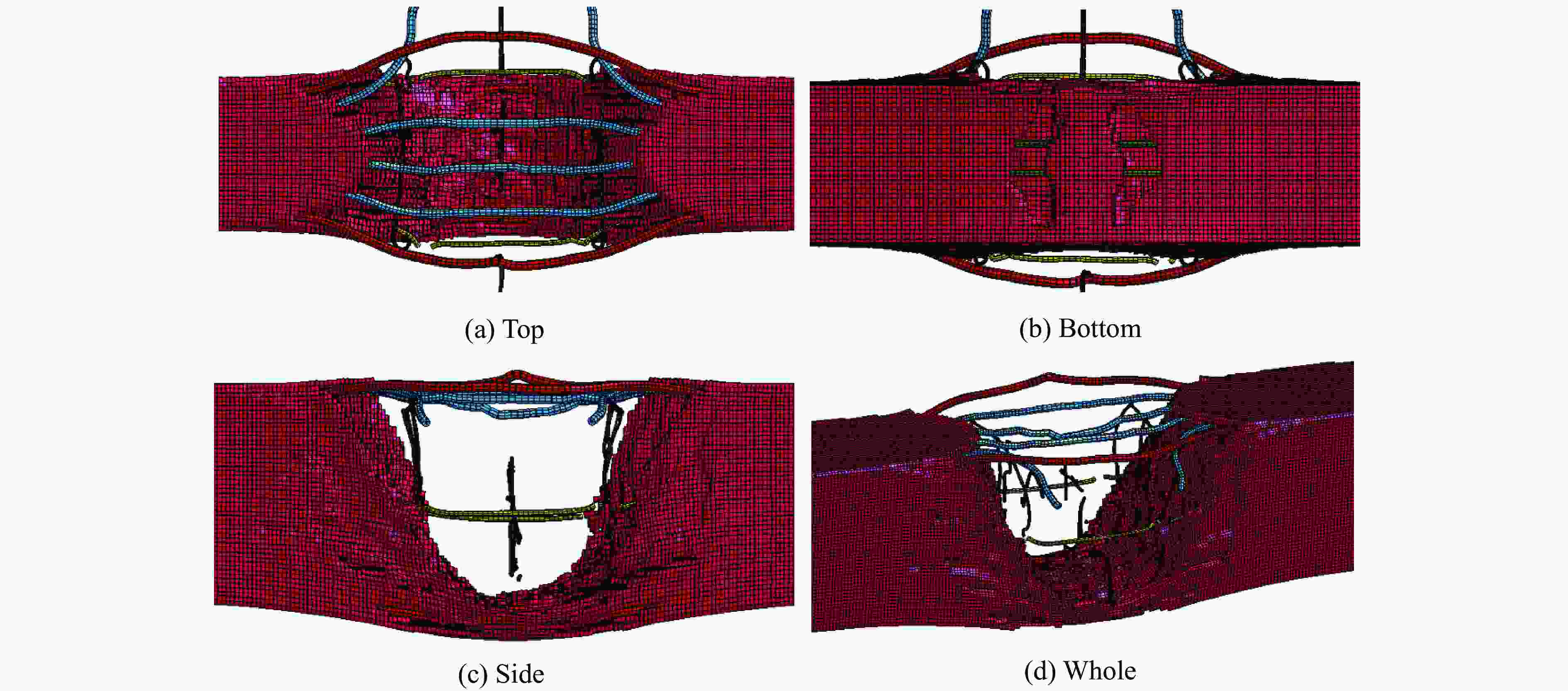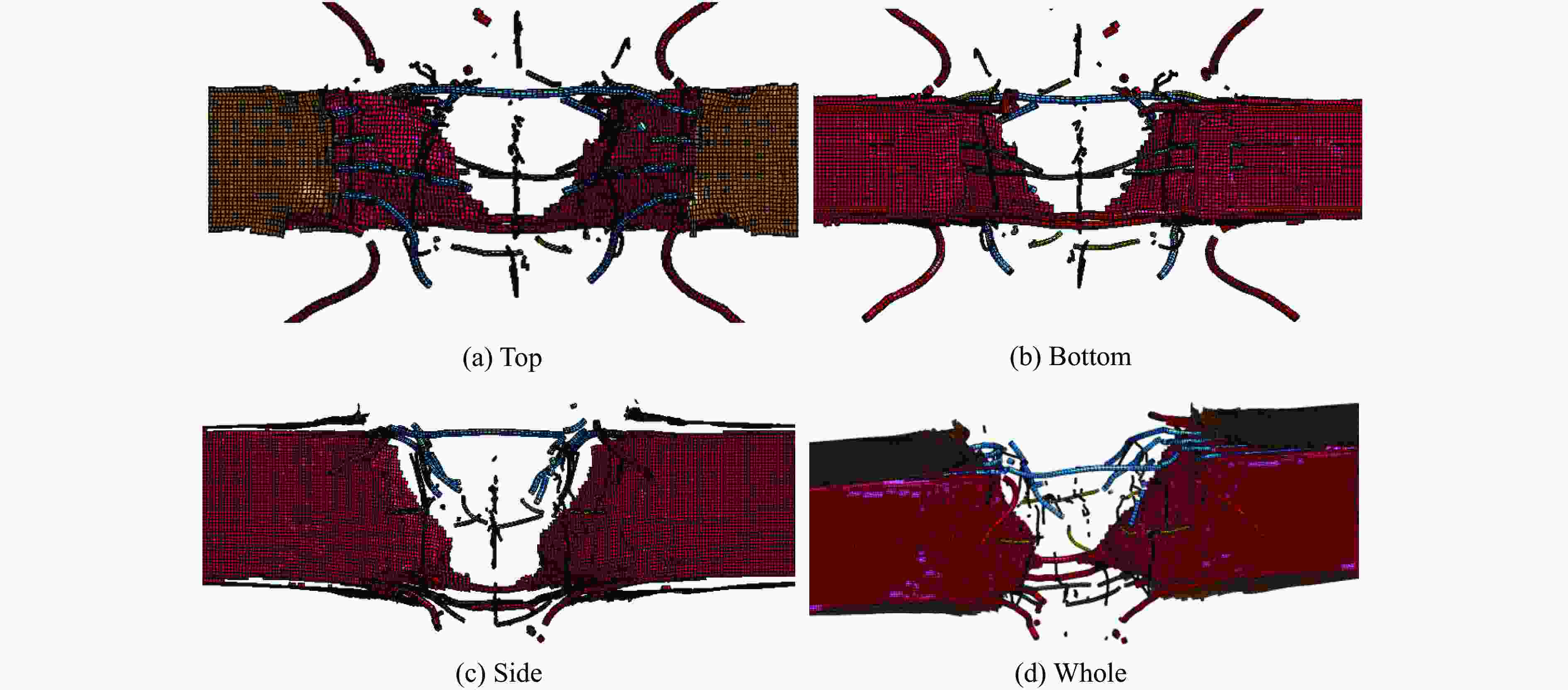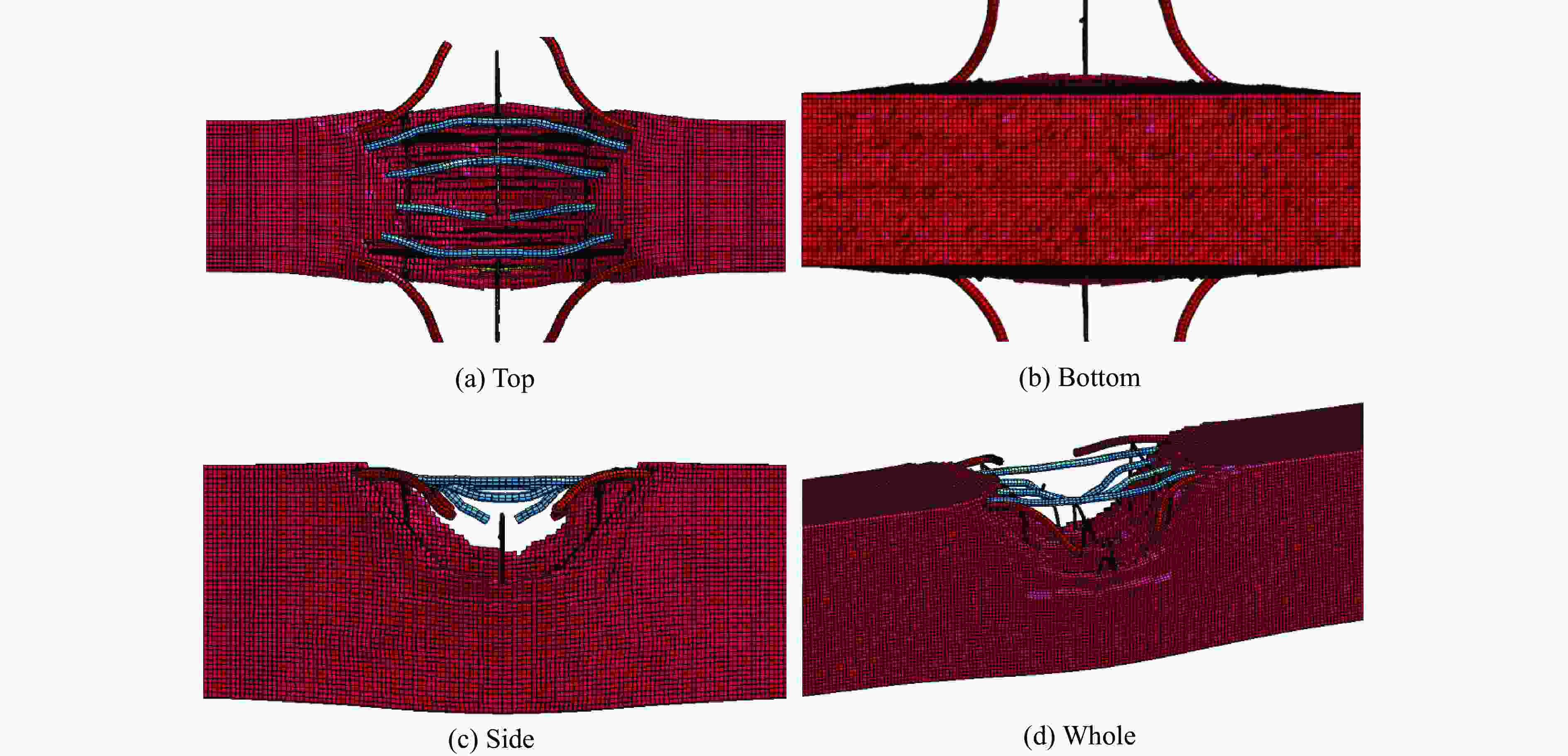 摘要: 为得到接触爆炸下聚脲(polyisocyanate-oxazodone,POZD)涂覆钢筋混凝土梁的抗爆性能,对同一尺寸的钢筋混凝土梁开展了数值模拟研究。采用HyperMesh和LS-DYNA软件建立POZD涂覆钢筋混凝土梁模型,开展了接触爆炸下POZD涂覆钢筋混凝土梁的破坏模式和毁伤效应分析。对普通钢筋混凝土梁在接触爆炸下的破坏模式进行了模拟验证试验,研究了钢筋混凝土梁结构在不同POZD涂层位置和不同装药量条件下的破坏模式和毁伤情况,并对不同POZD涂覆位置的防护效果进行了评估,最后,将接触爆炸下POZD涂覆钢筋混凝土梁划分为3个局部毁伤等级。Abstract: In order to obtain the anti-blast performance of polyisocyanate-oxazodone (POZD) coated reinforced concrete beams under contact explosion, numerical simulation studies were carried out on reinforced concrete beams of the same size. Hypemesh and LS-DYNA were used to establish the model of POZD-coated reinforced concrete beams, and the failure modes and damage effects of POZD-coated reinforced concrete beams under contact explosion were analyzed. The failure mode of ordinary reinforced concrete beams under contact explosion was simulated and verified, the failure modes and damage conditions of reinforced concrete beams under different POZD coating positions and different charge amounts were studied, and the protective effects of different POZD coating positions were evaluated.