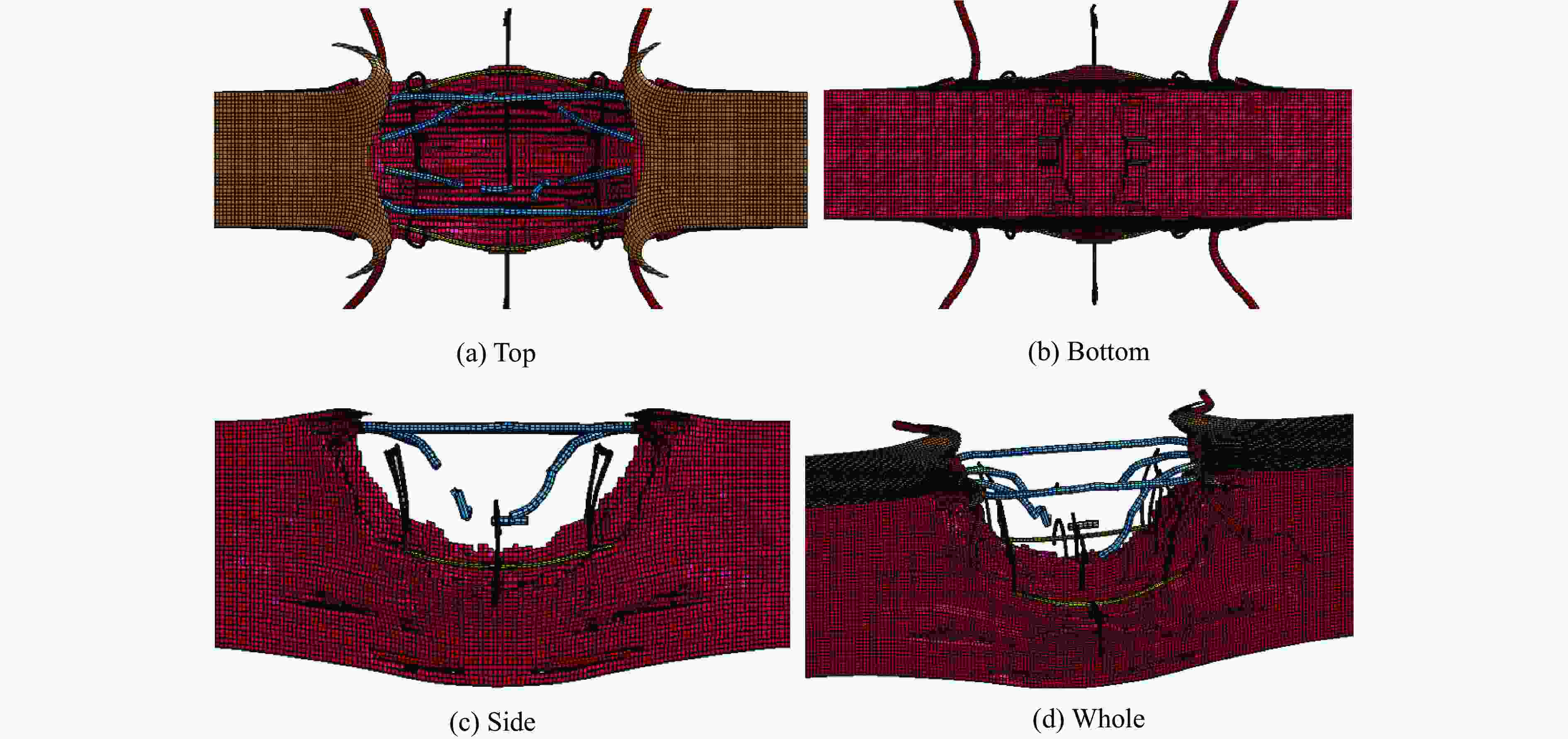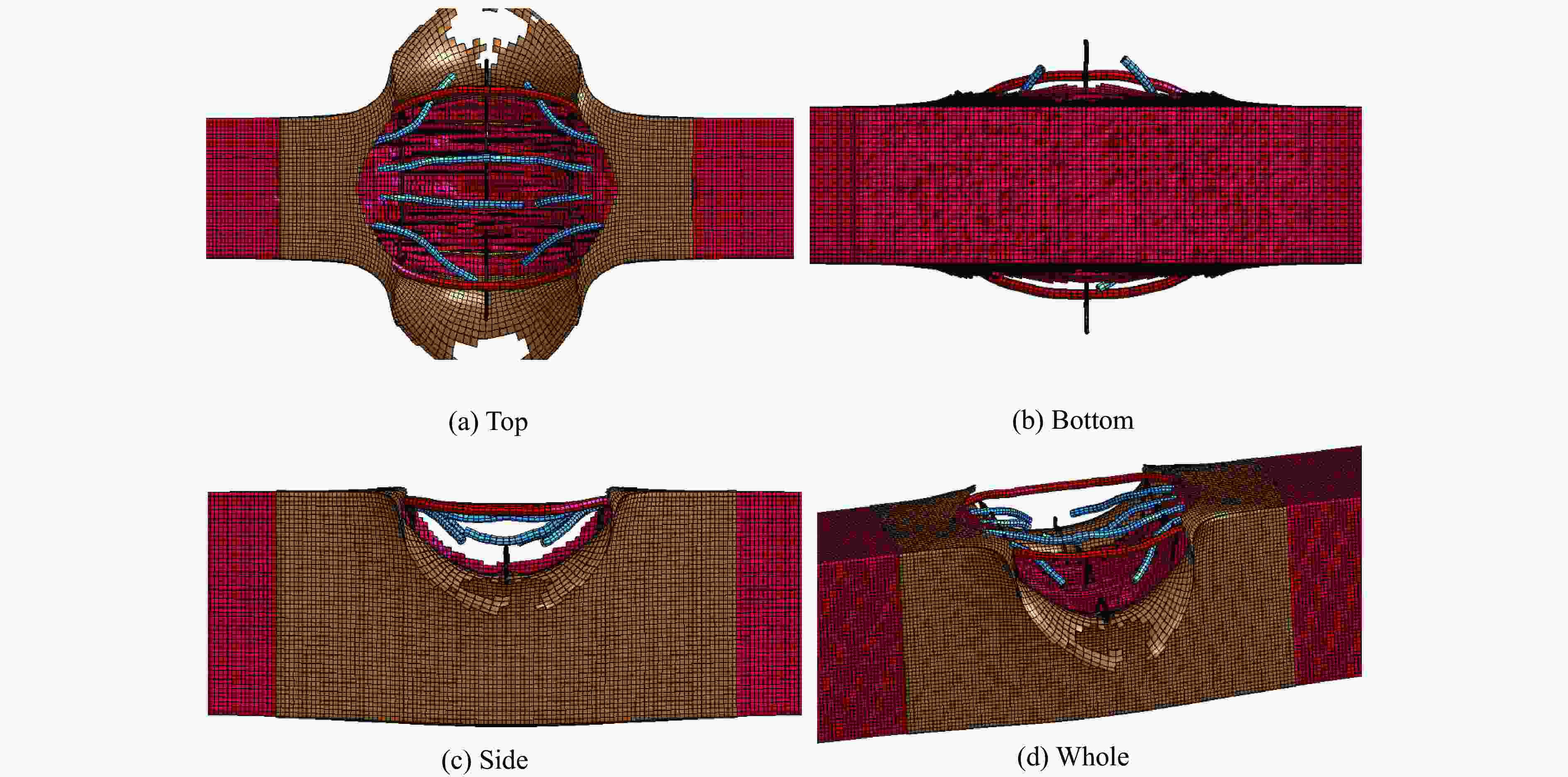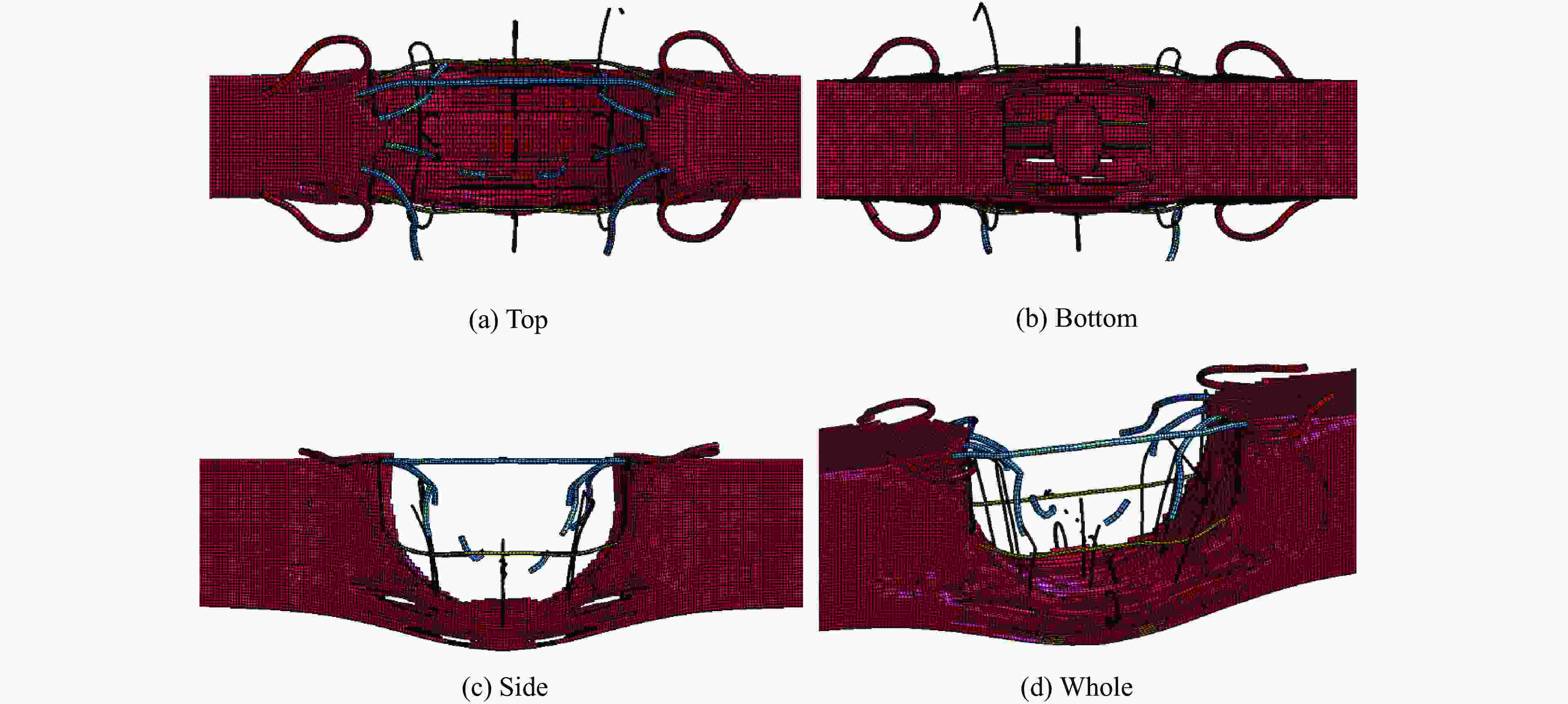 摘要: 为得到接触爆炸下聚脲(polyisocyanate-oxazodone,POZD)涂覆钢筋混凝土梁的抗爆性能,对同一尺寸的钢筋混凝土梁开展了数值模拟研究。采用HyperMesh和LS-DYNA软件建立POZD涂覆钢筋混凝土梁模型,开展了接触爆炸下POZD涂覆钢筋混凝土梁的破坏模式和毁伤效应分析。对普通钢筋混凝土梁在接触爆炸下的破坏模式进行了模拟验证试验,研究了钢筋混凝土梁结构在不同POZD涂层位置和不同装药量条件下的破坏模式和毁伤情况,并对不同POZD涂覆位置的防护效果进行了评估,最后,将接触爆炸下POZD涂覆钢筋混凝土梁划分为3个局部毁伤等级。Abstract: In order to obtain the anti-blast performance of polyisocyanate-oxazodone (POZD) coated reinforced concrete beams under contact explosion, numerical simulation studies were carried out on reinforced concrete beams of the same size. Hypemesh and LS-DYNA were used to establish the model of POZD-coated reinforced concrete beams, and the failure modes and damage effects of POZD-coated reinforced concrete beams under contact explosion were analyzed. The failure mode of ordinary reinforced concrete beams under contact explosion was simulated and verified, the failure modes and damage conditions of reinforced concrete beams under different POZD coating positions and different charge amounts were studied, and the protective effects of different POZD coating positions were evaluated.