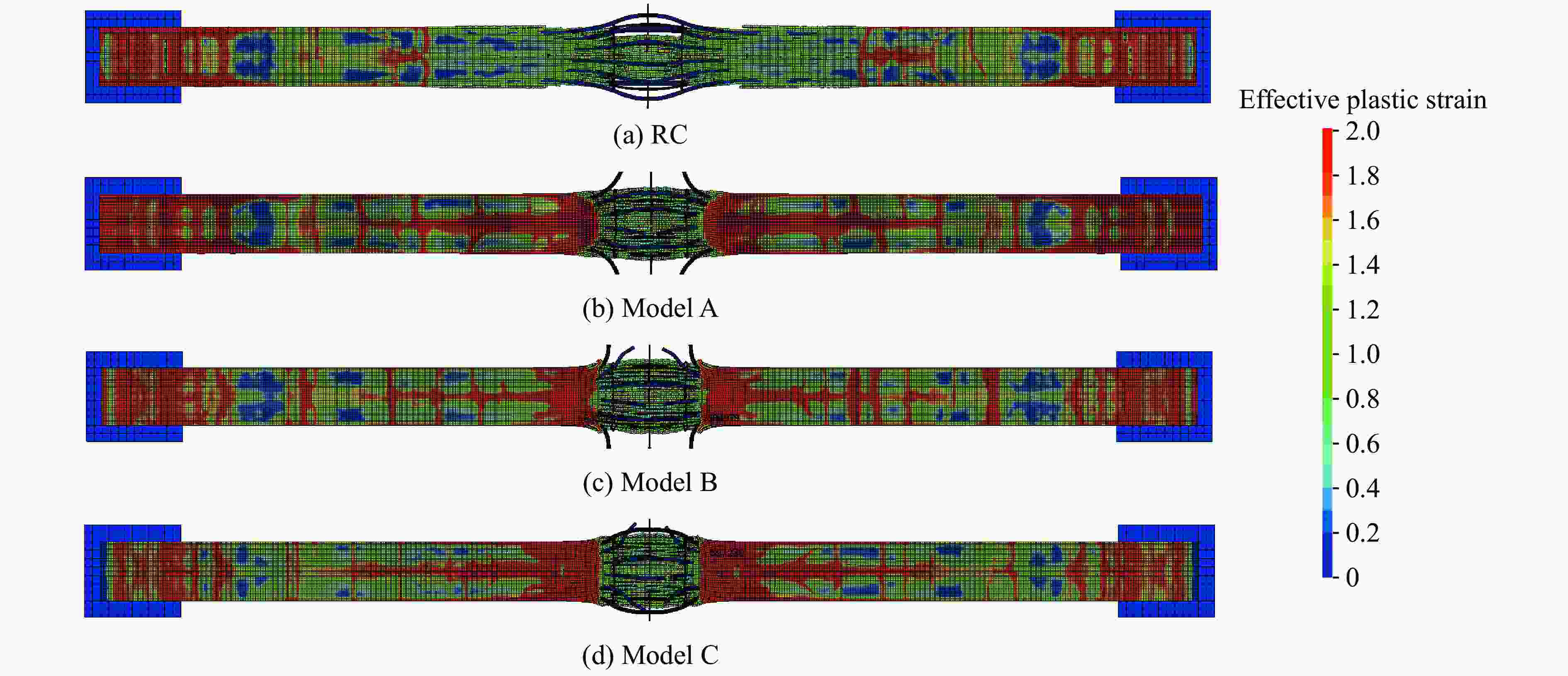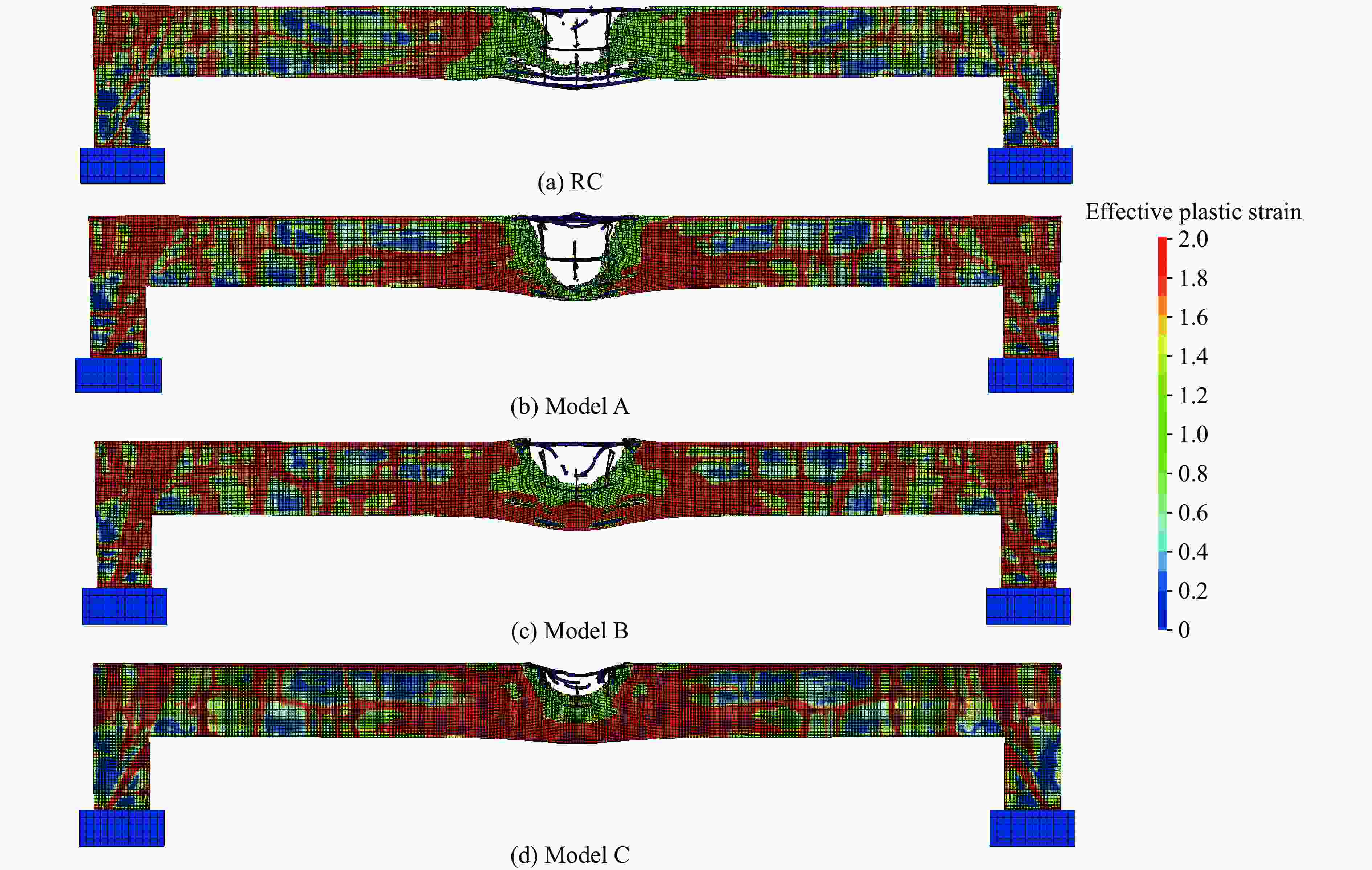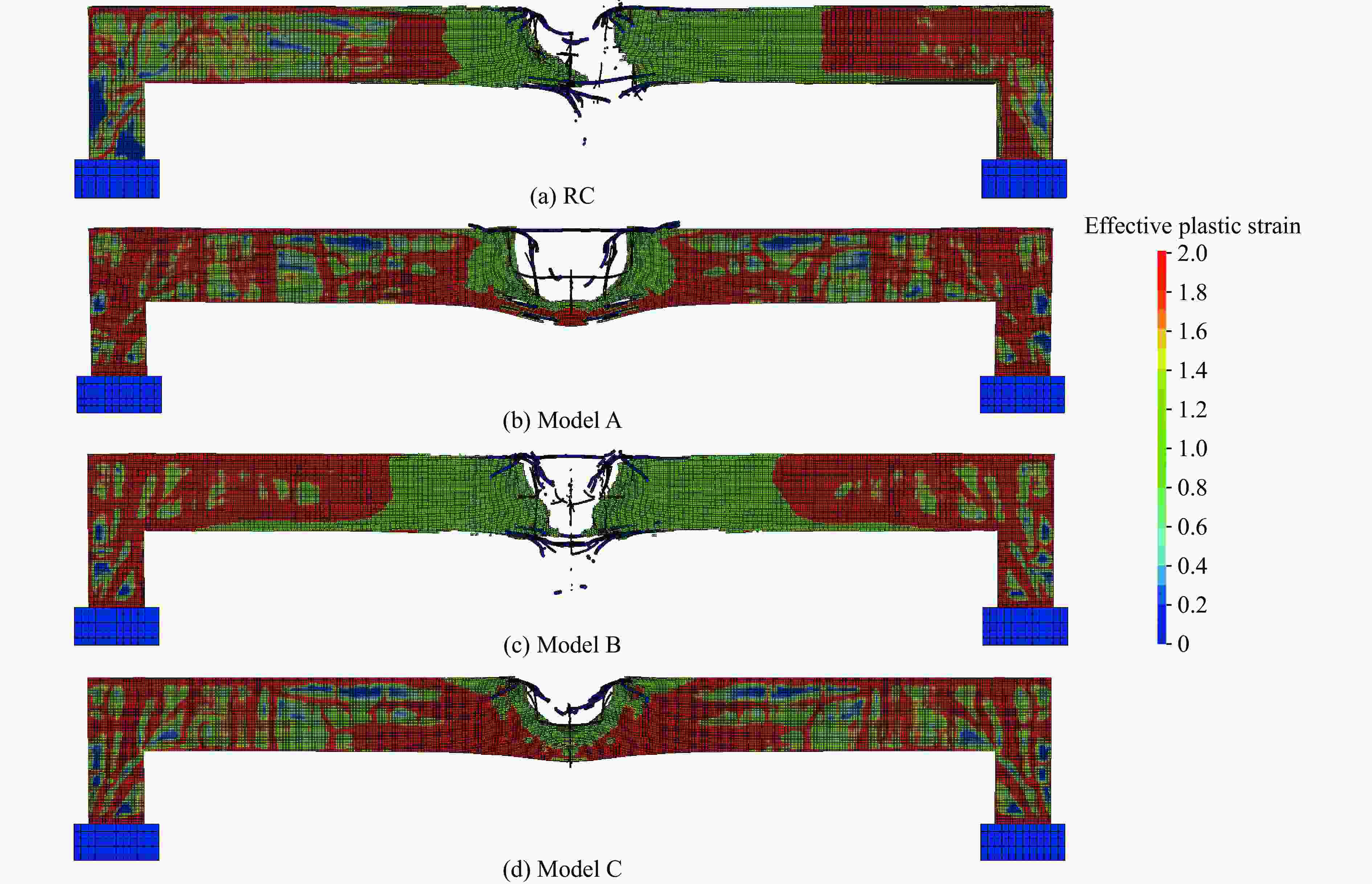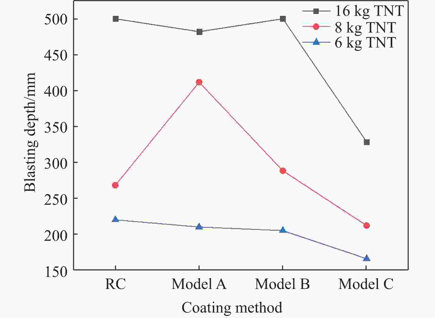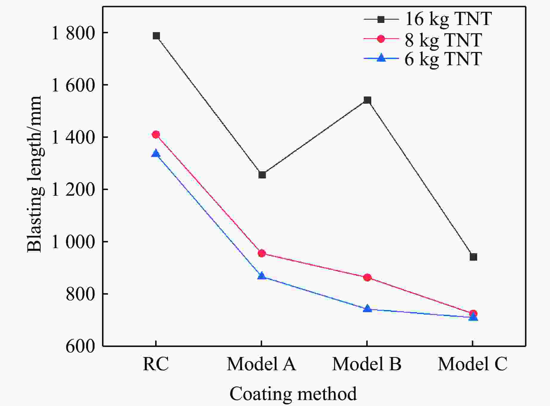 Model Failure length of front surface/mm Failure length of back surface/mm Depth of crater/mm RC 1412 1628 269 A 957 Less peeling 412 B 865 Less peeling 289 C 726 Good 213 表 10 16 kg TNT工况下迎爆面和背爆面的数值模拟结果