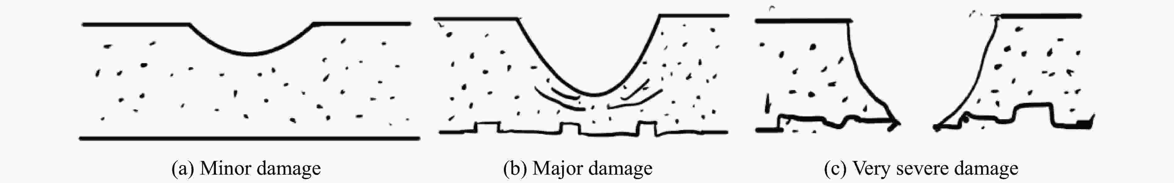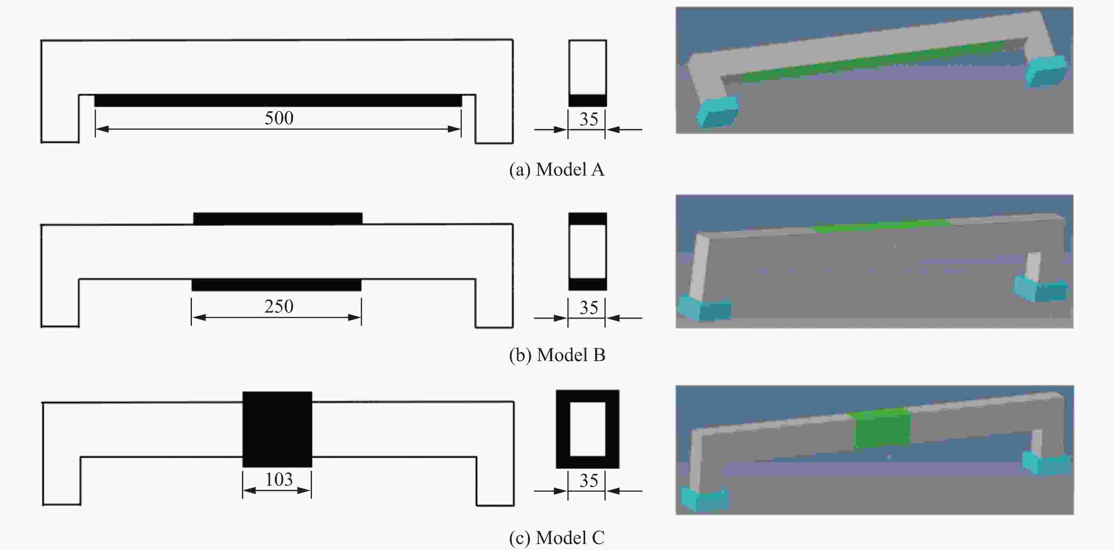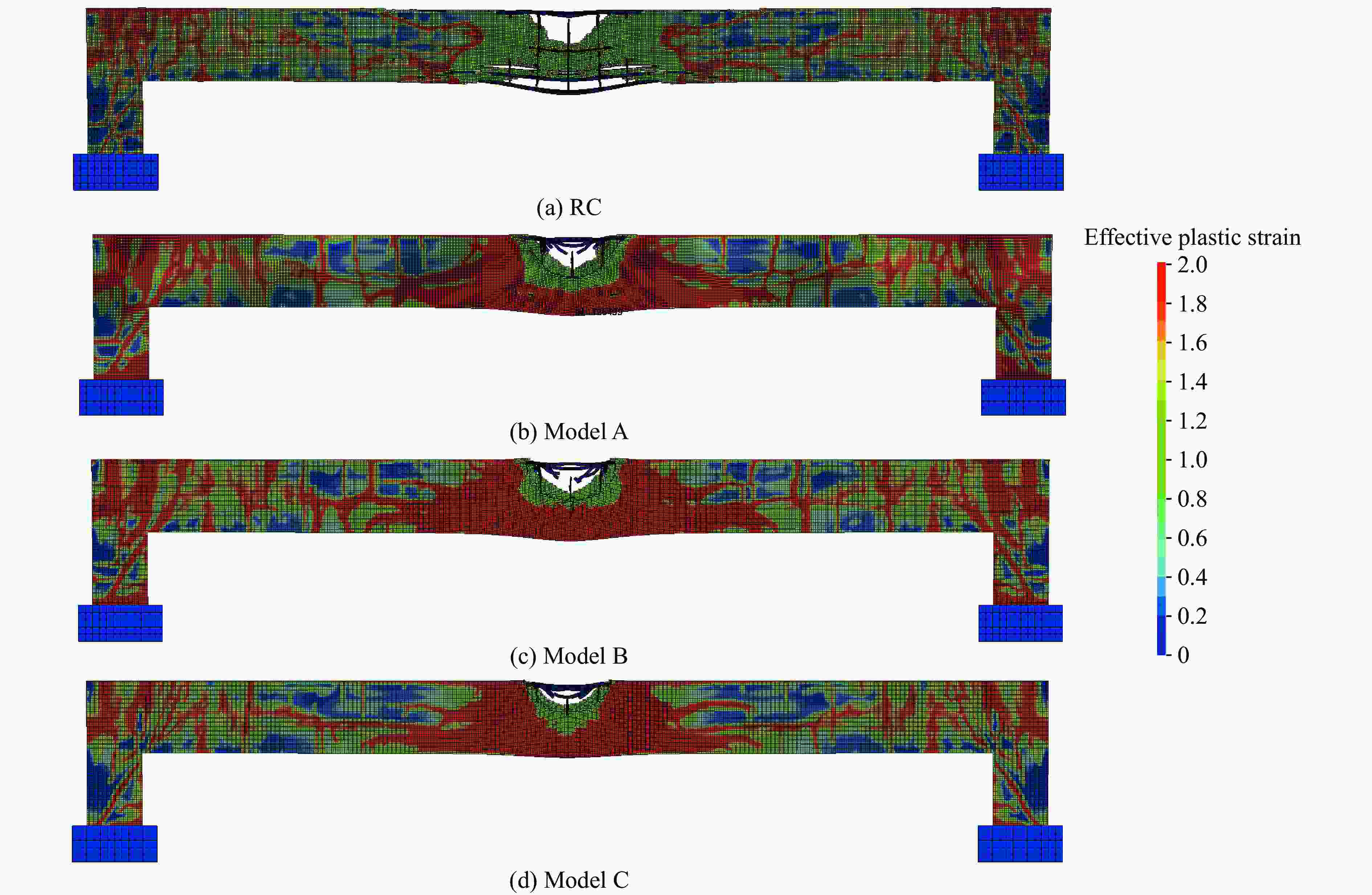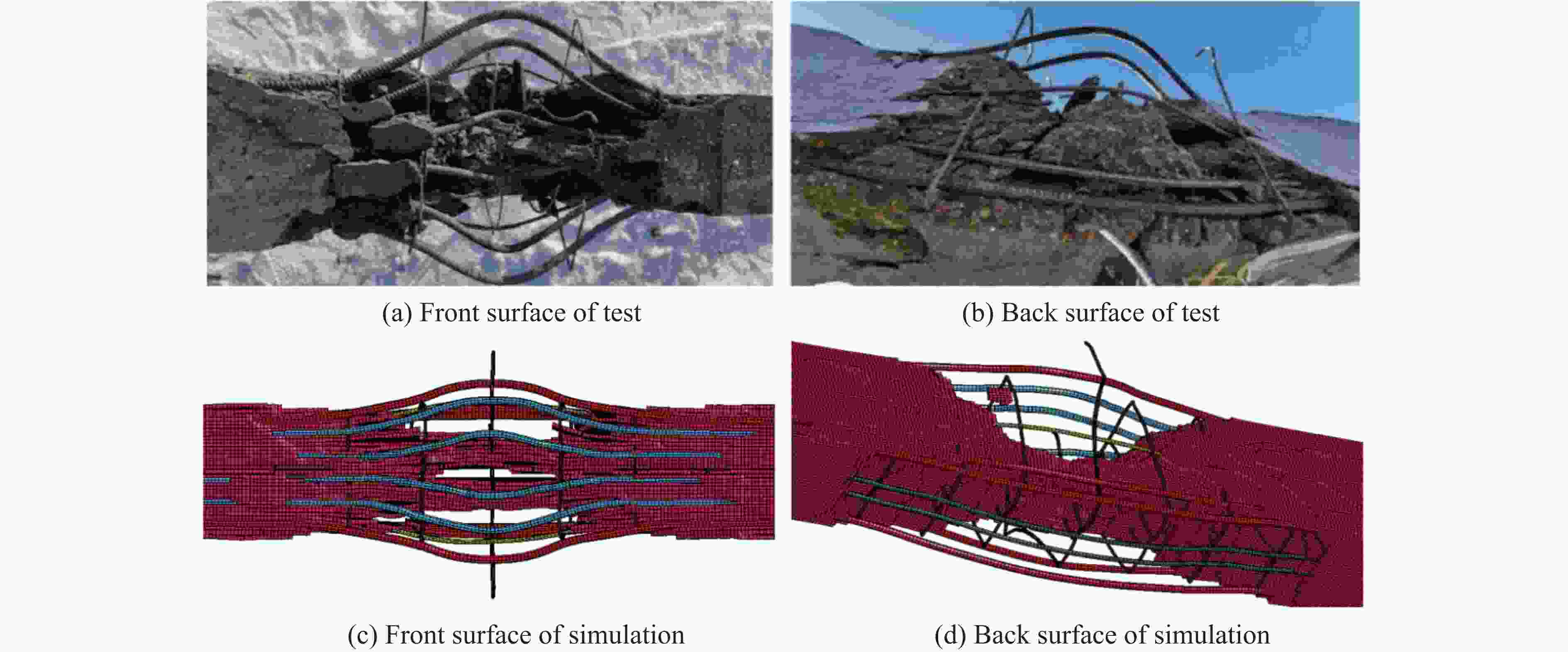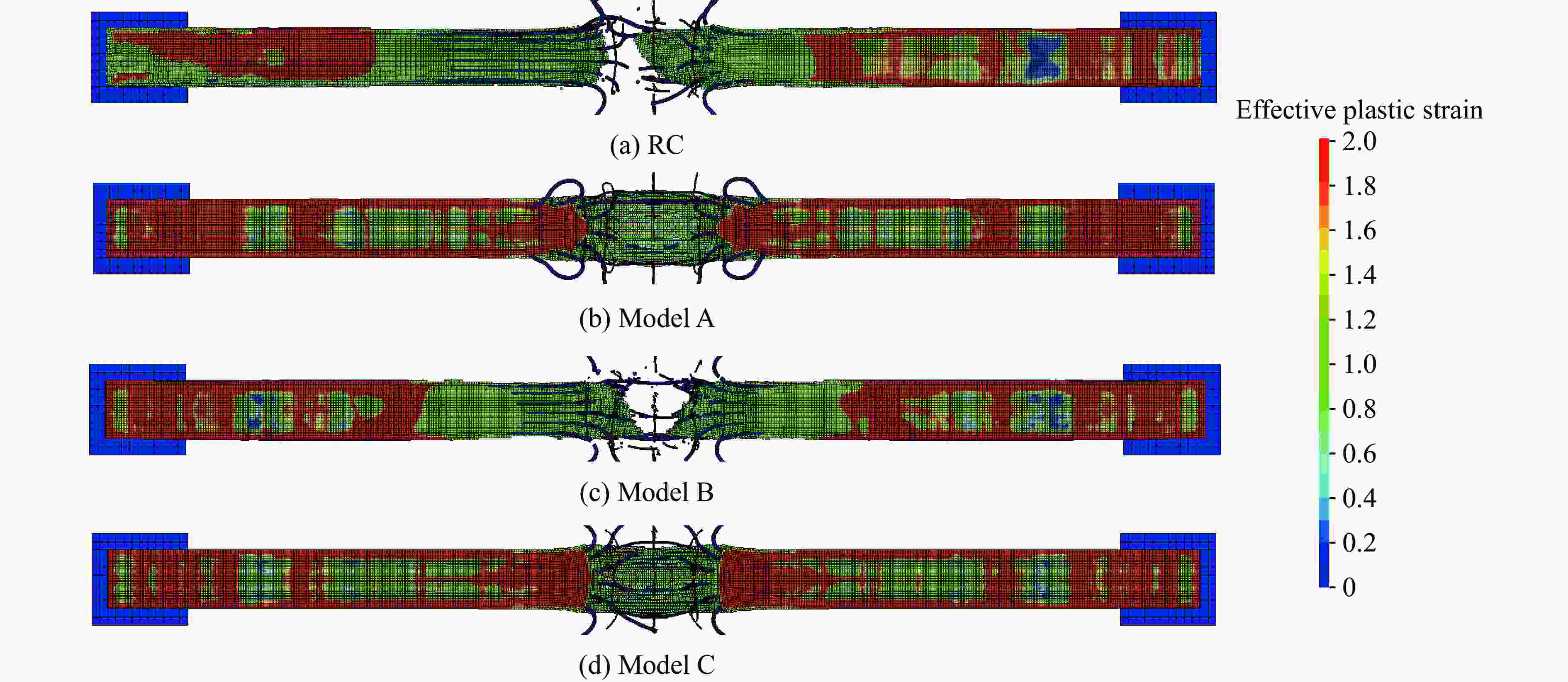Model Failure length of front surface/mm Failure length of back surface/mm Depth of crater/mm RC 1412 1628 269 A 957 Less peeling 412 B 865 Less peeling 289 C 726 Good 213 表 10 16 kg TNT工况下迎爆面和背爆面的数值模拟结果